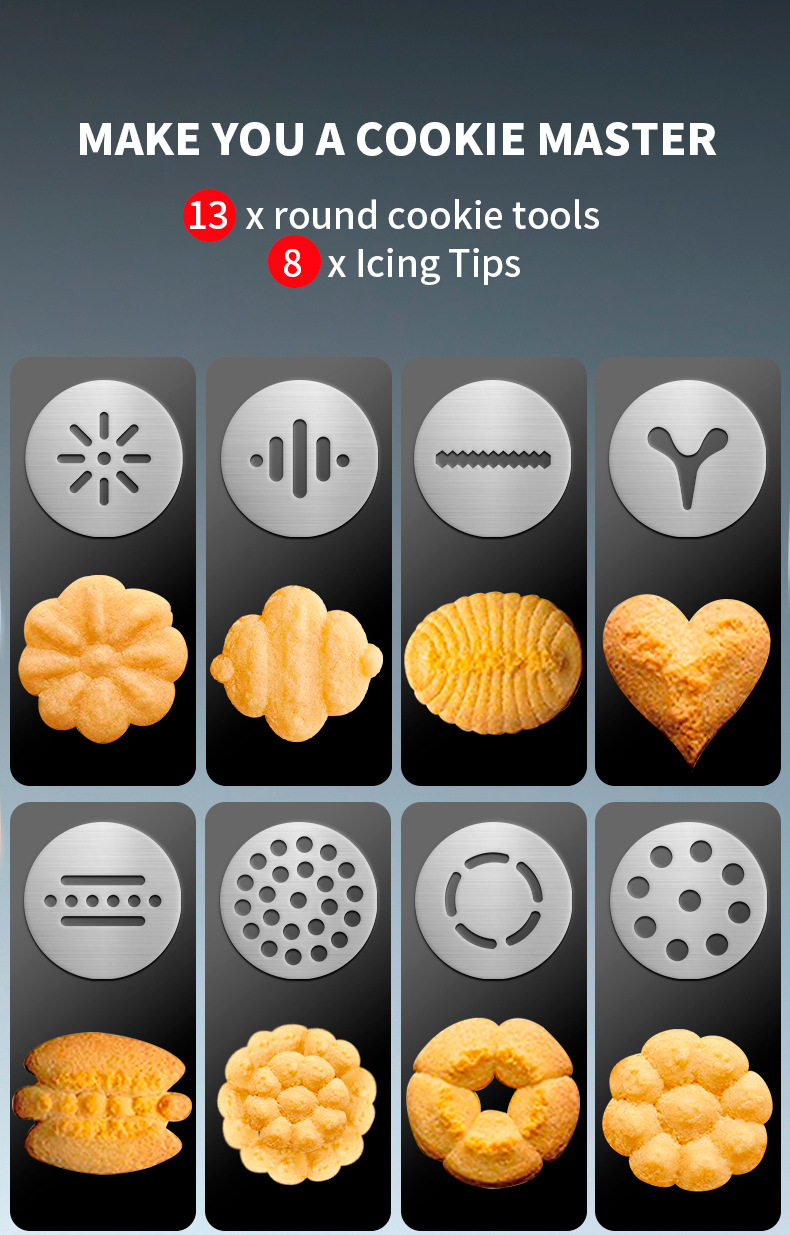 - Complete Baking & Decorating Set: Includes 1 durable cookie press gun, 13 interchangeable cookie discs for a variety of fun shapes, and 8 stainless steel icing nozzles for intricate decorating. Create everything from classic spritz cookies to beautifully piped desserts.