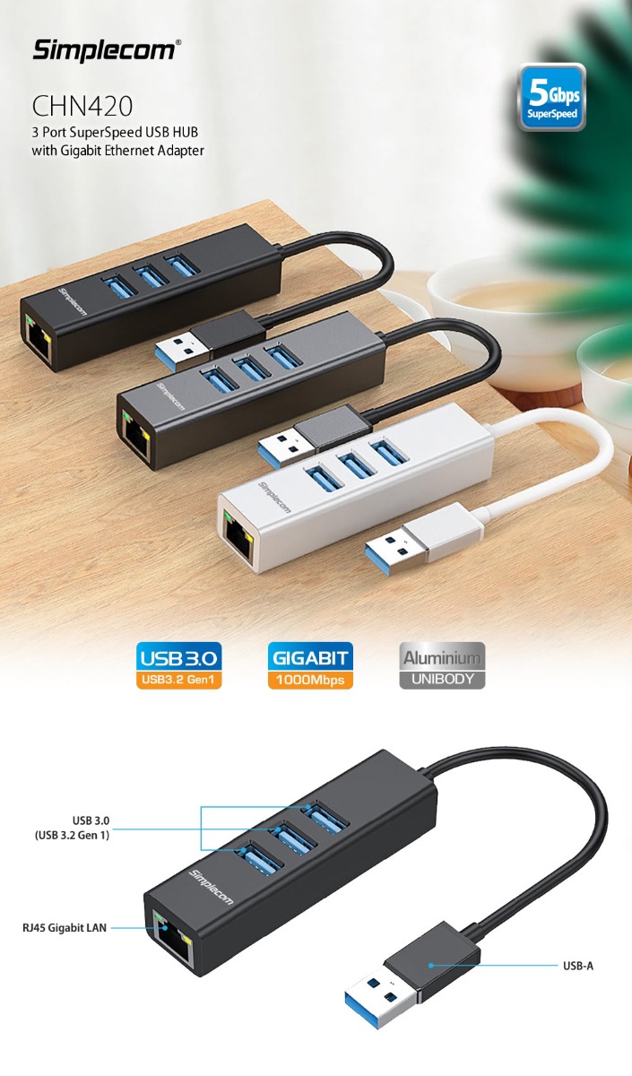 CHN420 is sturdy and durable with premium aluminium body. Simple and easy to use with 3 USB ports on the top and an innovative built-in RJ45 Gigabit Ethernet adapter on the end, accommodate your collection of USB device without cluttering your desk space.