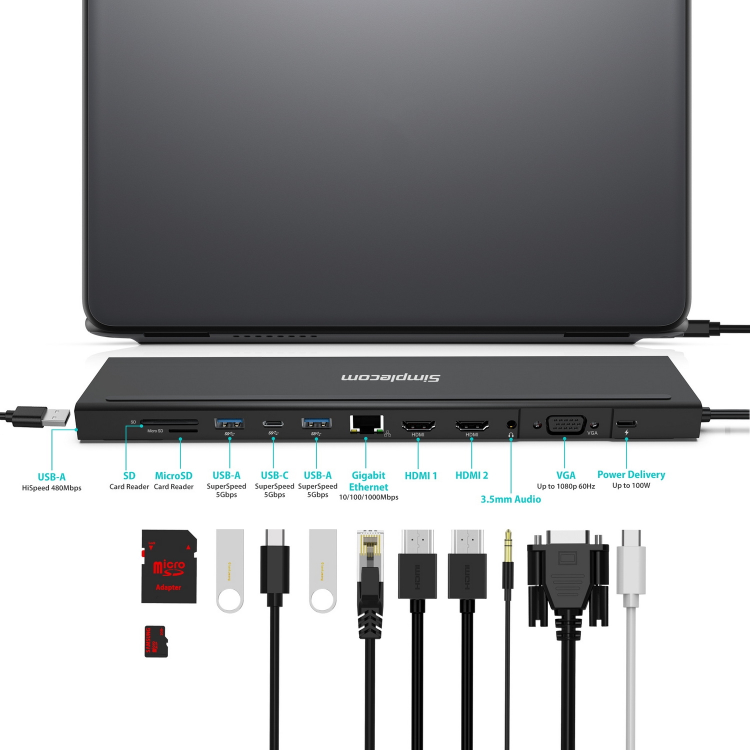 Simplecom CHN622 USB-C 12-in-1 Multiport Docking Station Laptop Stand Dual HDMI + VGA Triple Display Gigabit LAN