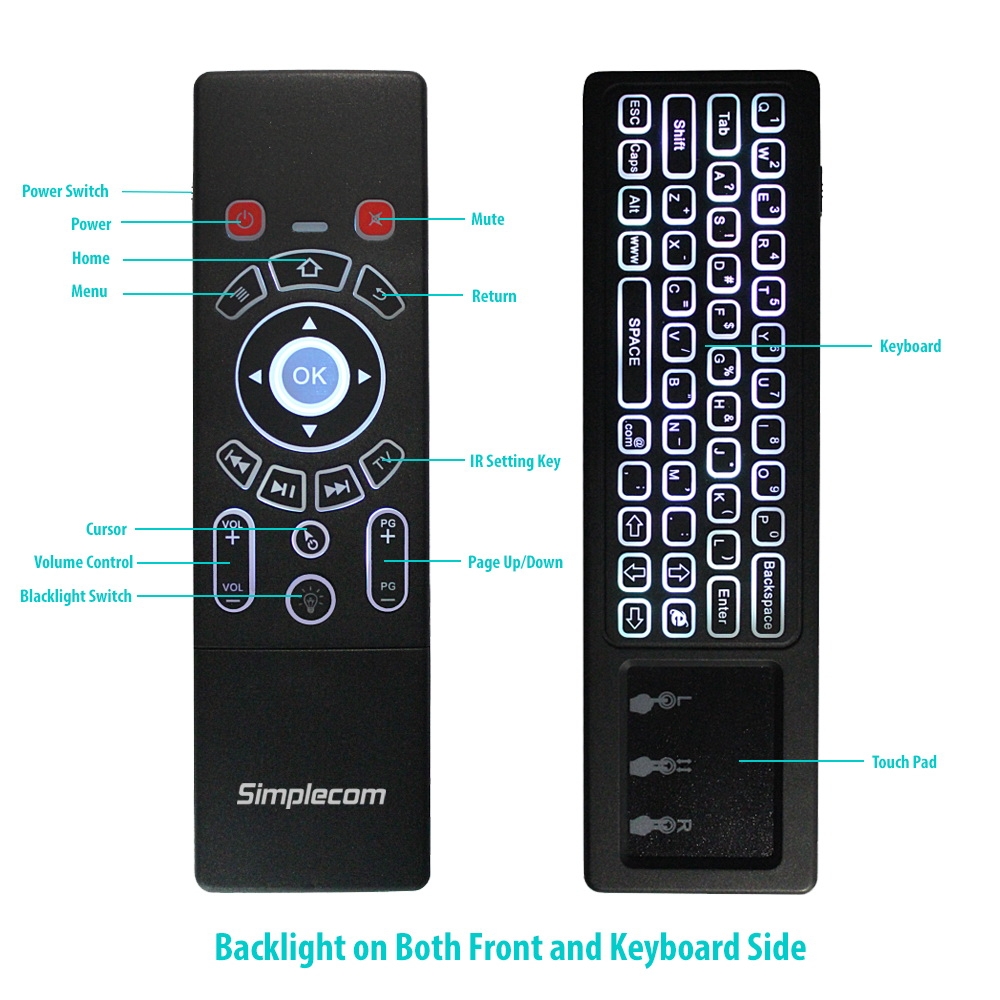 Simplecom RT250 Rechargeable 2.4GHz Wireless Remote Air Mouse Keyboard with Touch Pad and Backlight