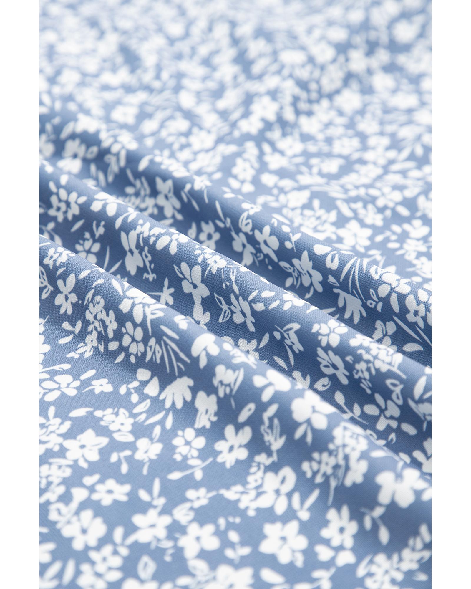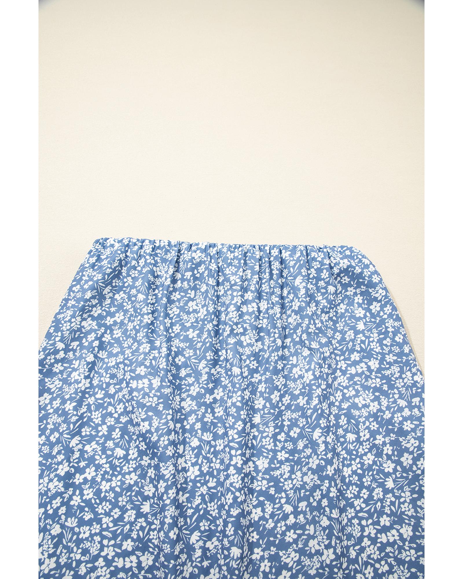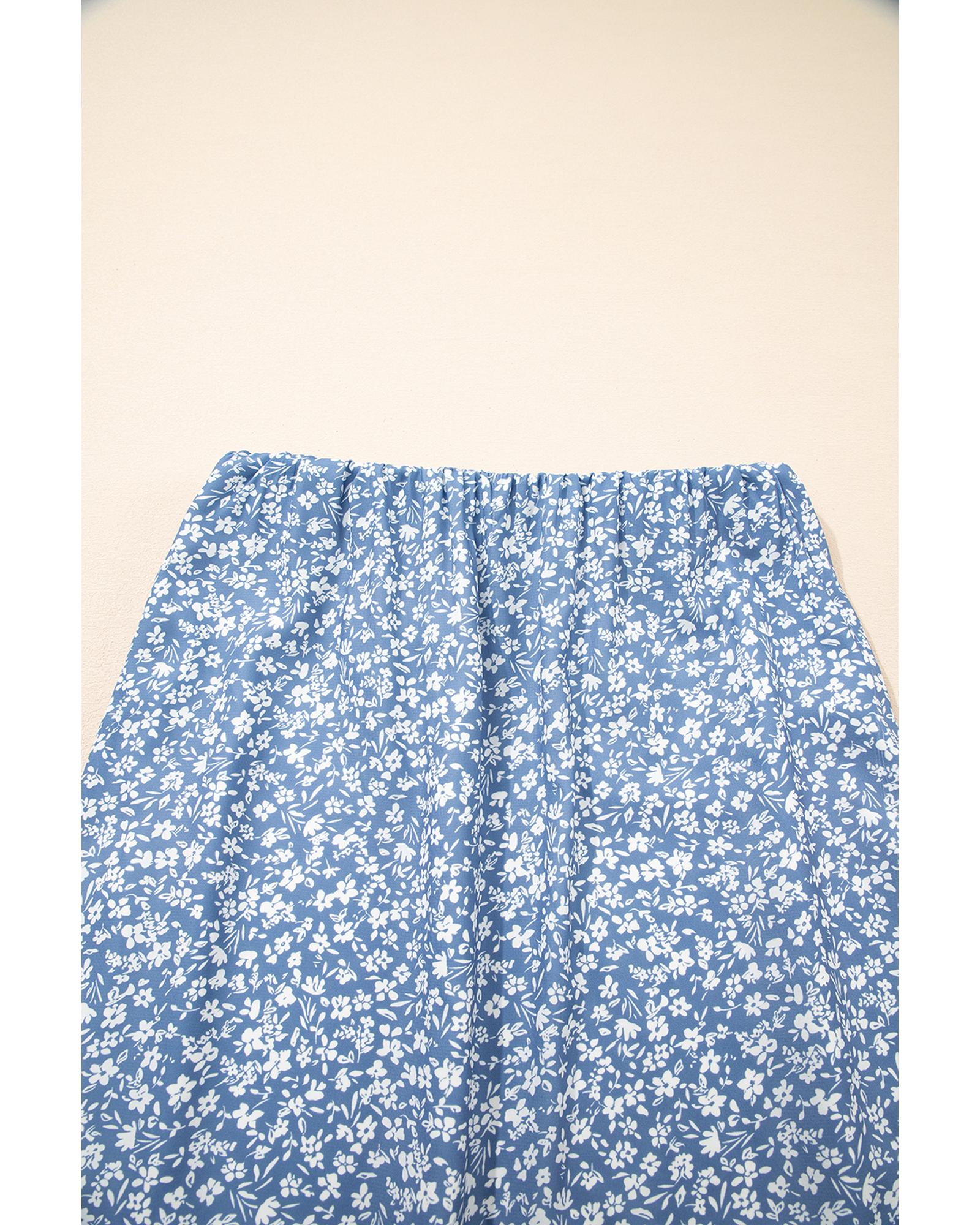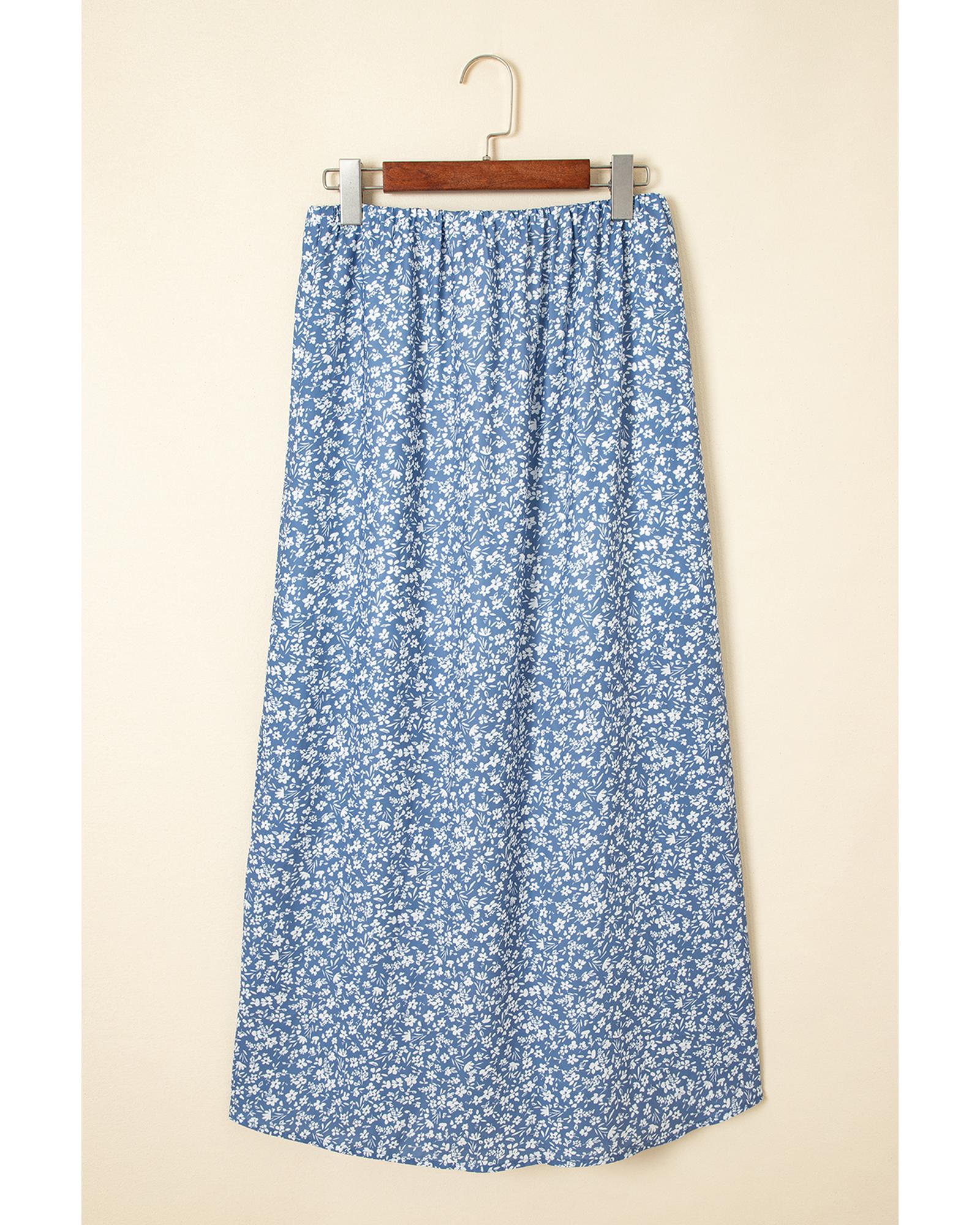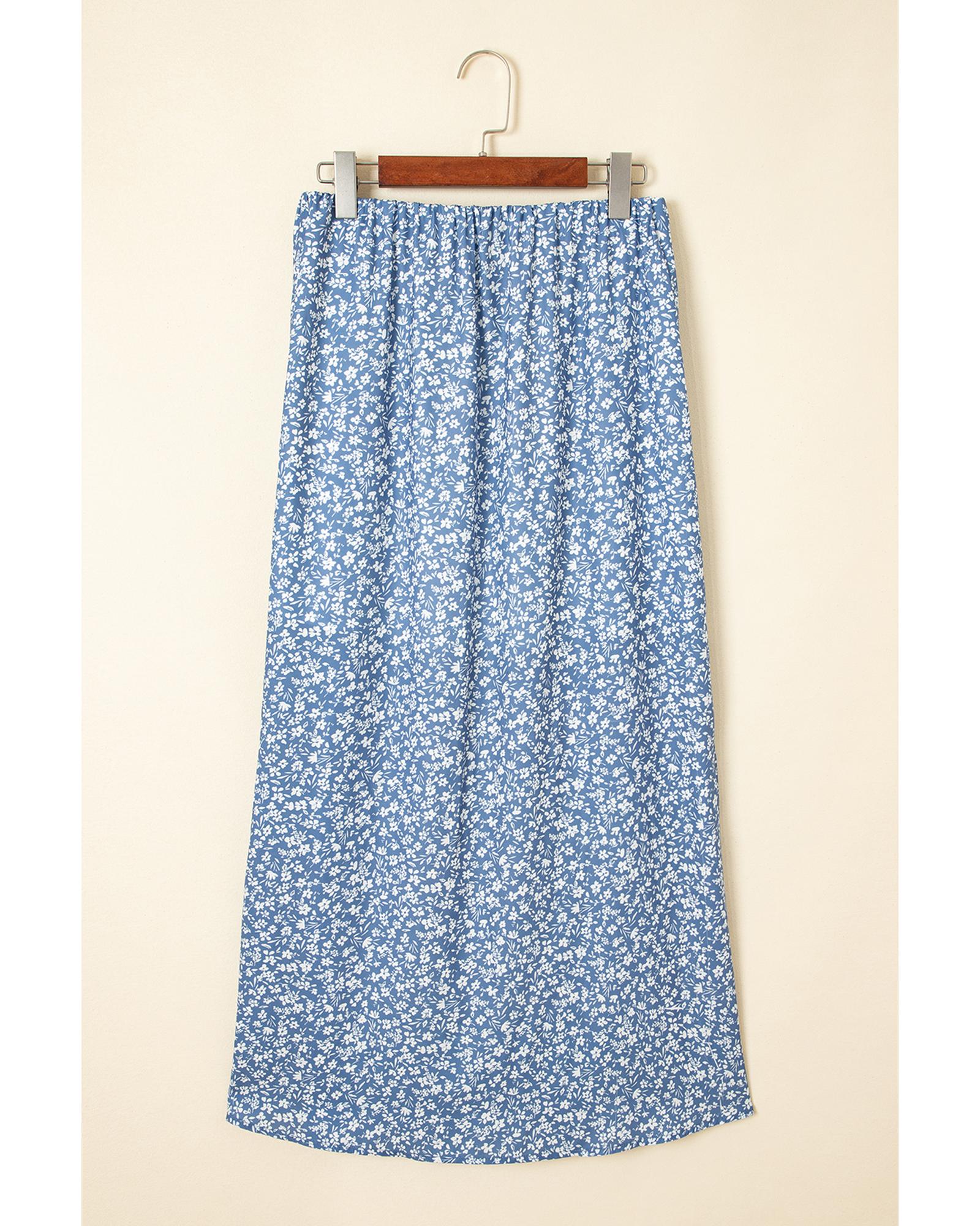 Sky Blue Boho Floral High Waist Long Skirt with Side Split - S