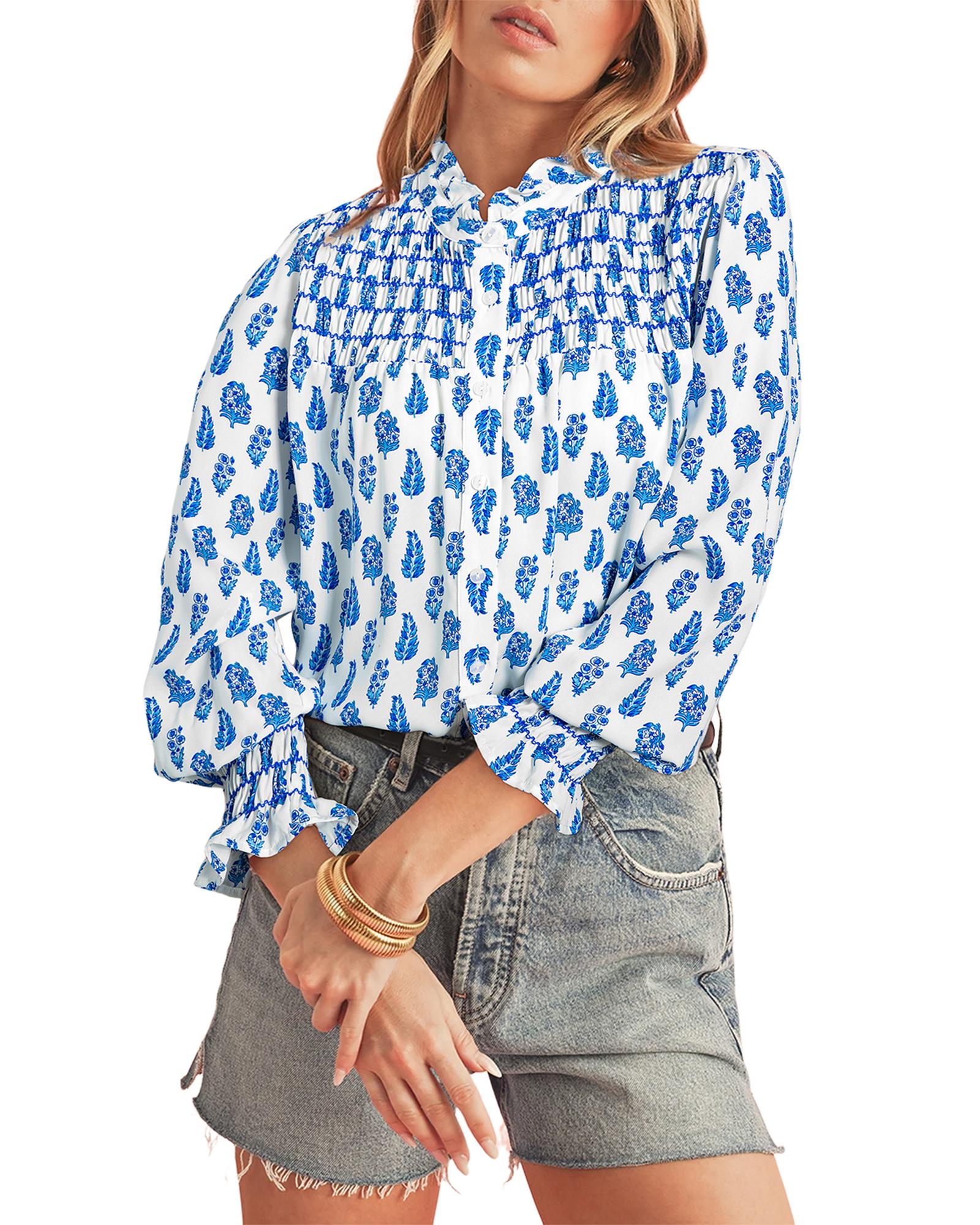Sky Blue Boho Floral Printed Lantern Sleeve Frilled Neck Shirred Shirt – M