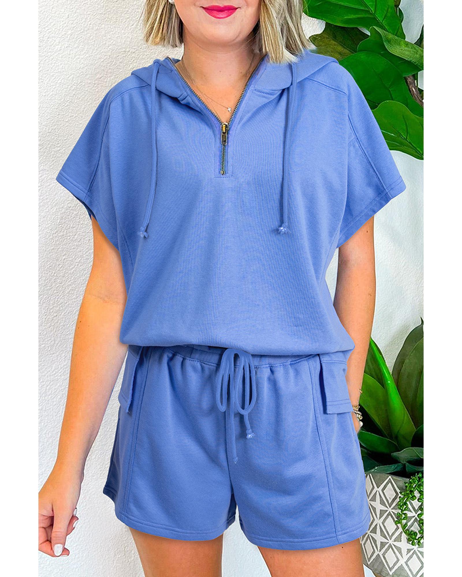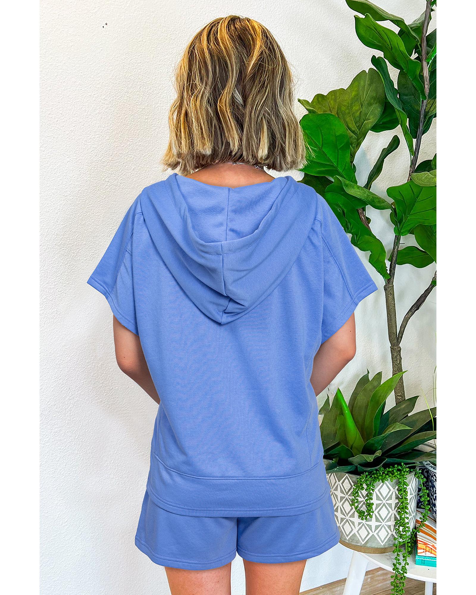 Sky Blue Casual Zipped Short Sleeve Hoodie and Shorts Set – S