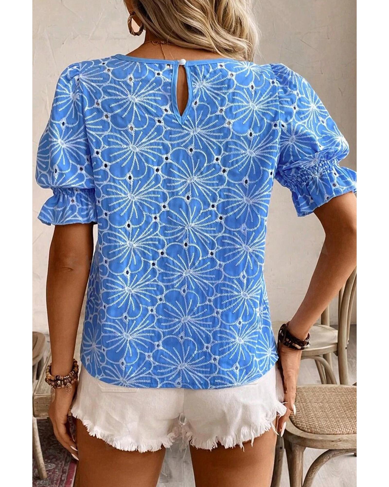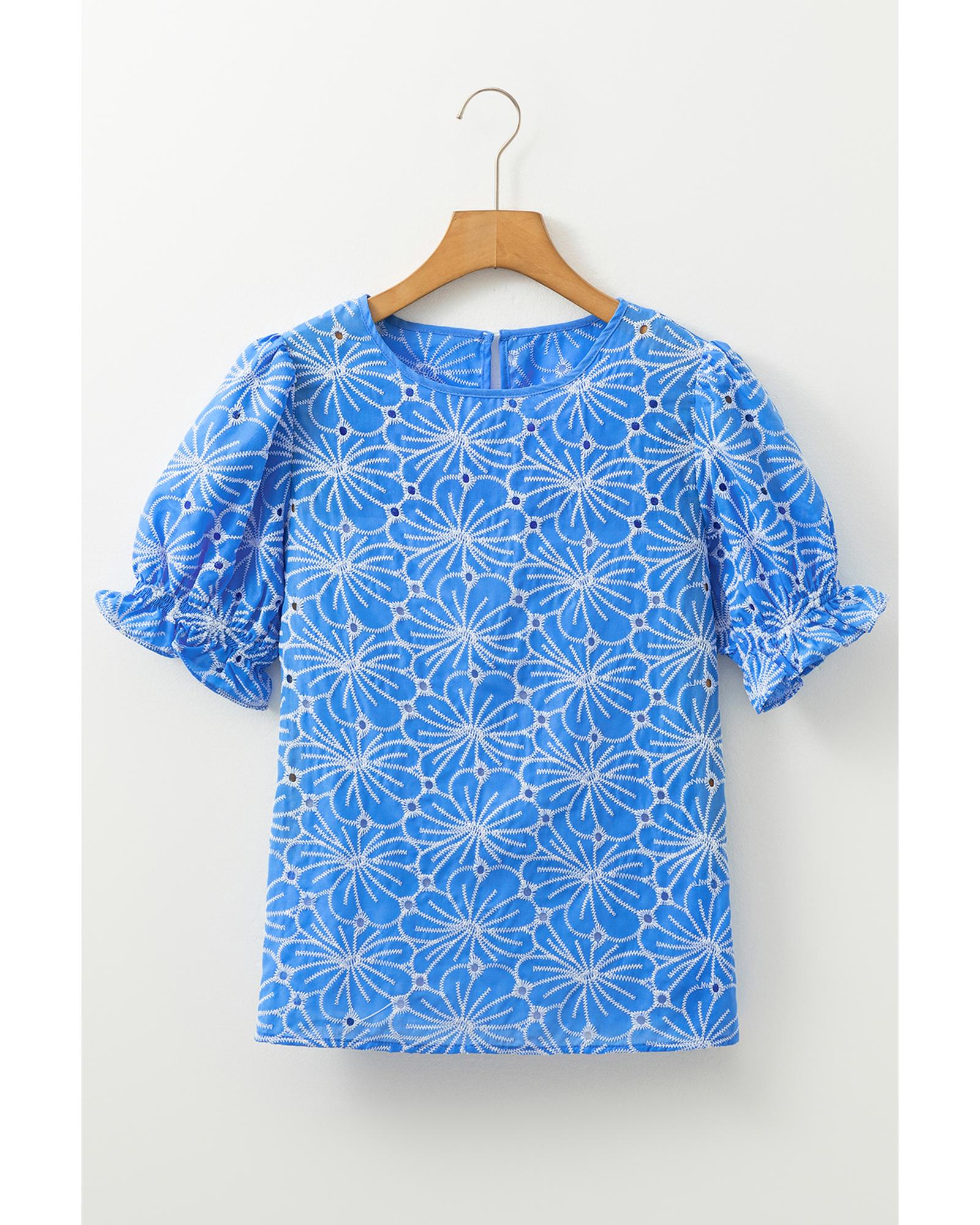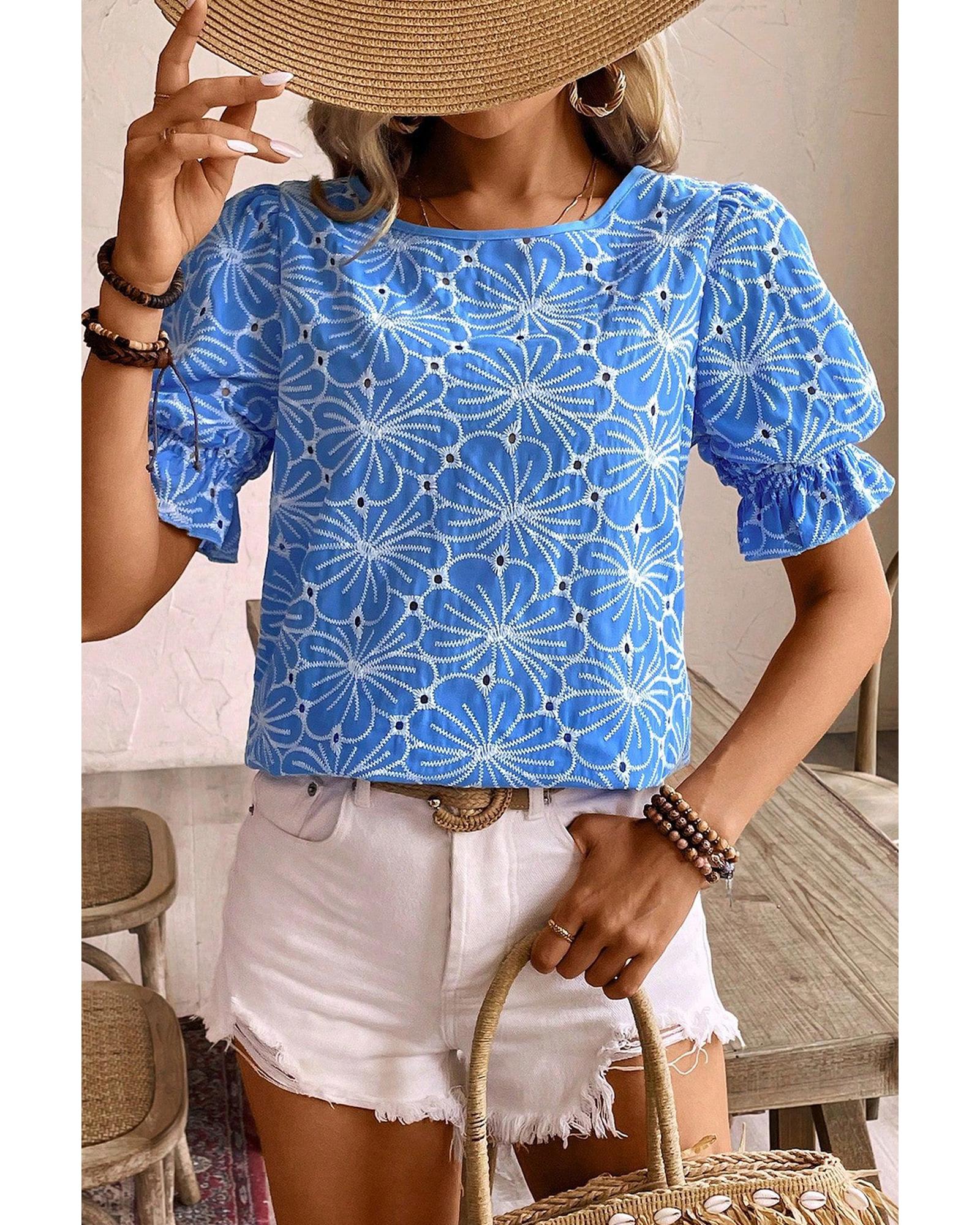 Sky Blue Eyelet Flower Embroidery Frilled Short Puff Sleeve Blouse – L