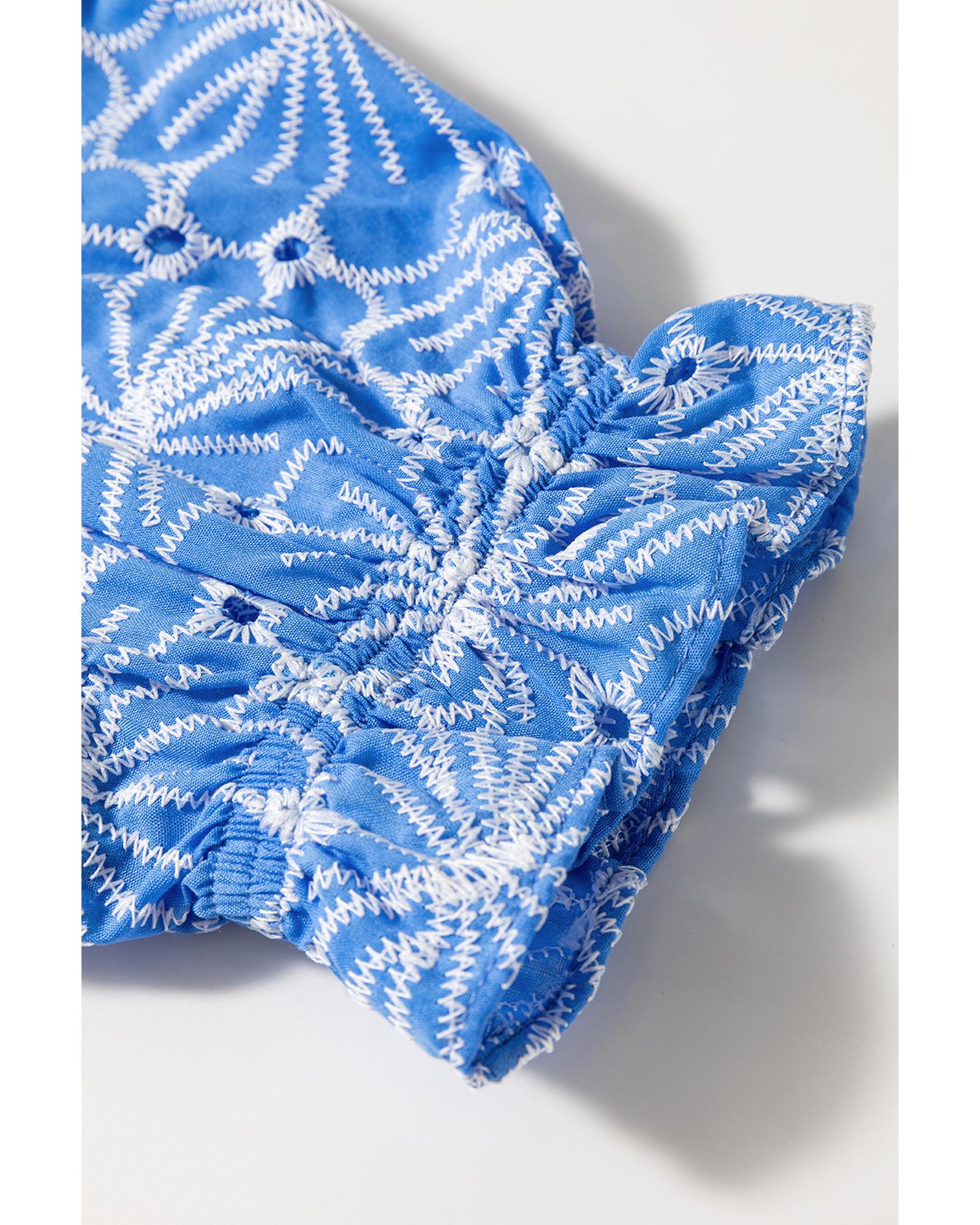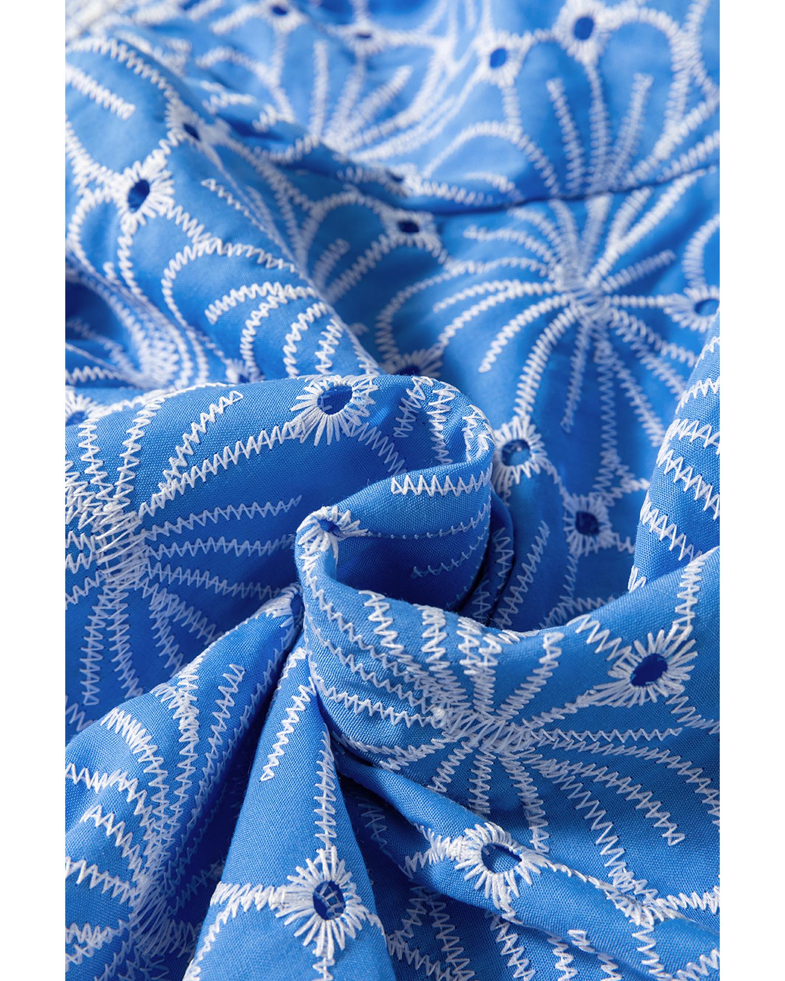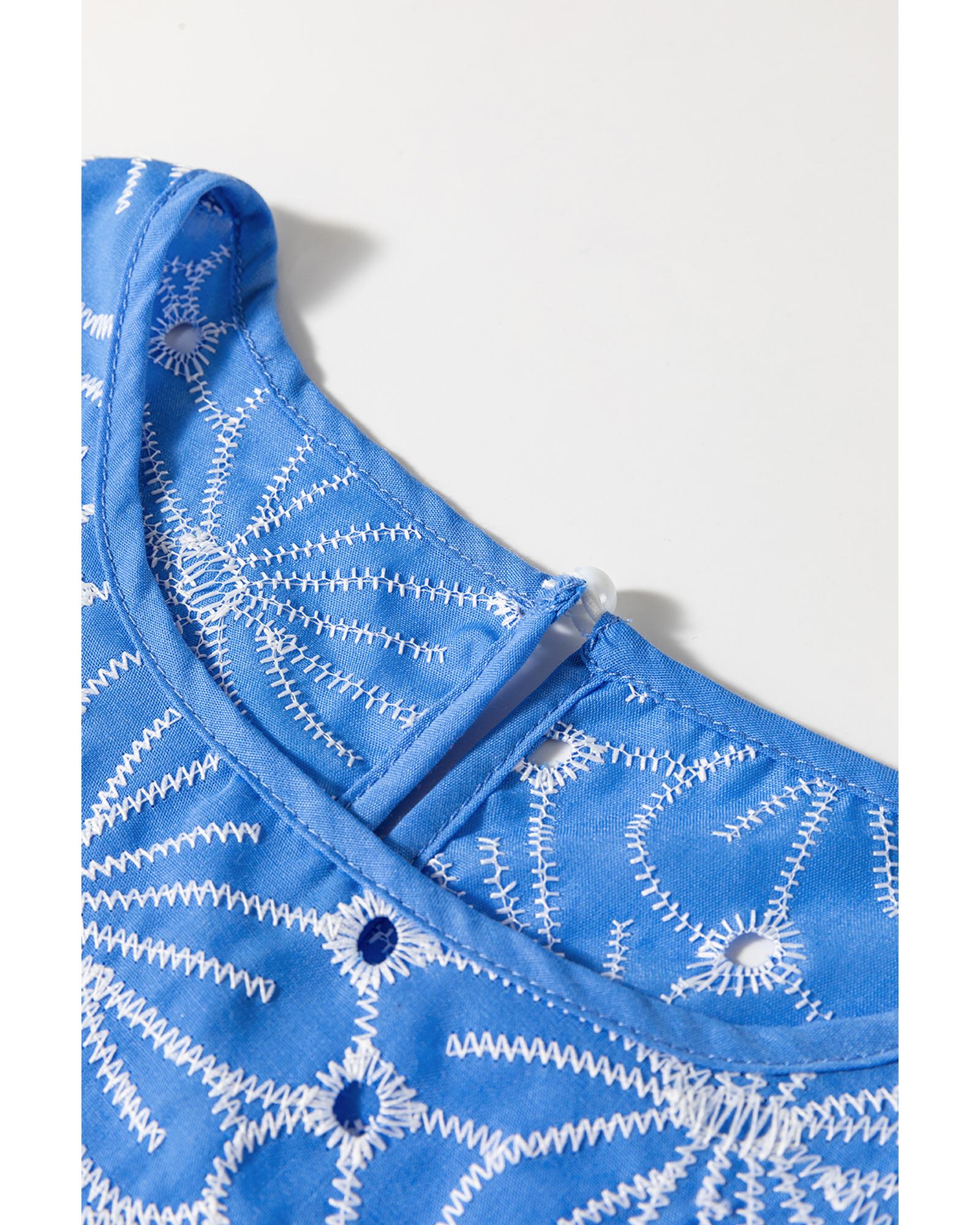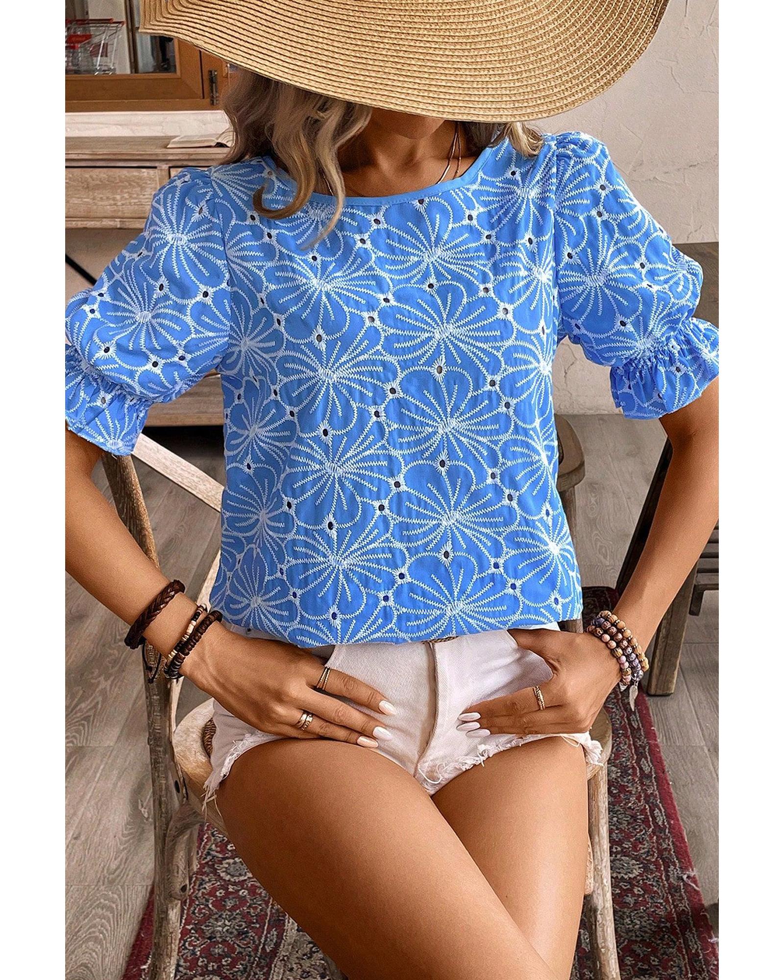 Sky Blue Eyelet Flower Embroidery Frilled Short Puff Sleeve Blouse – L