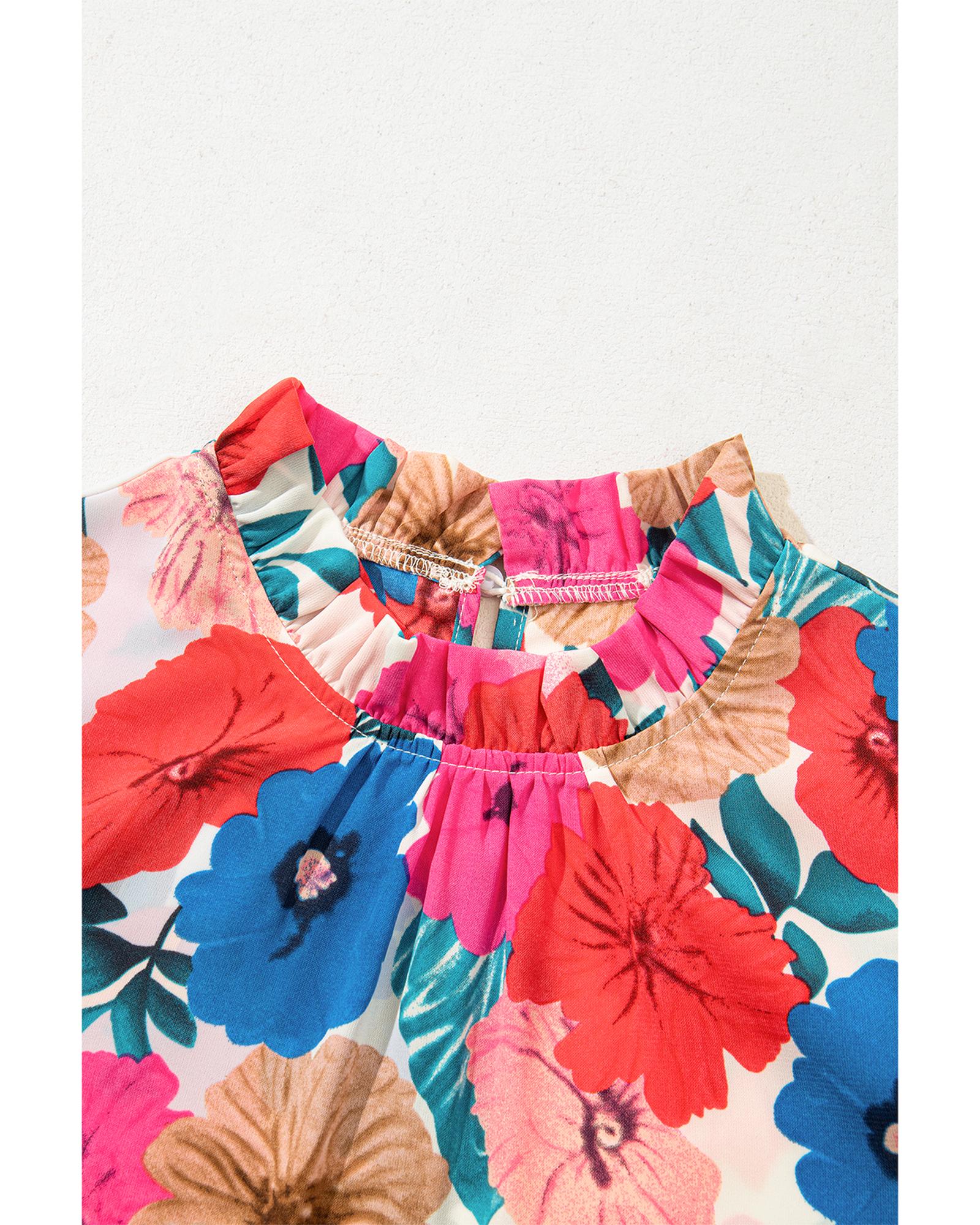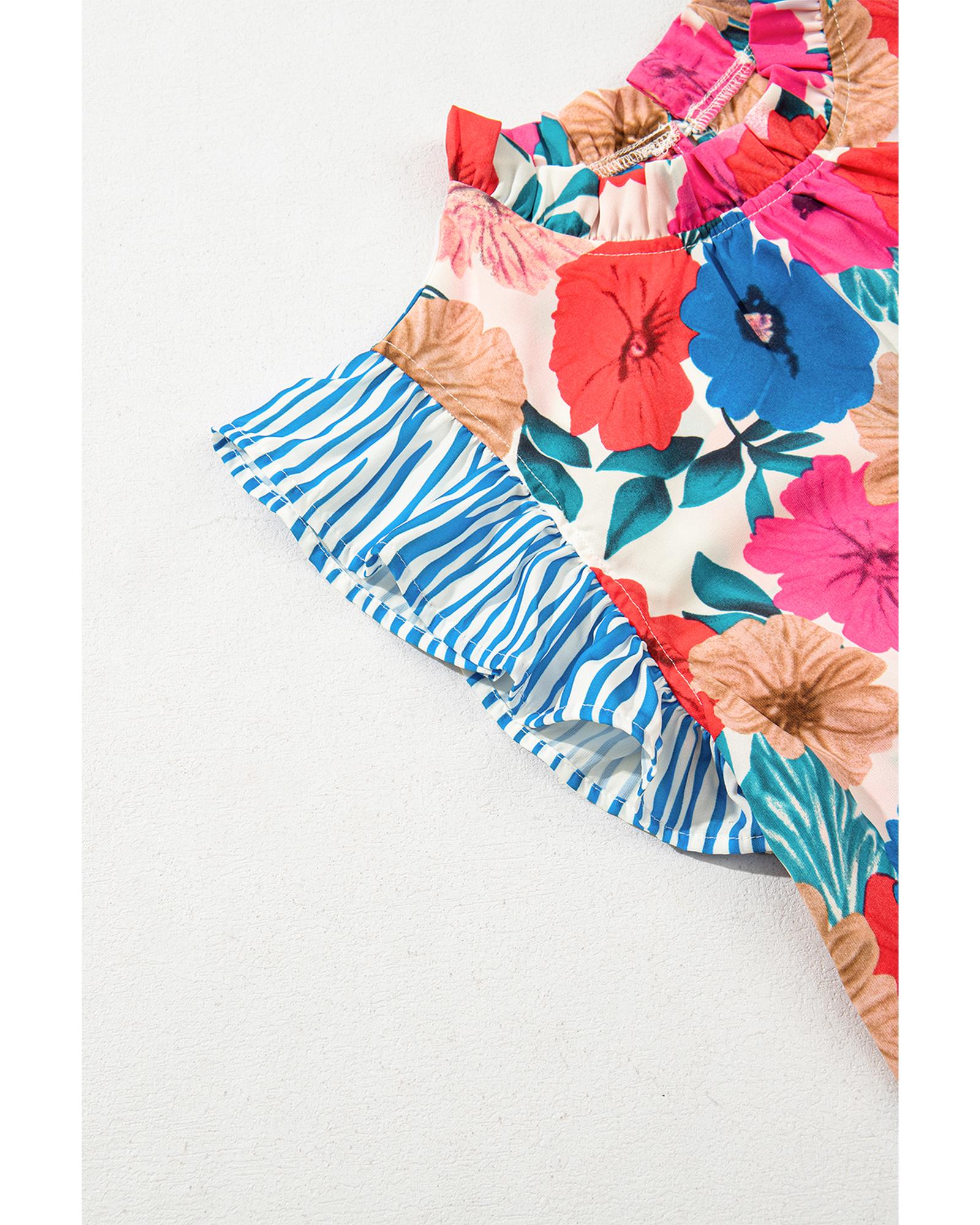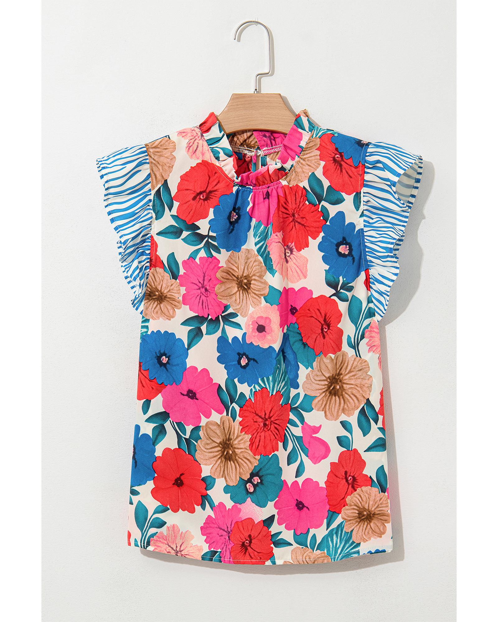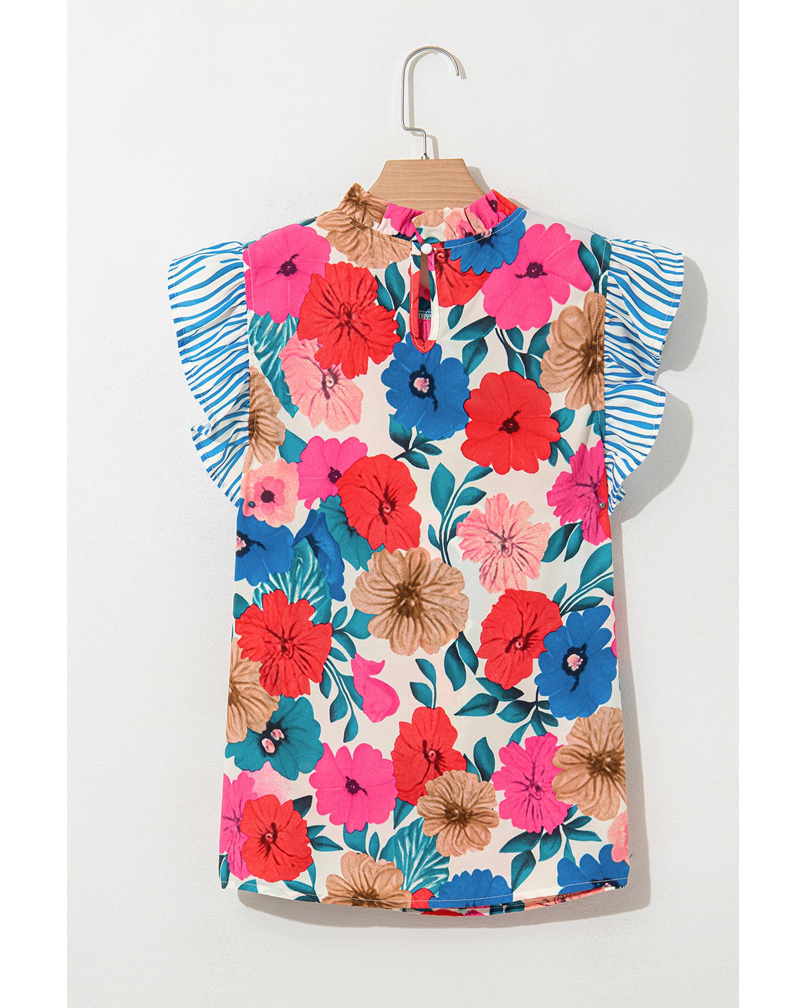 Sky Blue Floral Mock Neck Striped Flutter Sleeve Blouse – M
