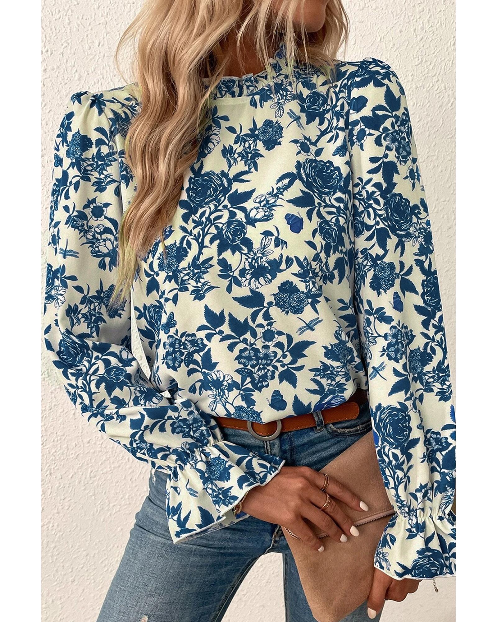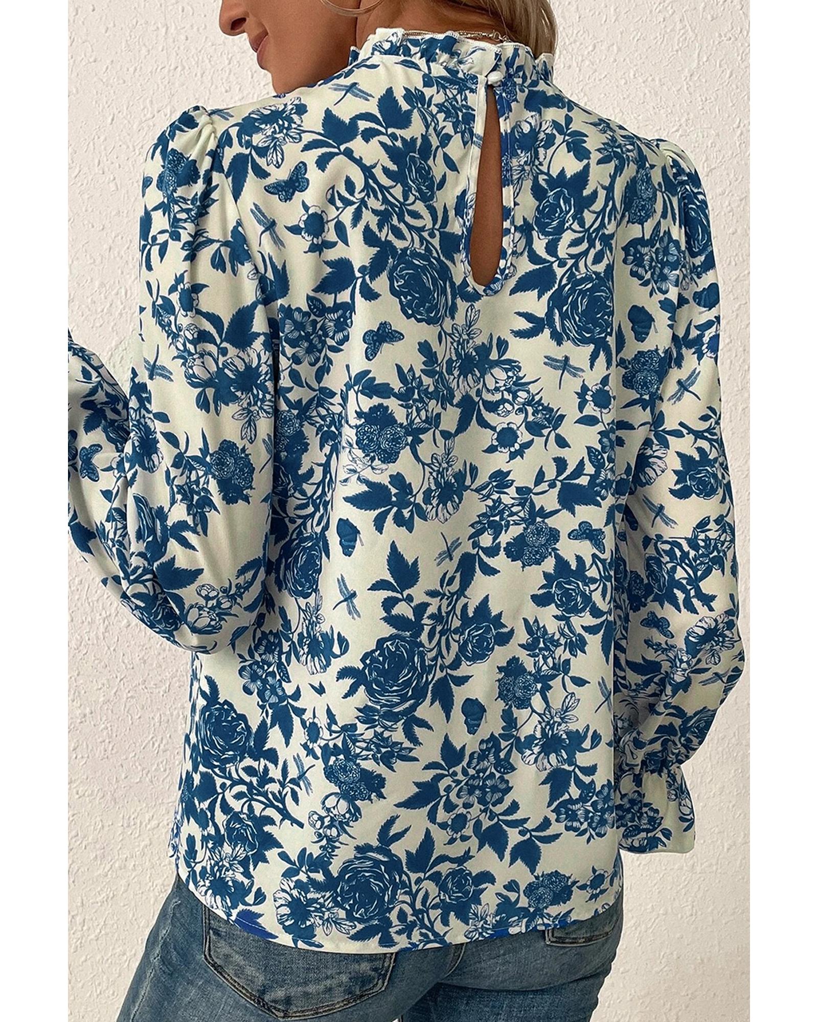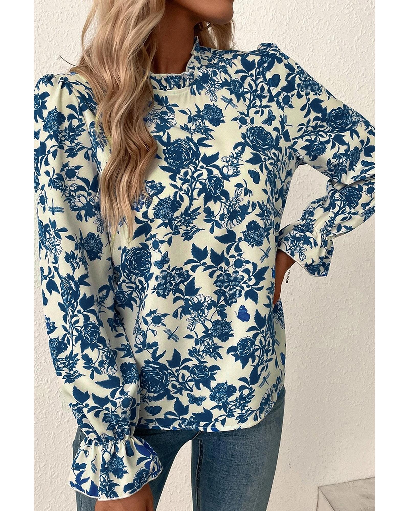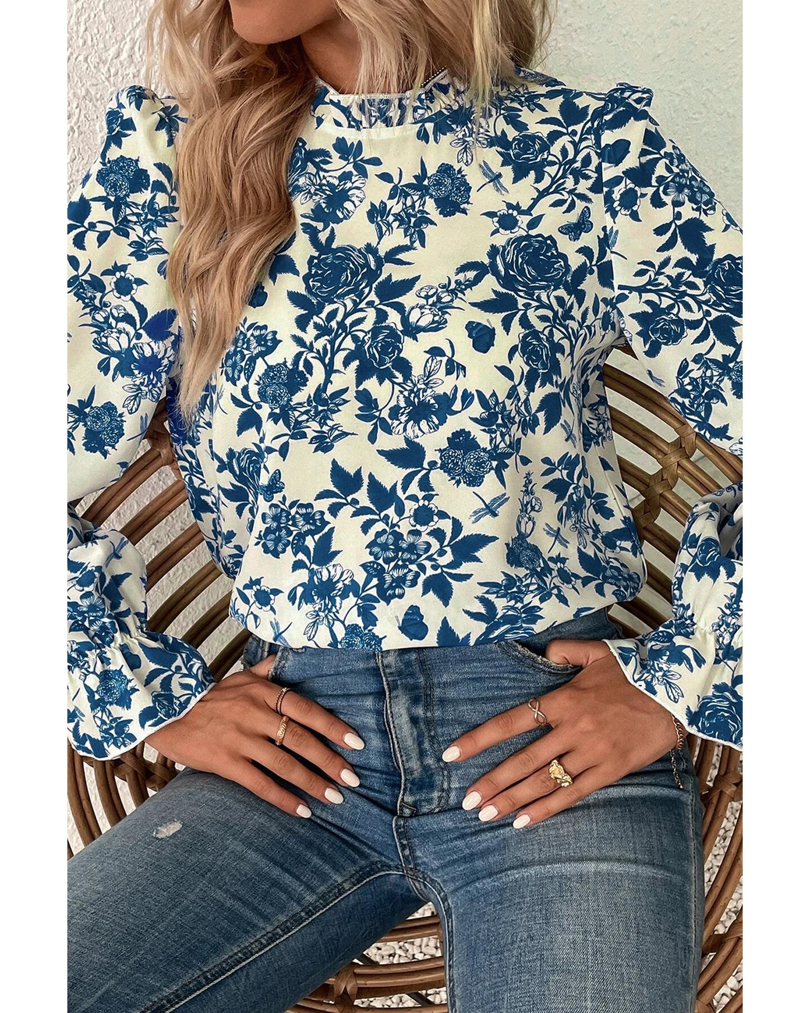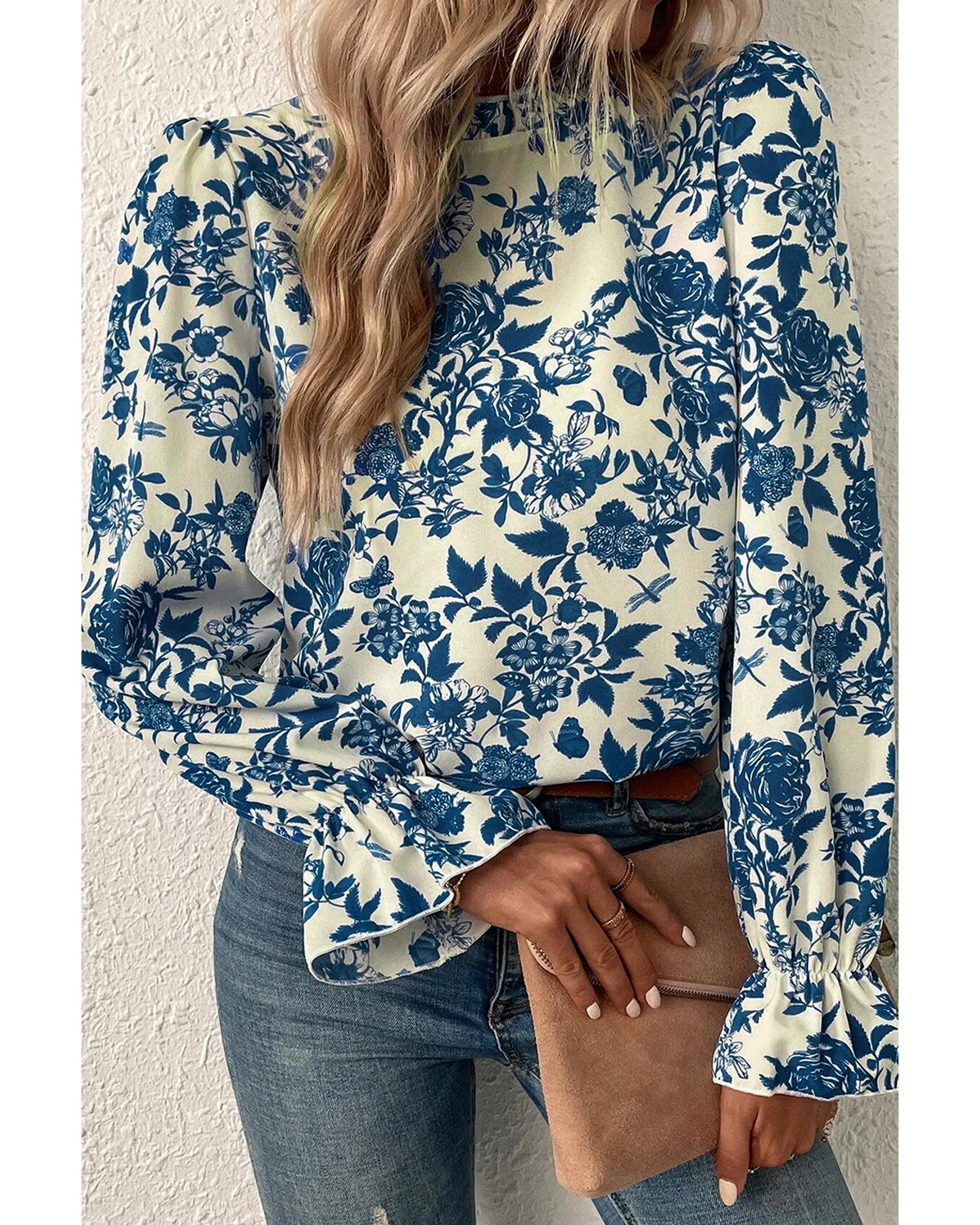 Sky Blue Floral Print Flounce Sleeve Keyhole Back Blouse – XL