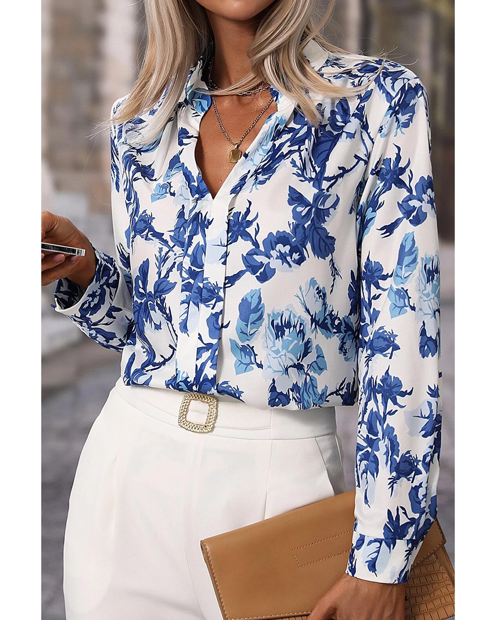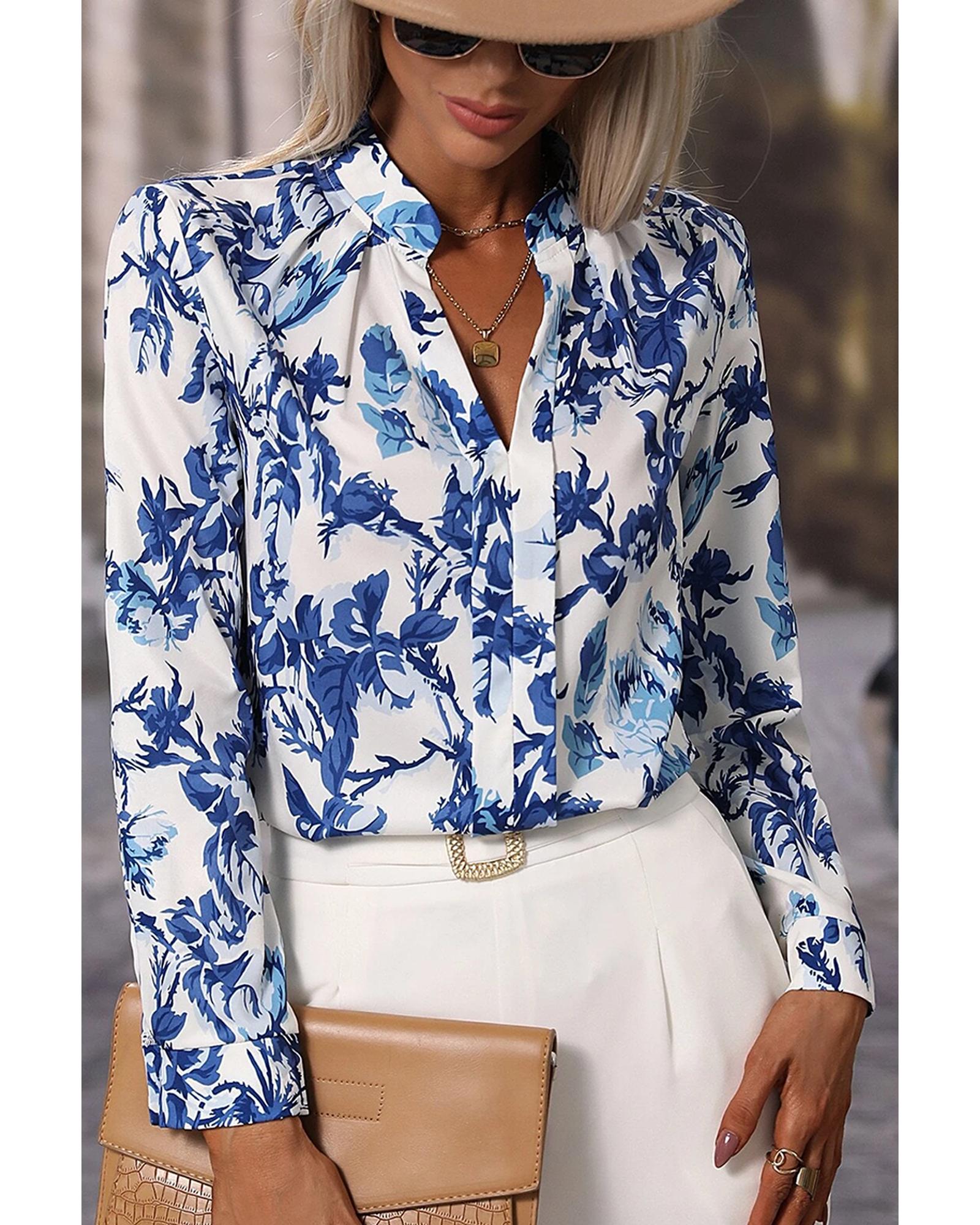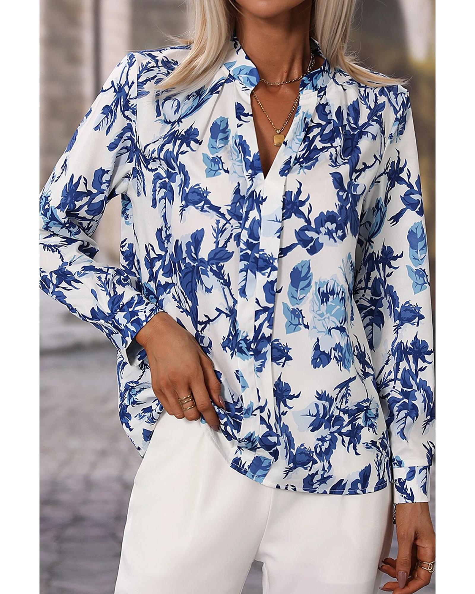 Sky Blue Floral Print Notched Neck Elegant Blouse – XL