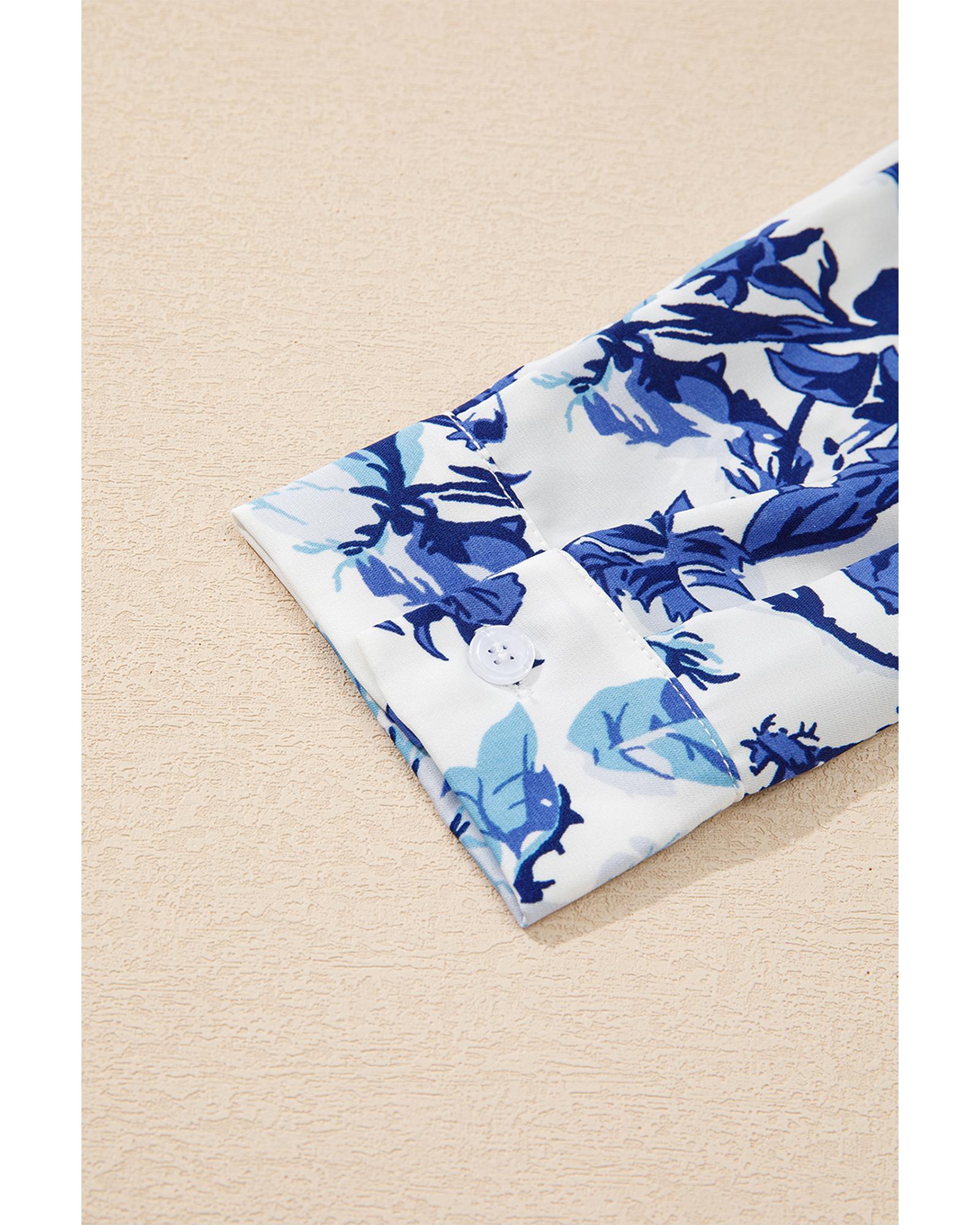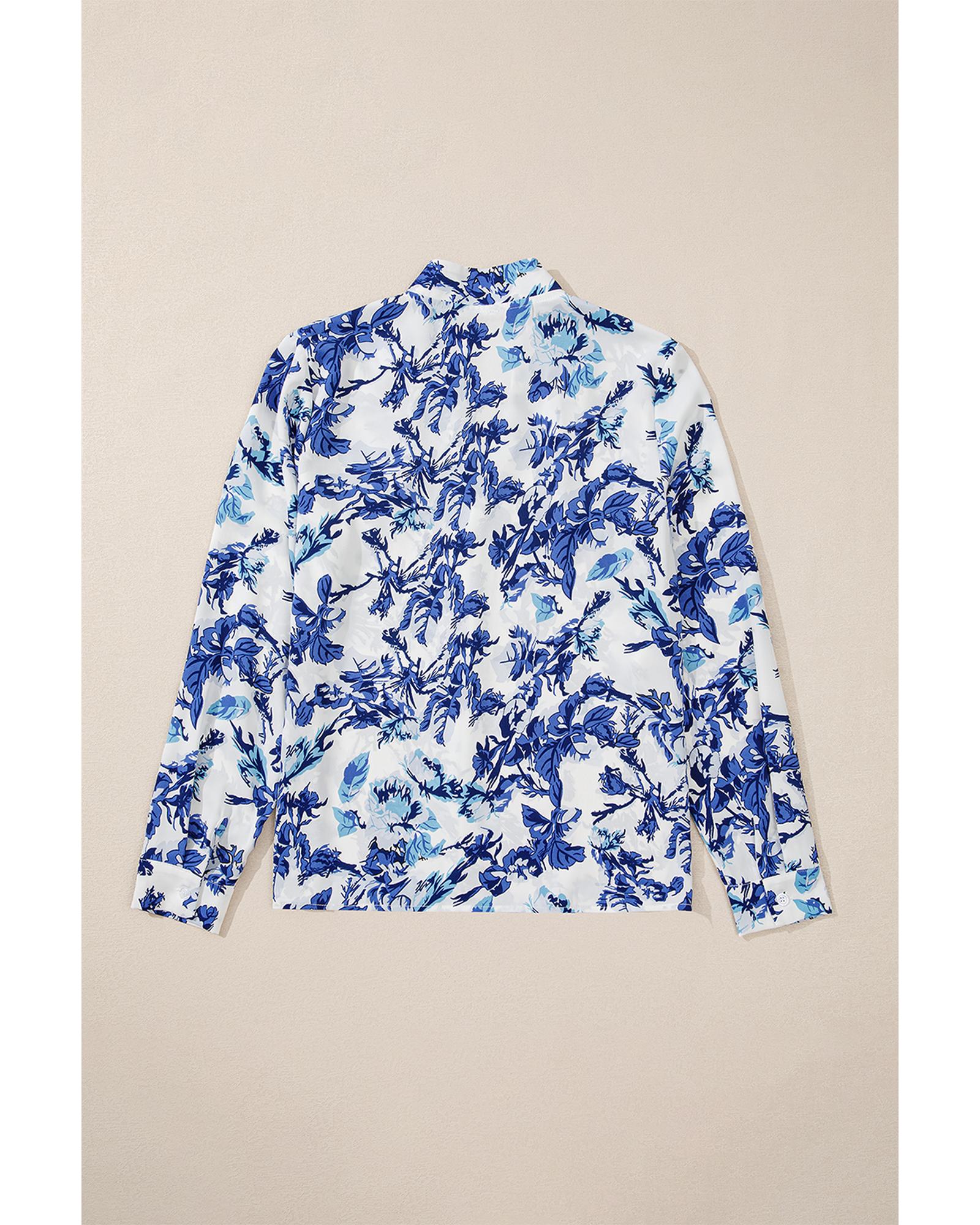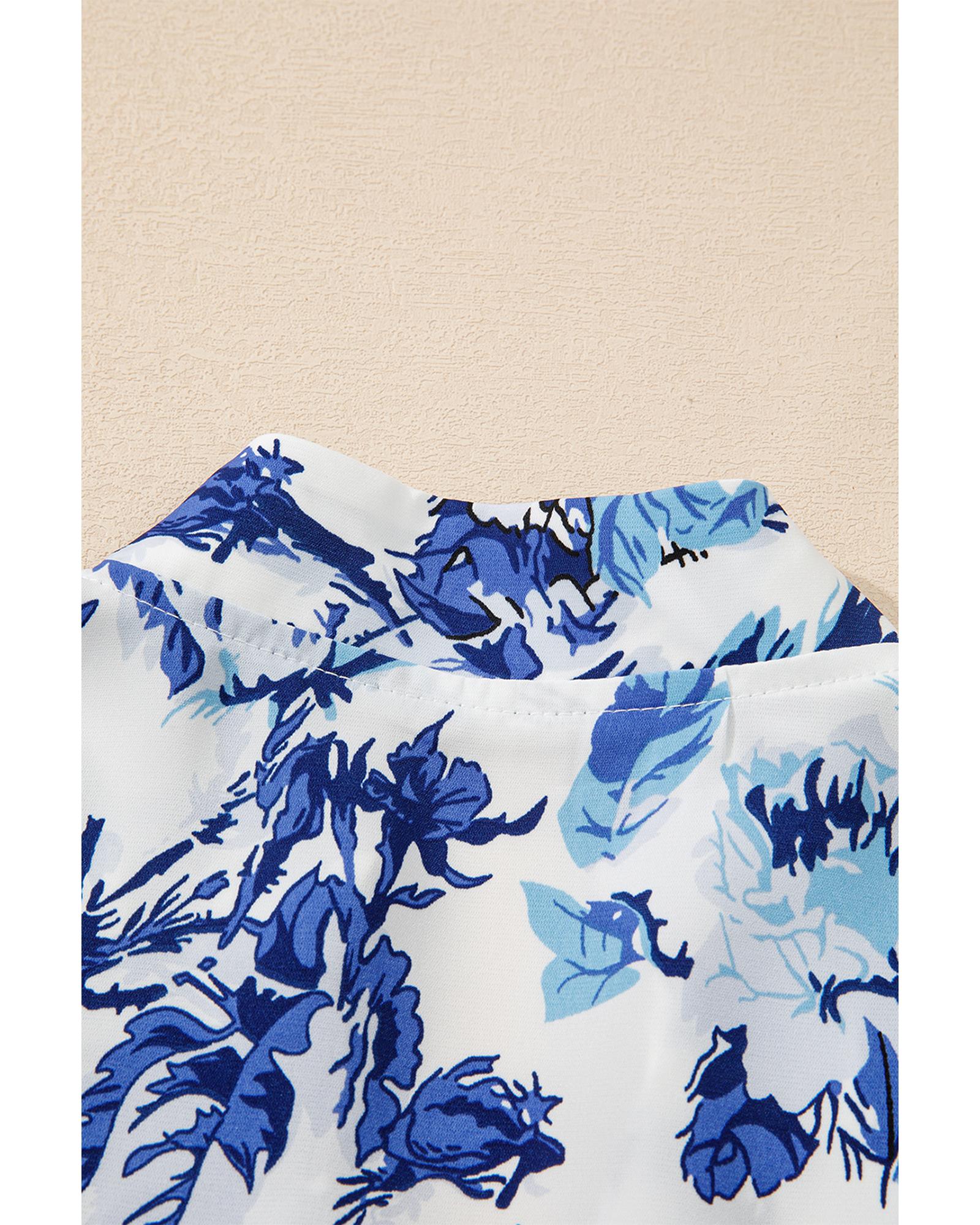Sky Blue Floral Print Notched Neck Elegant Blouse – XL