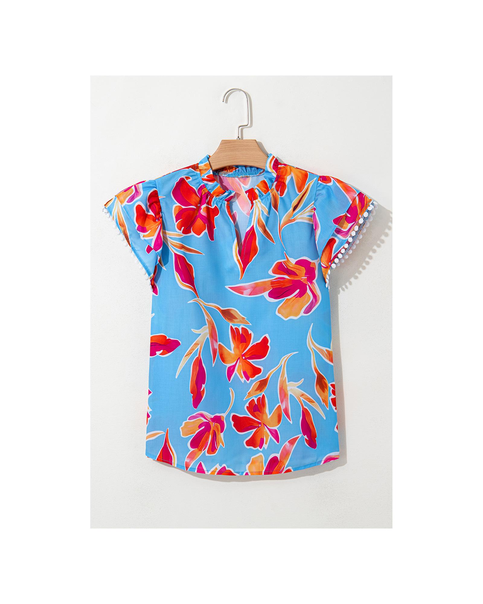 Sky Blue Floral Print V Neck Pompom Trim Flutter Sleeve Blouse – L