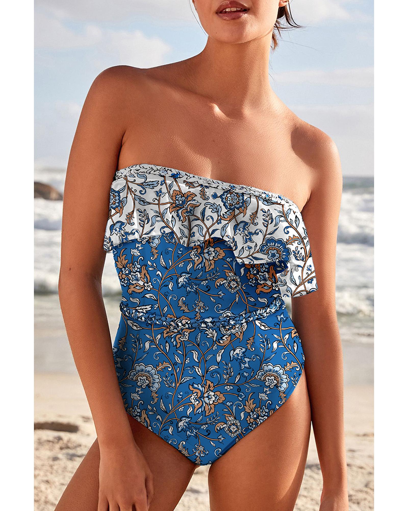 Sky Blue Floral Printed Ruffle Removable Strap One Piece Swimsuit – 2XL