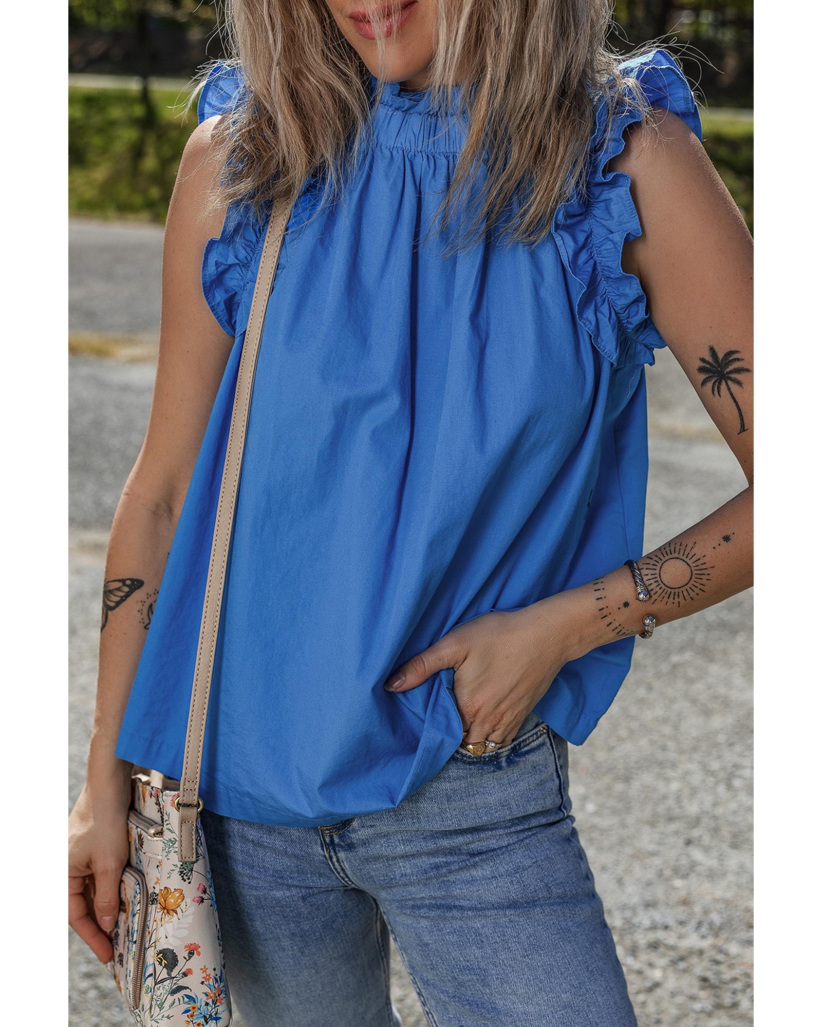 Sky Blue Frilled Neck Ruffled Armholes Buttoned Back Tank Top – L