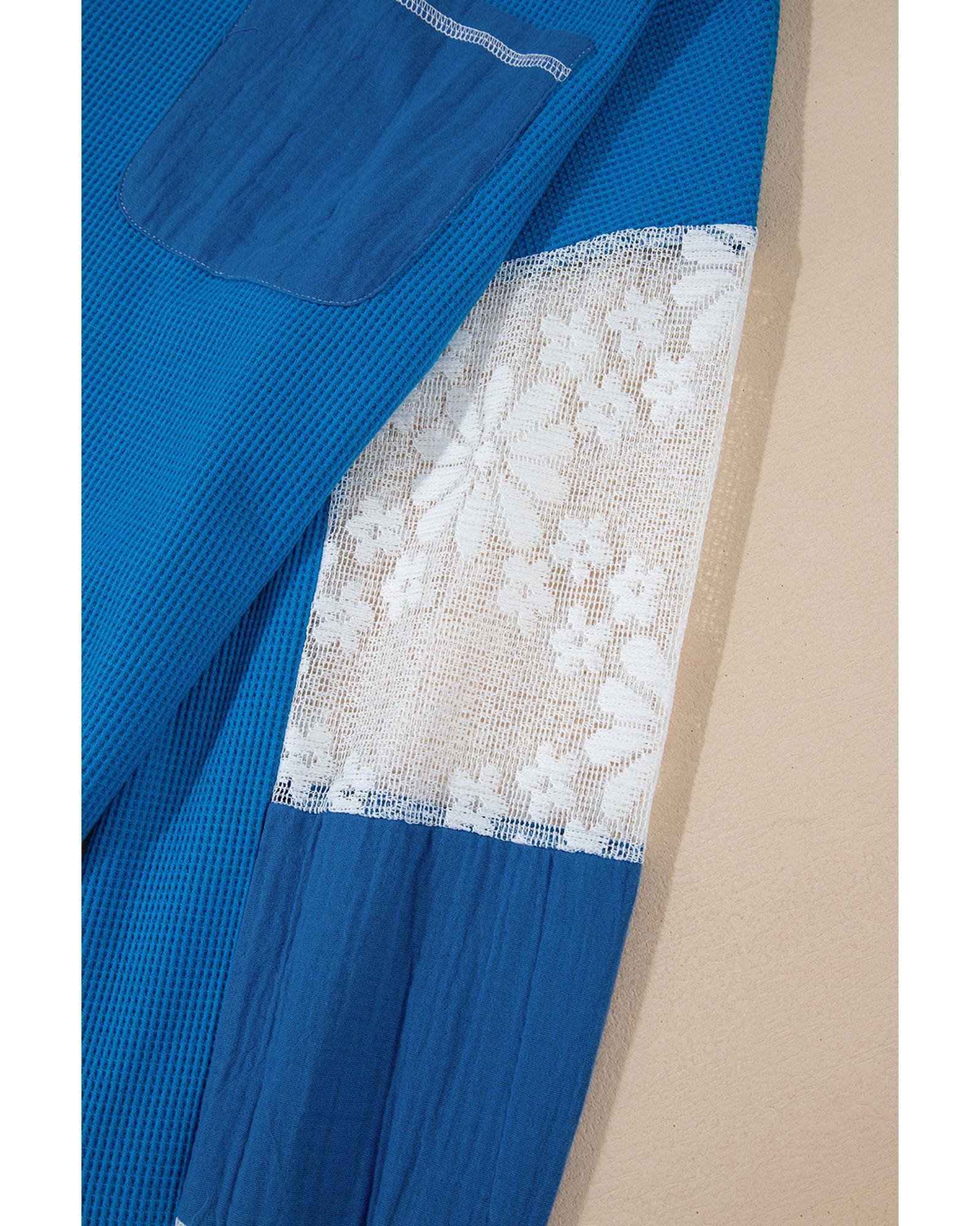 Sky Blue Lace Floral Patchwork Sleeve Stitching V Neck Rib Knit Blouse – M