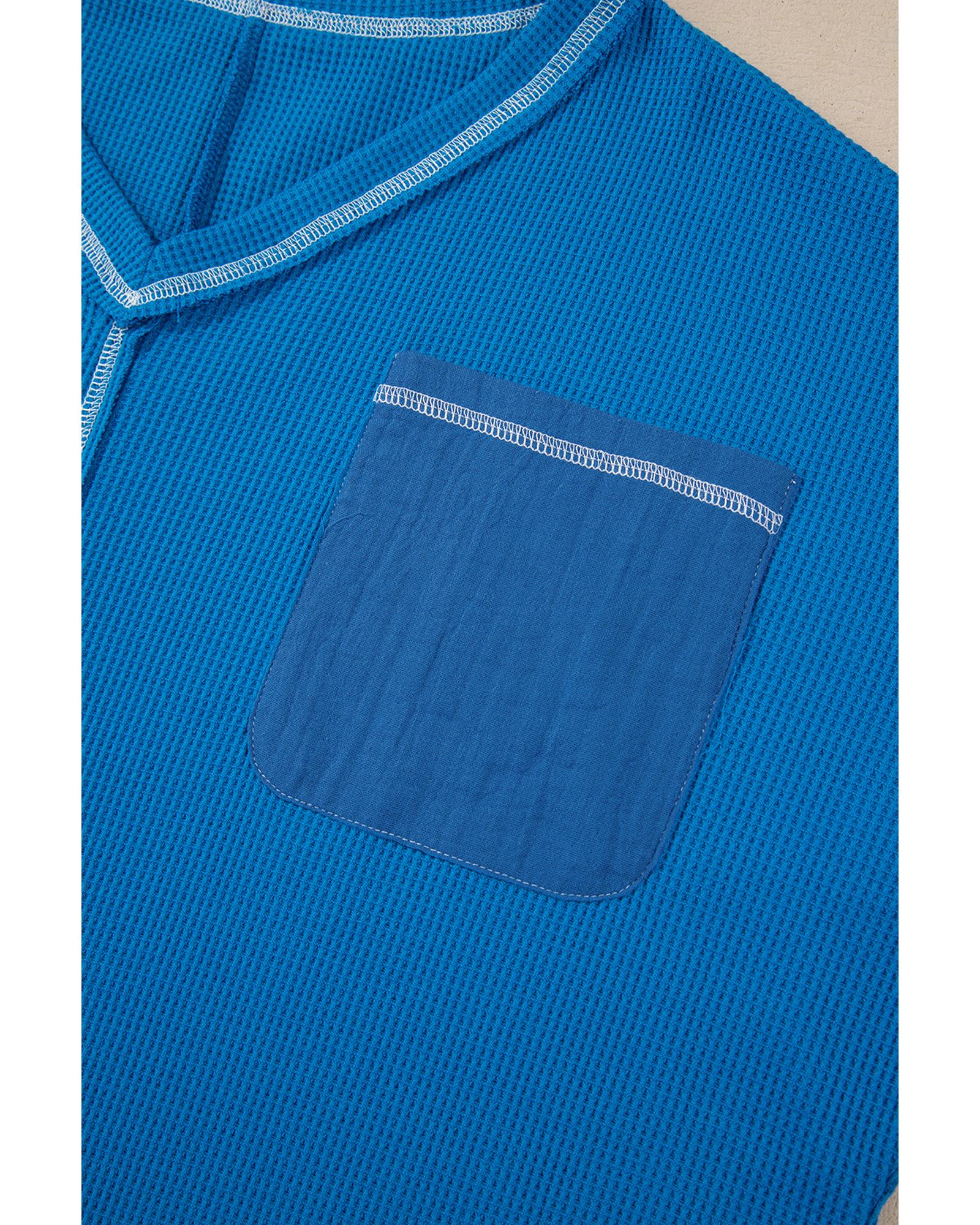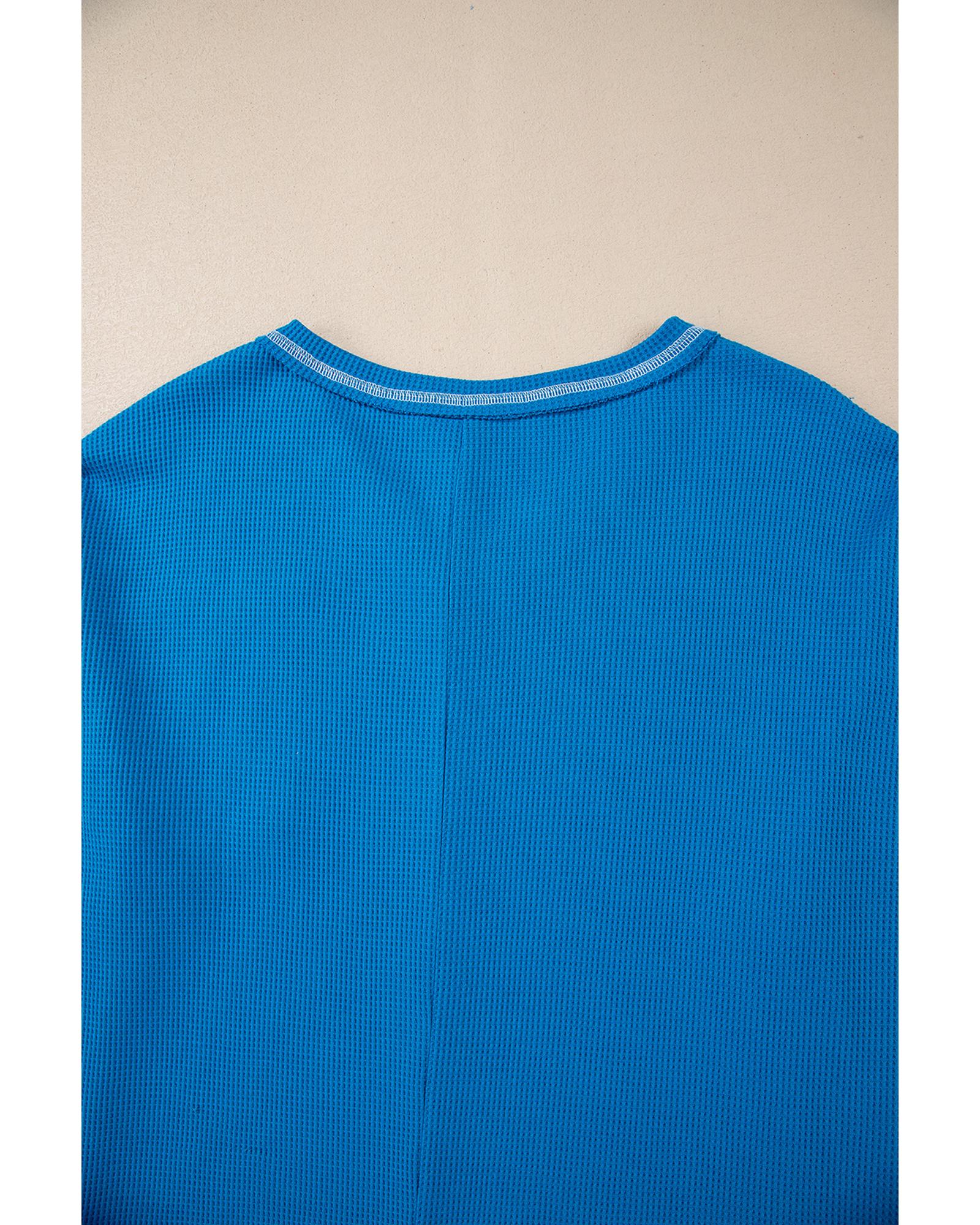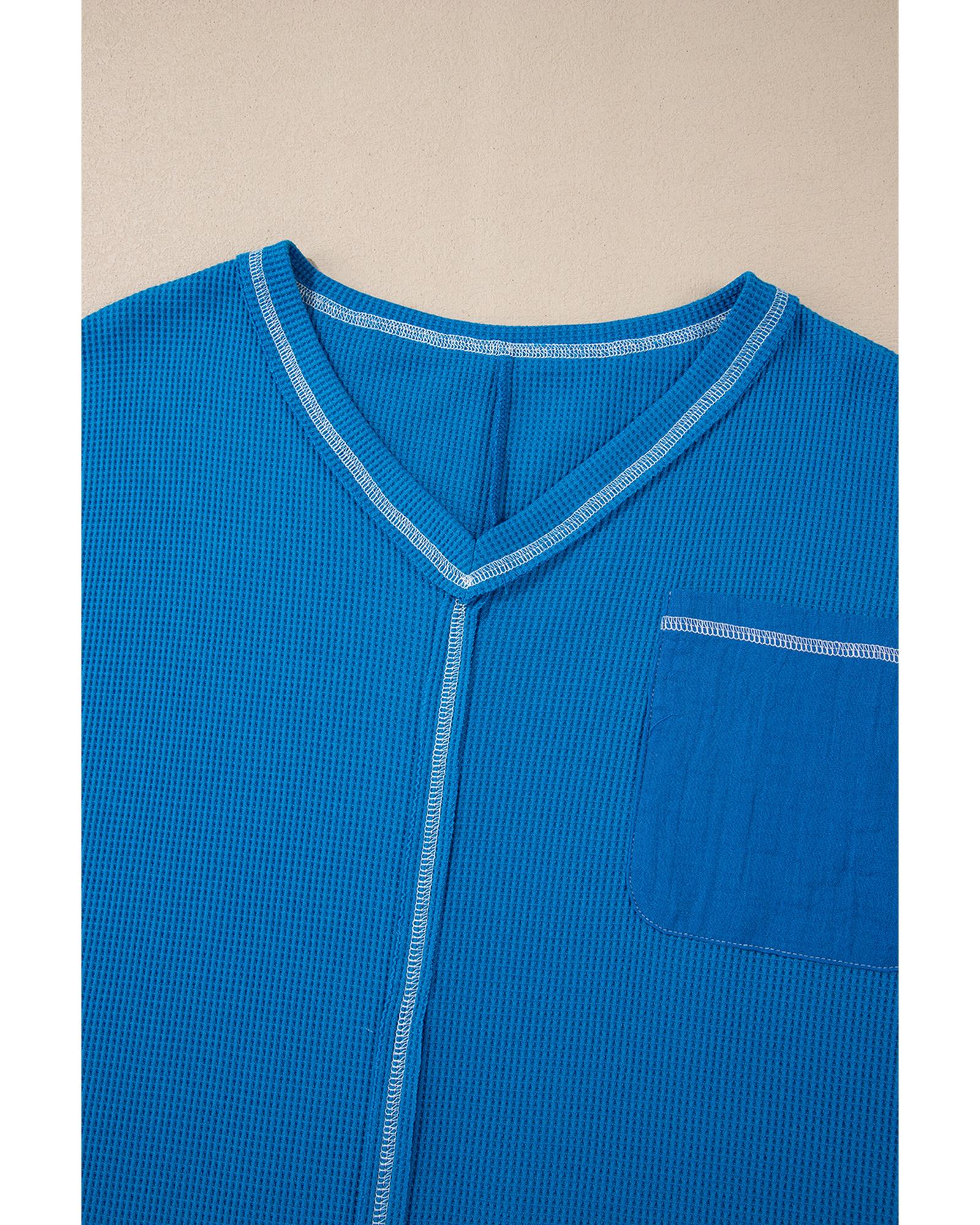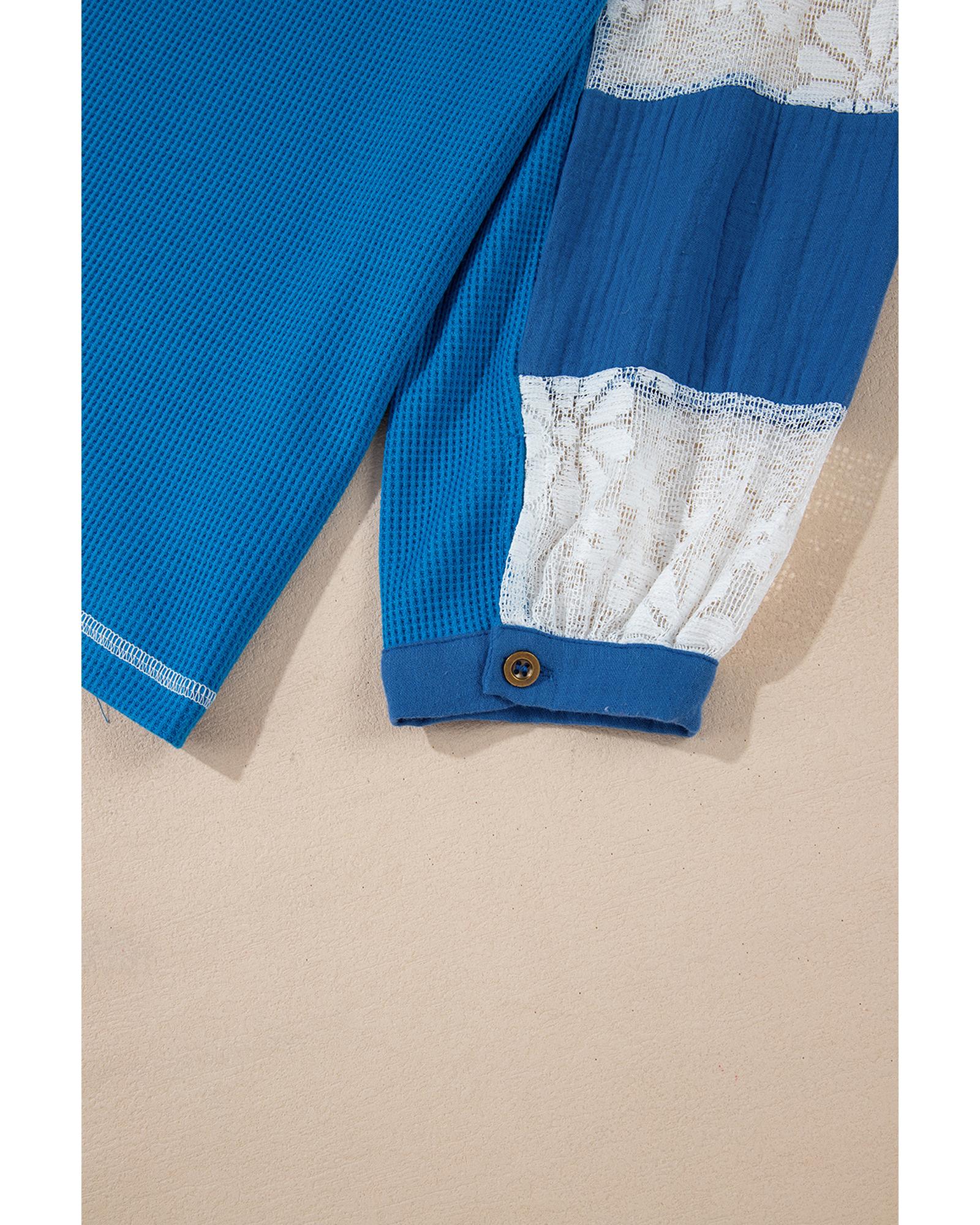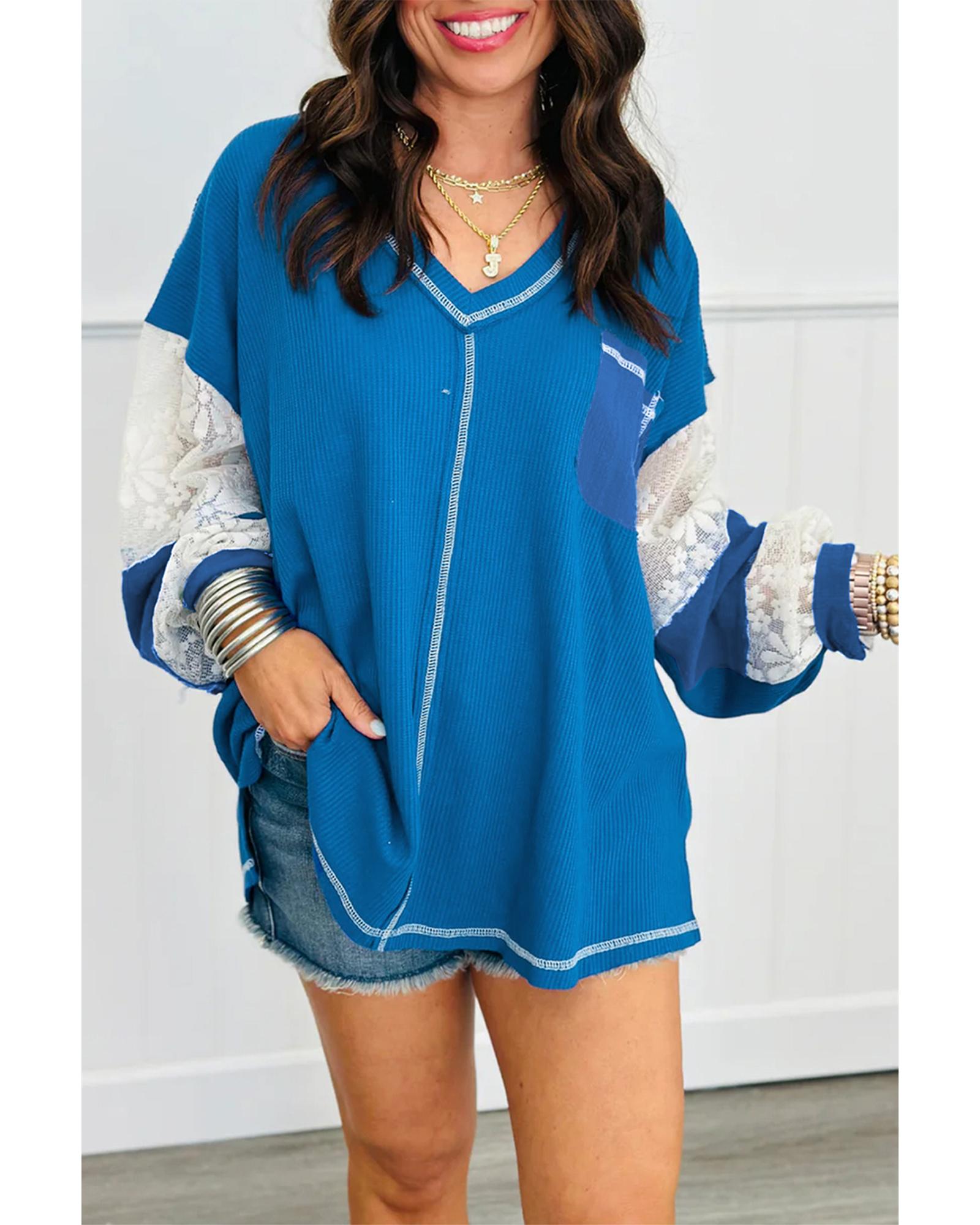 Sky Blue Lace Floral Patchwork Sleeve Stitching V Neck Rib Knit Blouse – S