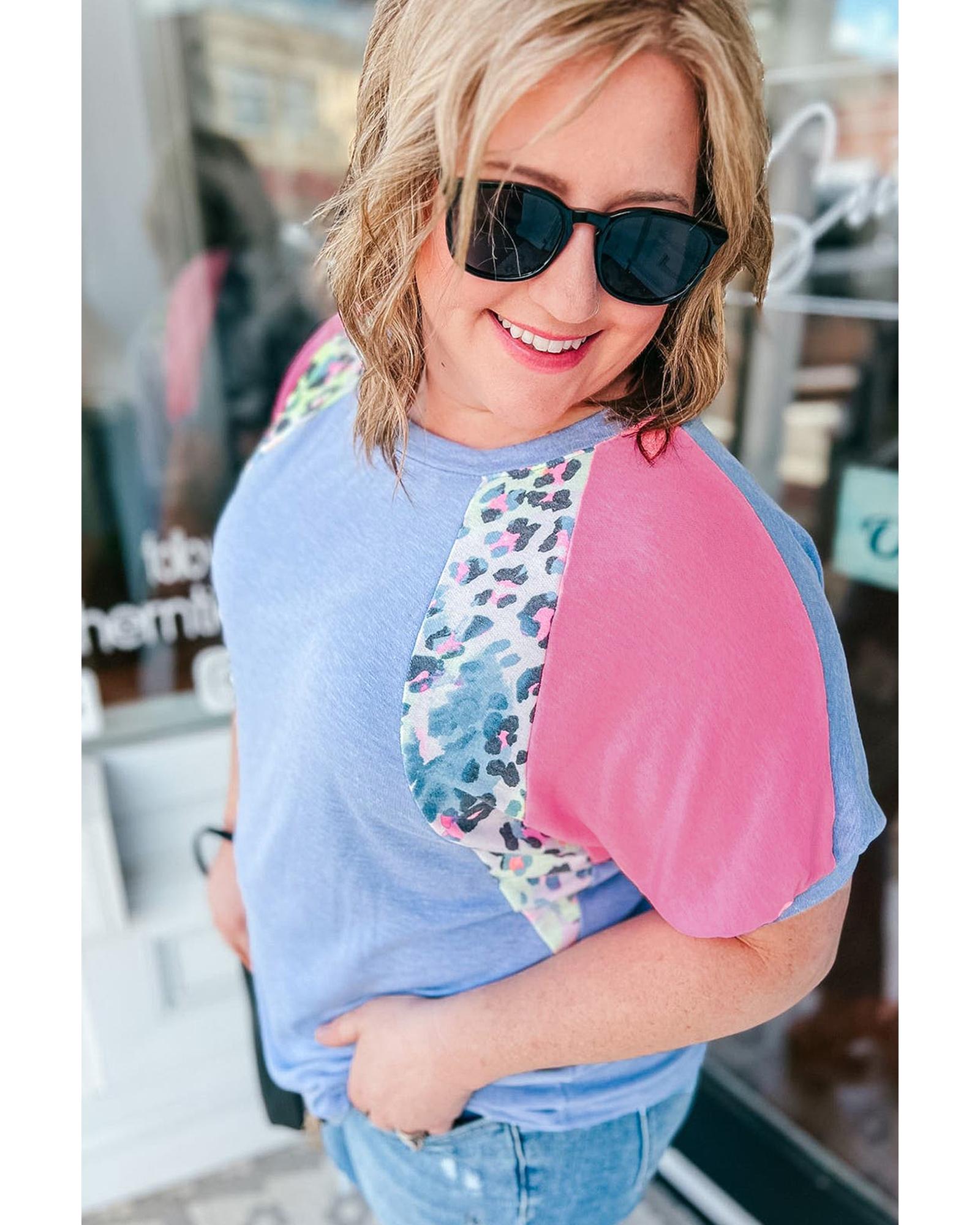 Sky Blue Leopard Print Patch Colorblock Plus Size T Shirt – 2X
