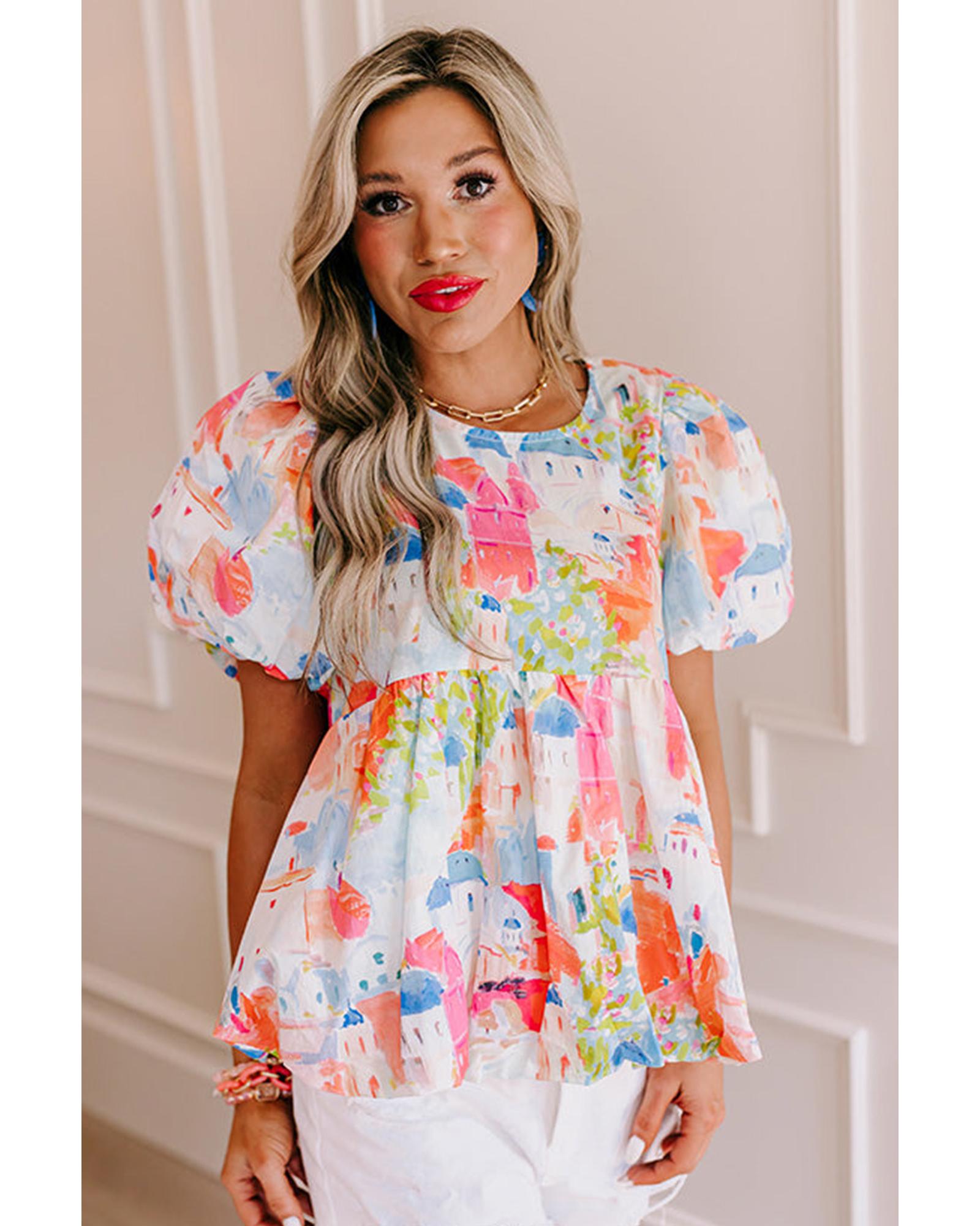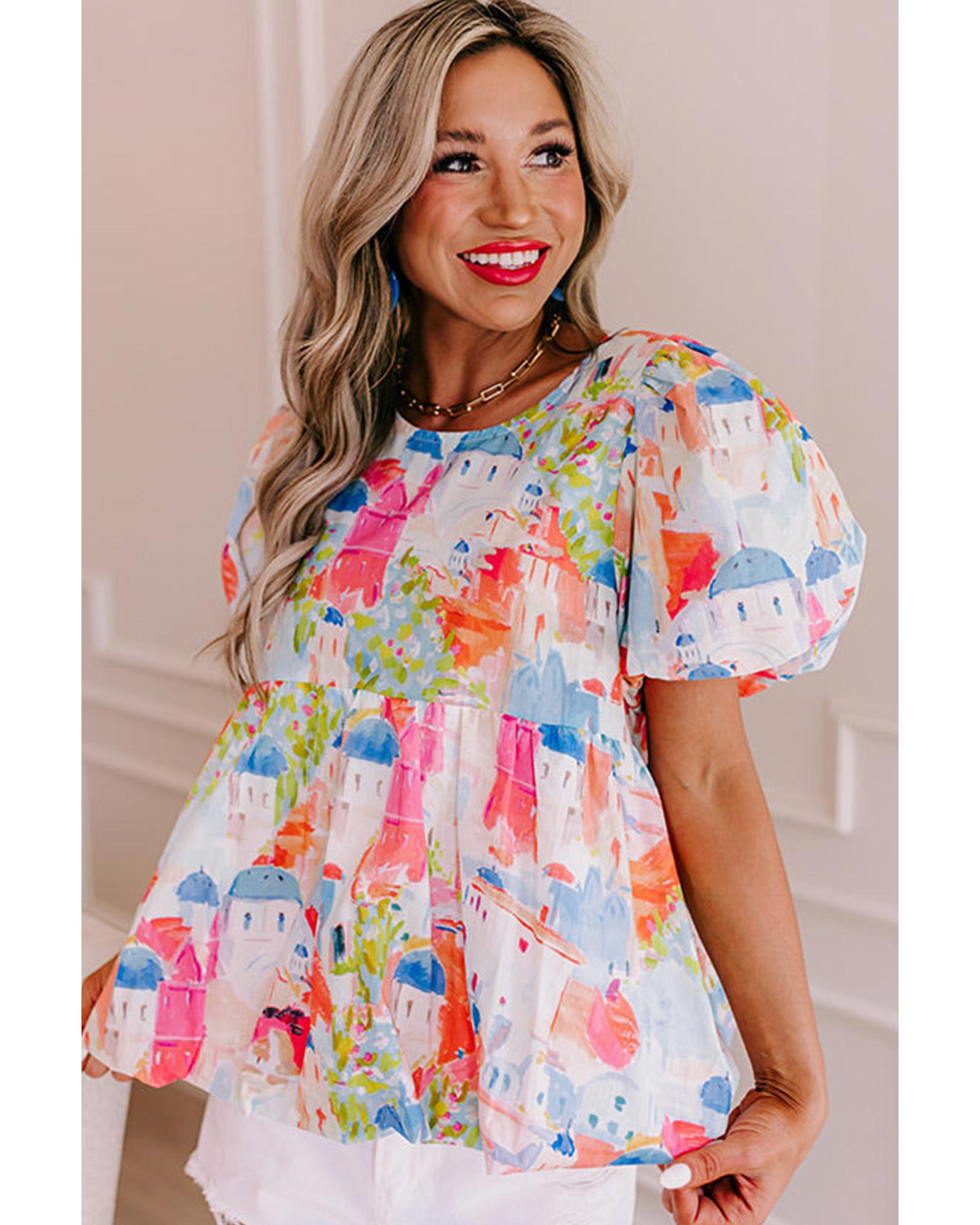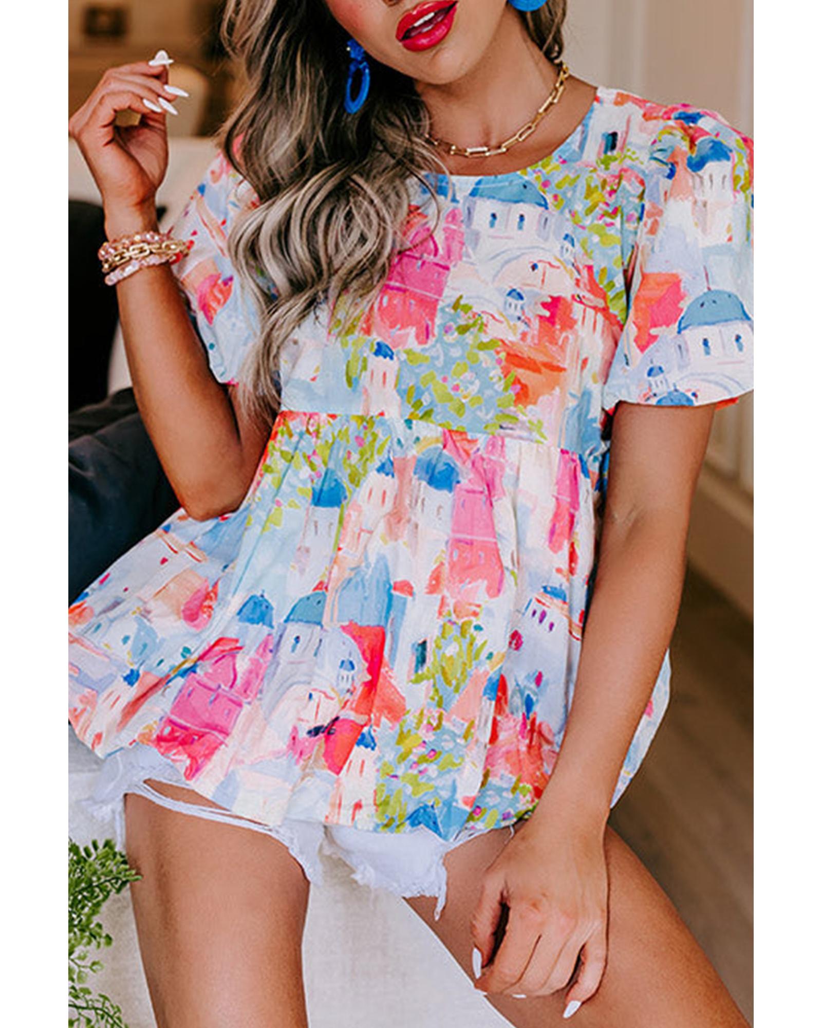 Blue Floral Color Block Patchwork Ruffled Hem Round Neck Blouse - L