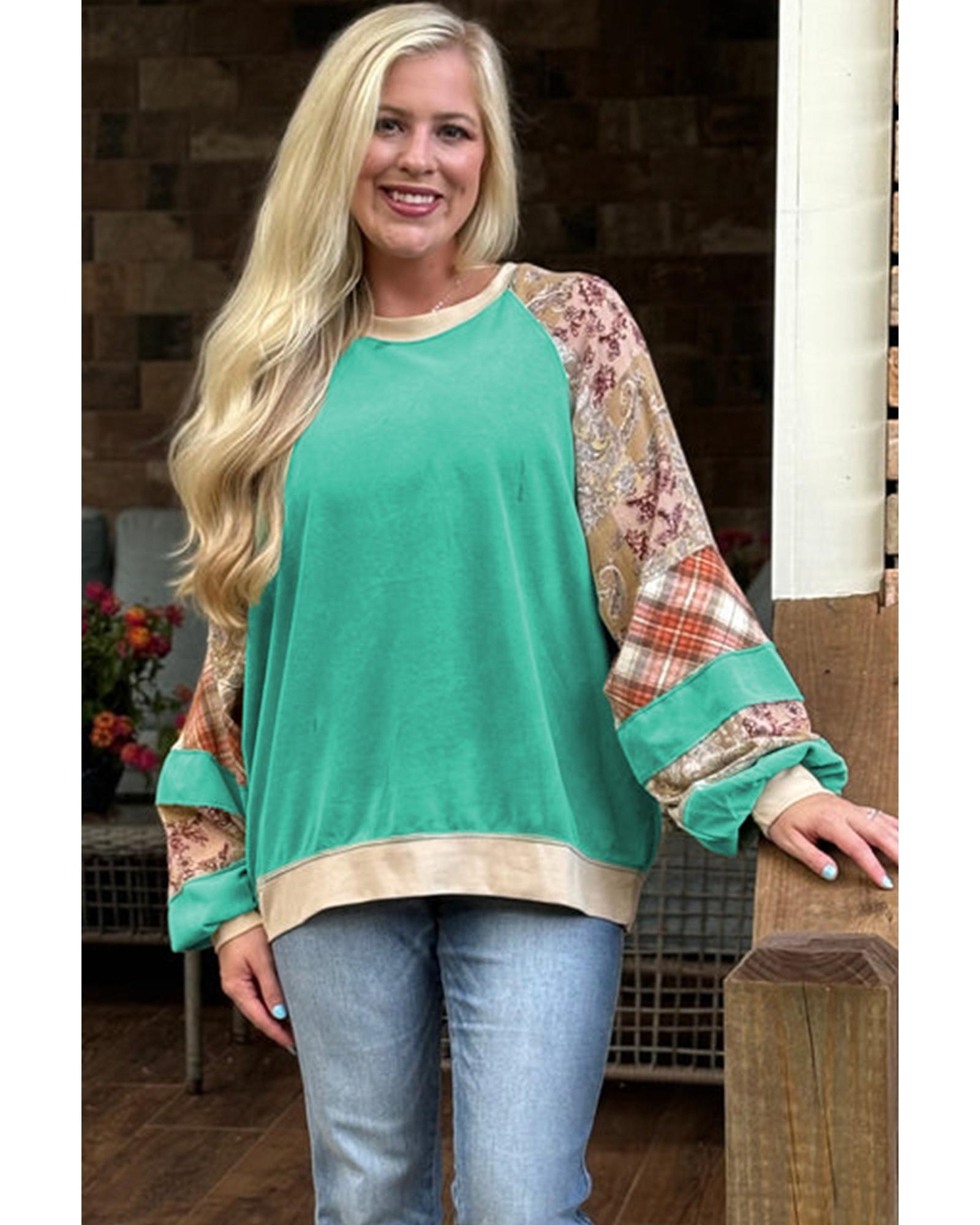 Sky Blue Plus Size Plaid Floral Patchwork Raglan Sleeve Sweatshirt – 1X