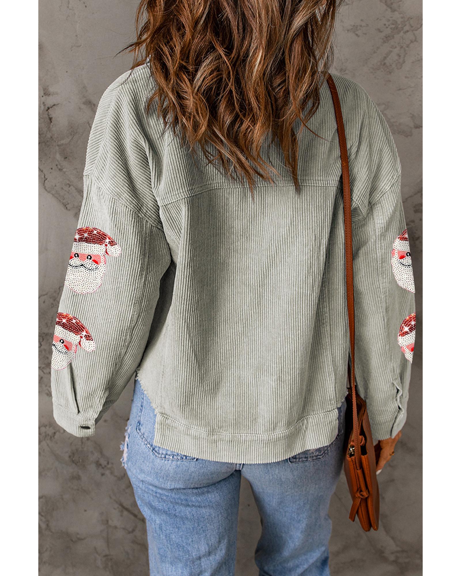 Sky blue sequined Santa Claus flap pocket corduroy jacket Unique Santa Claus print on the flap pocket Made from high - quality corduroy fabric Comfortable and durable Available in multiple sizes Perfect for adding a touch of holiday cheer to your outfit Versatile and easy to style with jeans or trousers Ideal for festive occasions or everyday wear