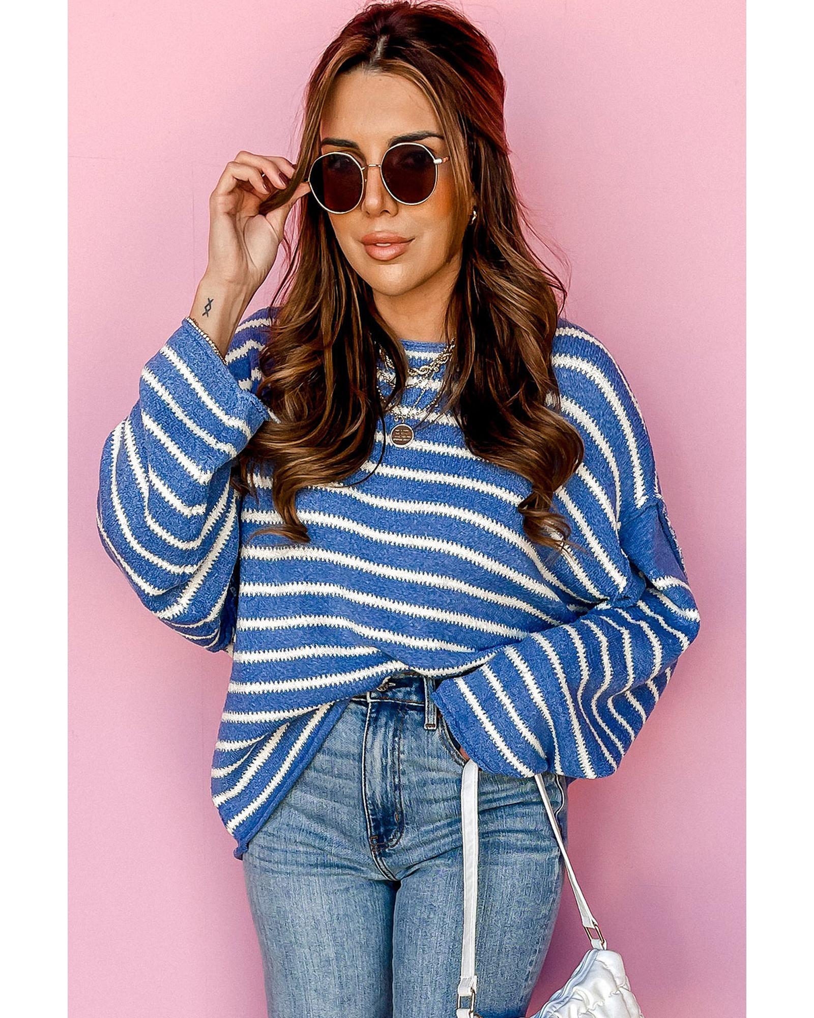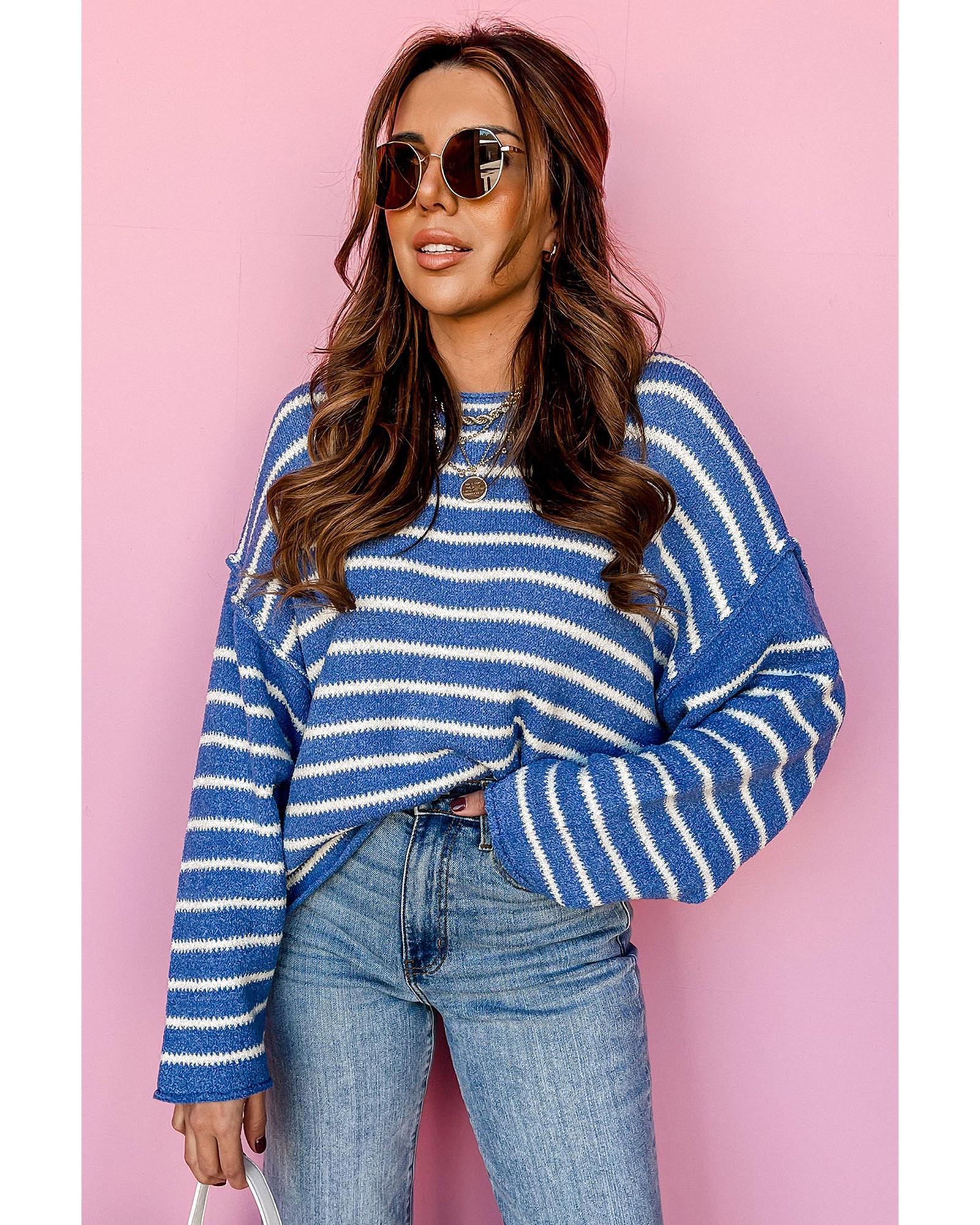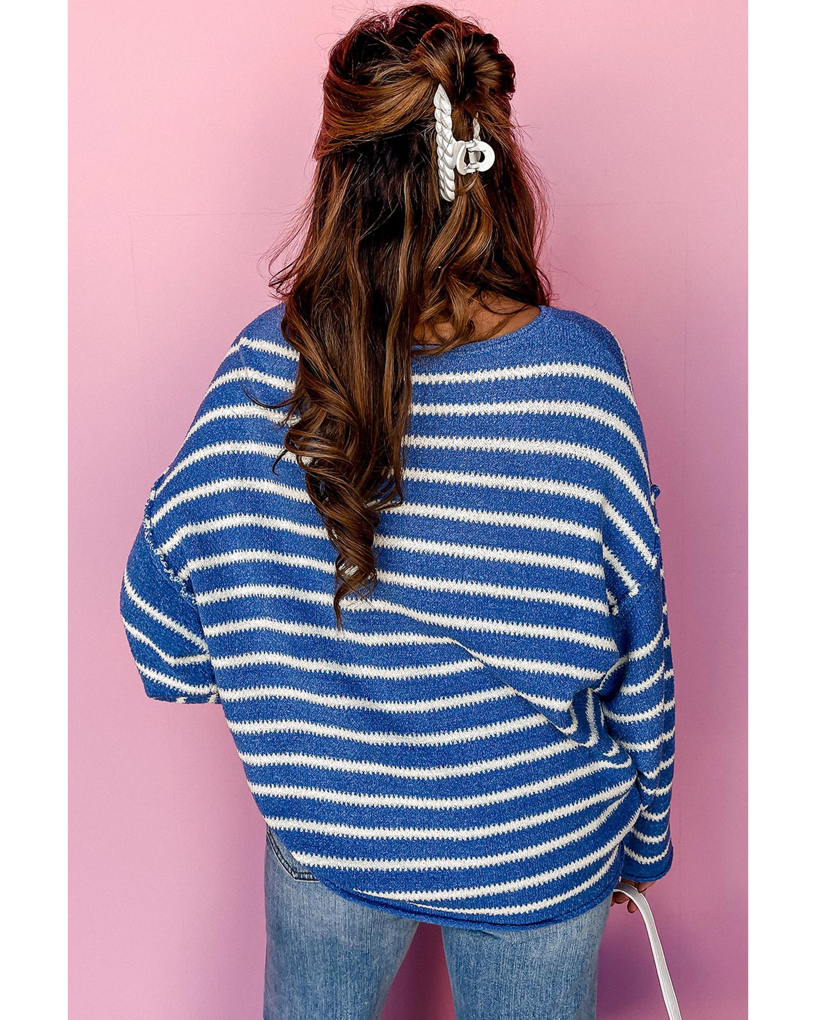 Sky Blue Stripe Drop Shoulder O Neck Plus Size Sweater – 1X