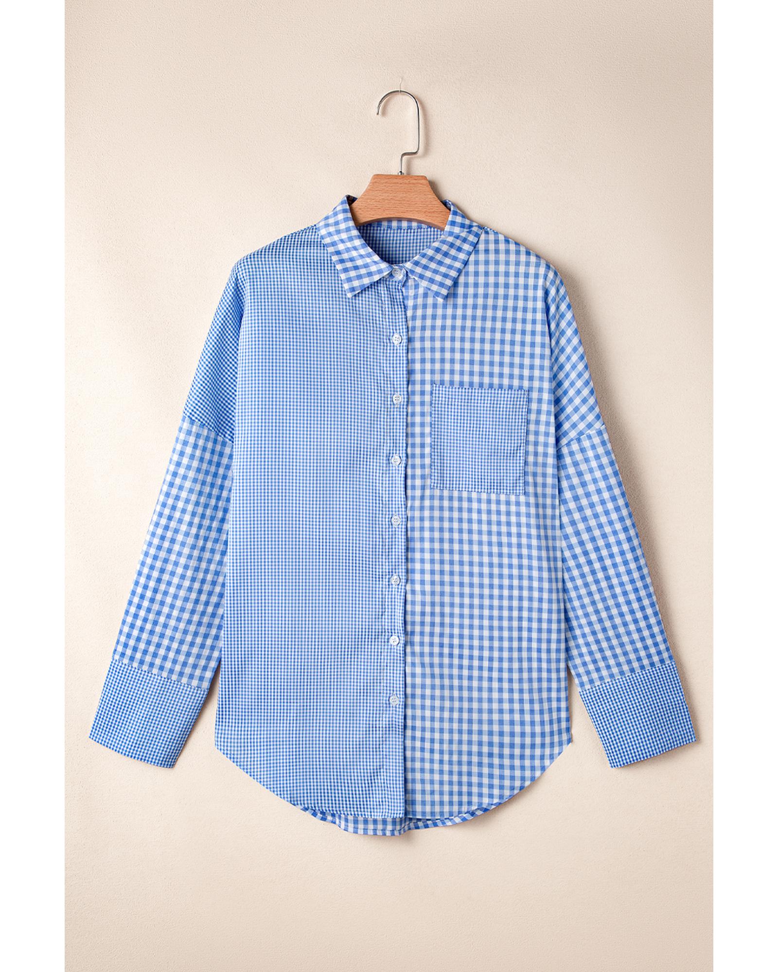 Sky Blue Stripe Plaid Patchwork Button up Long Sleeve Shirt – L