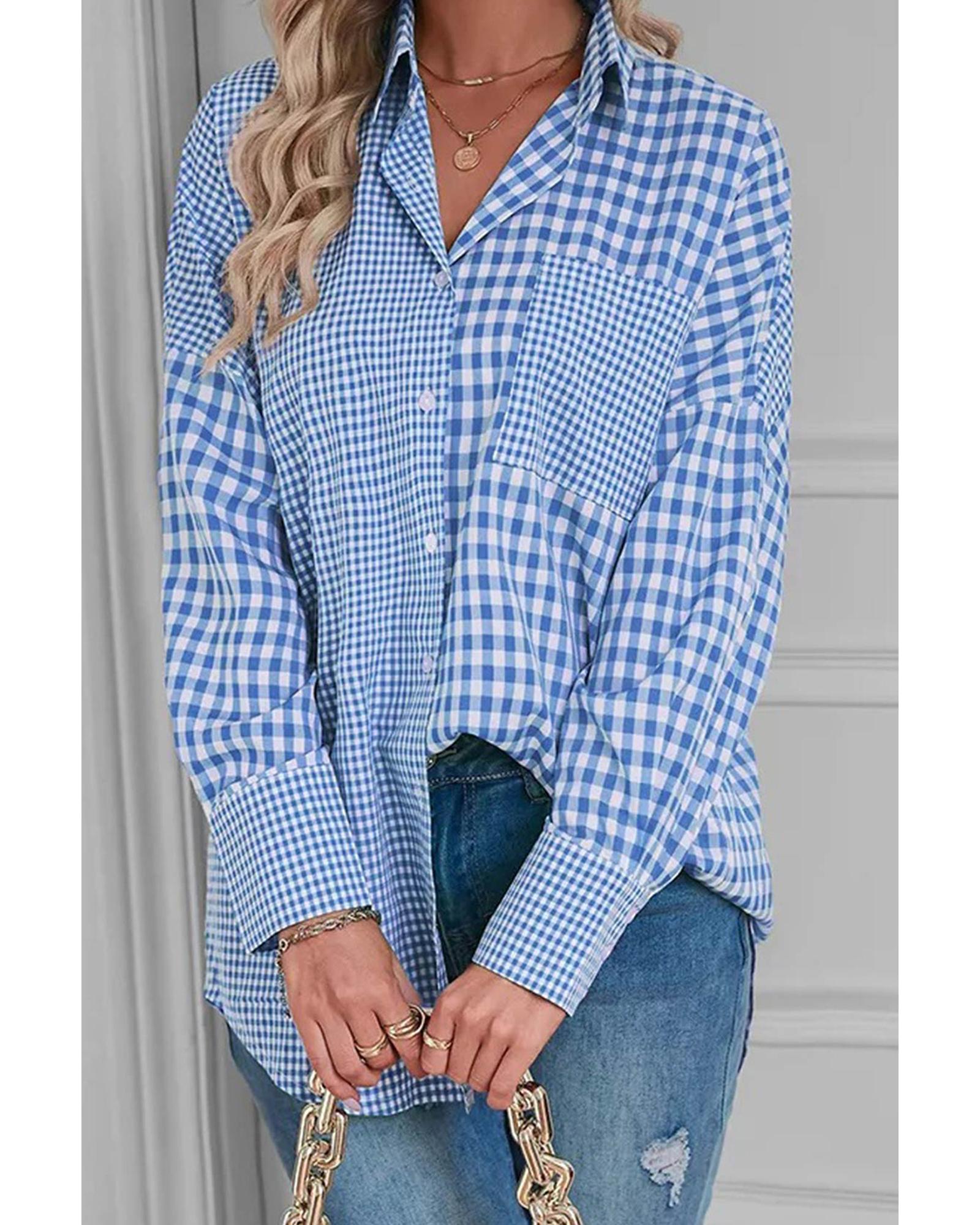 Sky Blue Stripe Plaid Patchwork Button up Long Sleeve Shirt – S