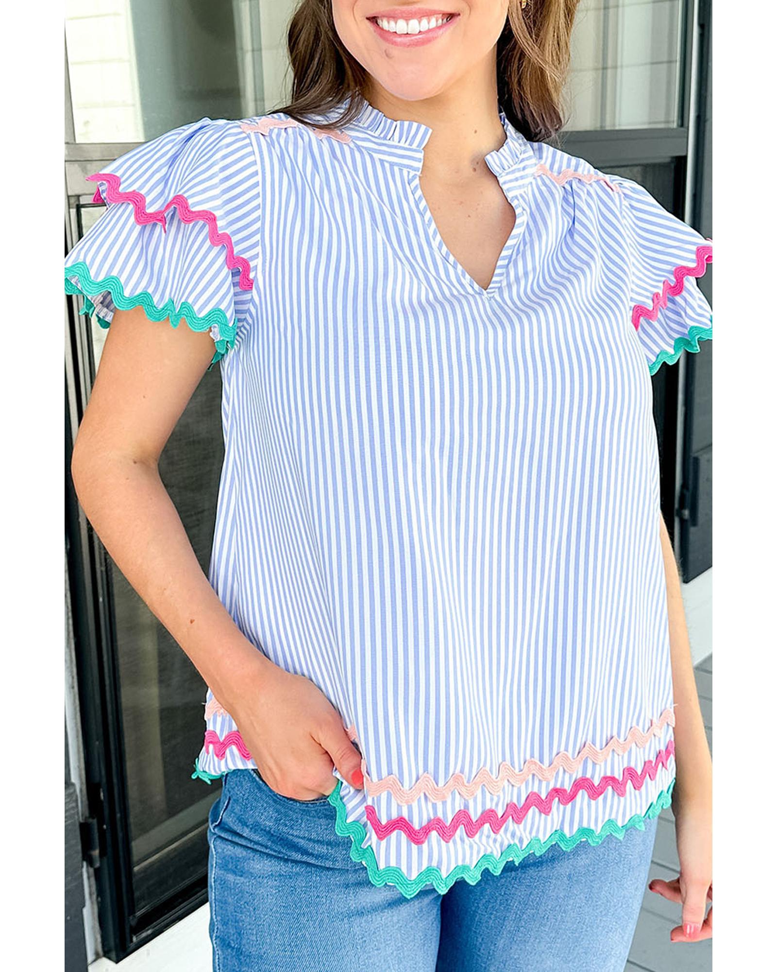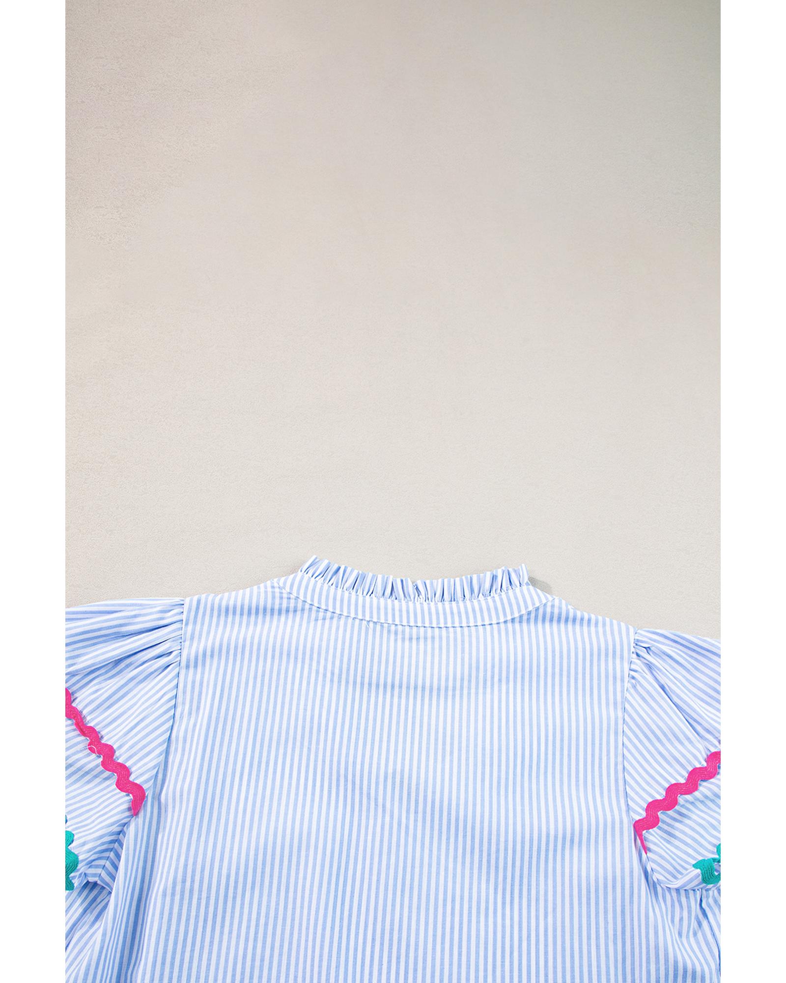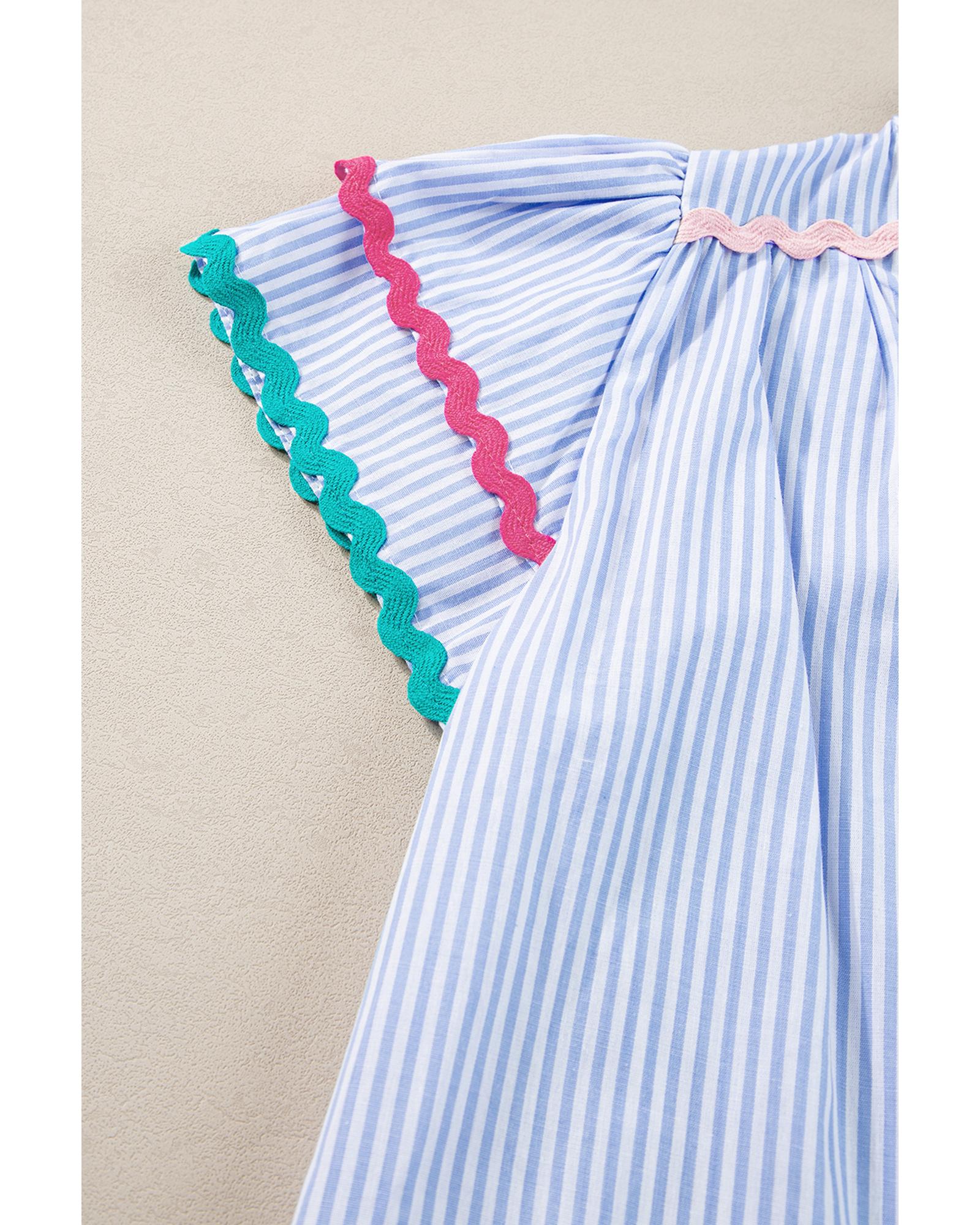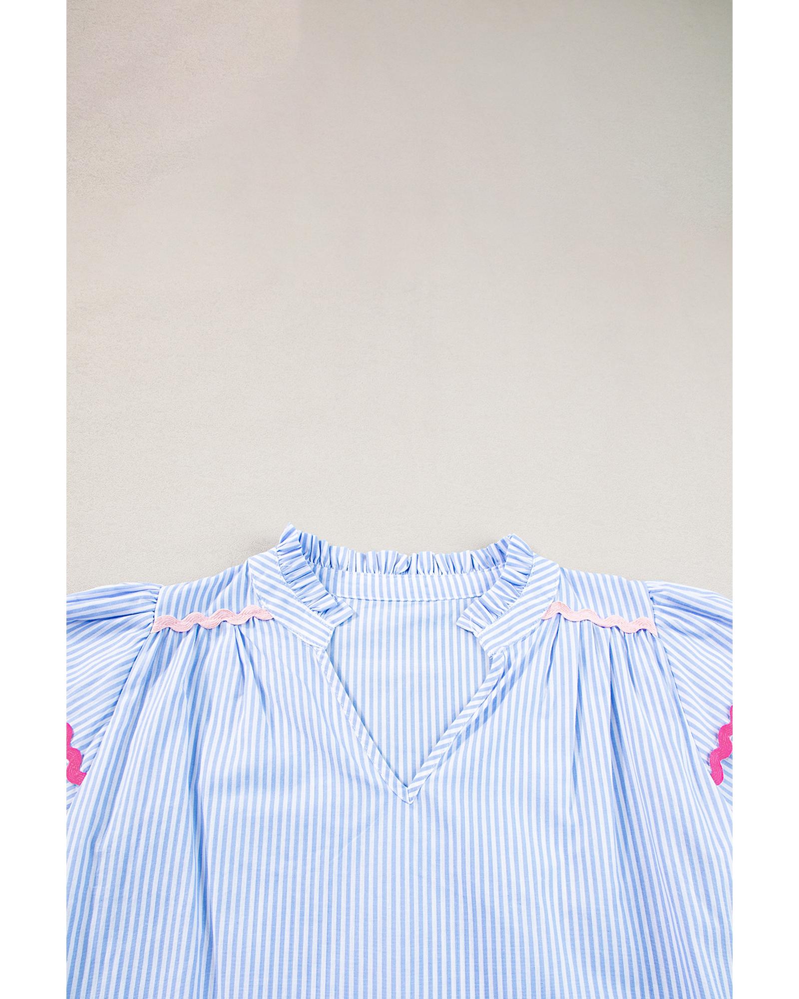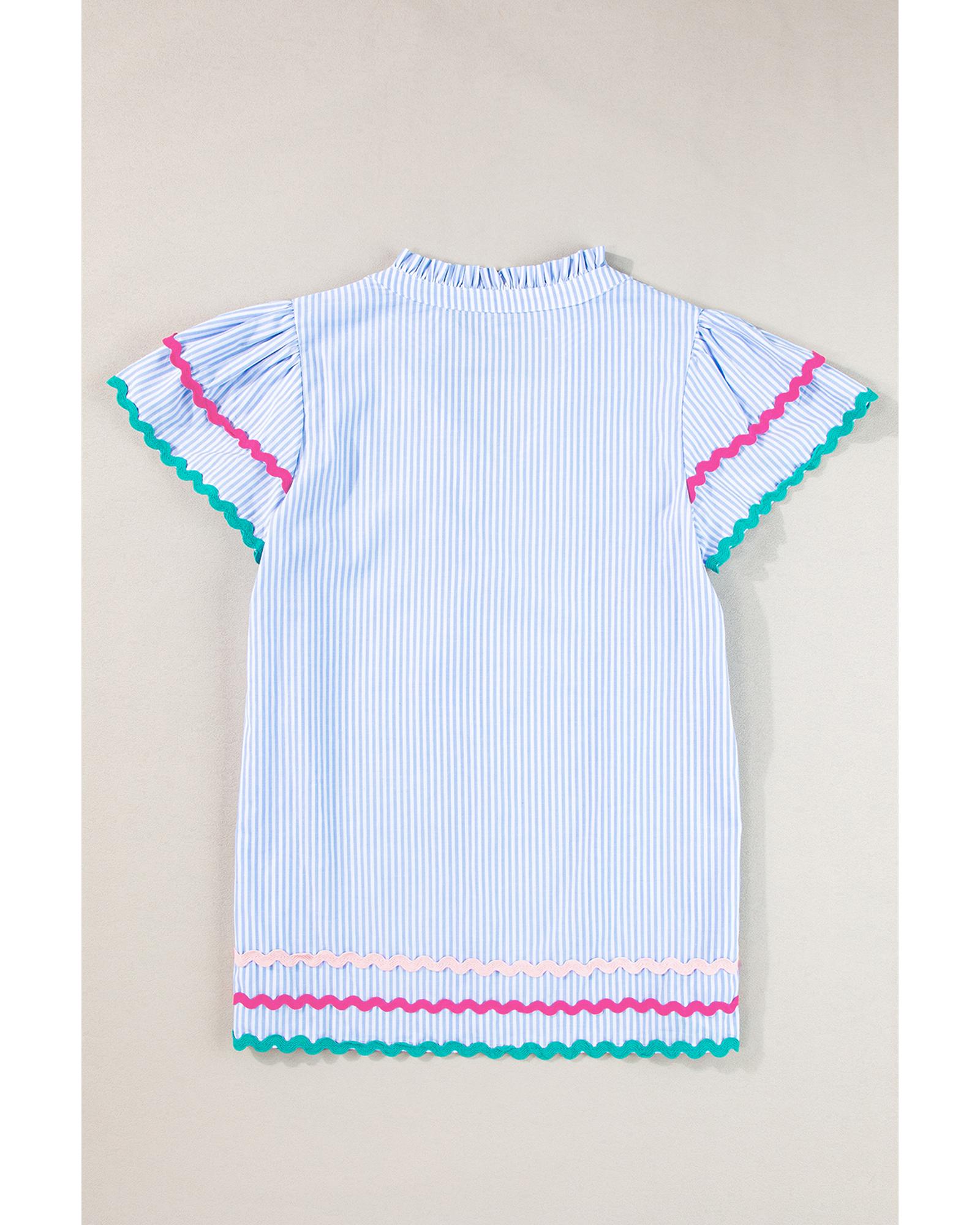Sky Blue Stripe Ricrac Trim Split Neck Striped Ruffled Sleeve Blouse – S