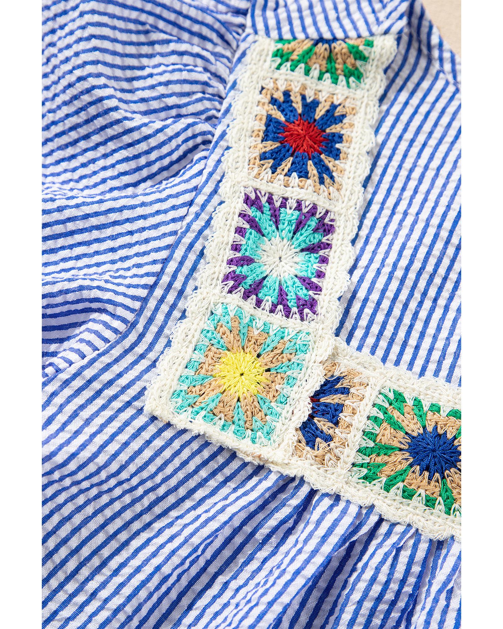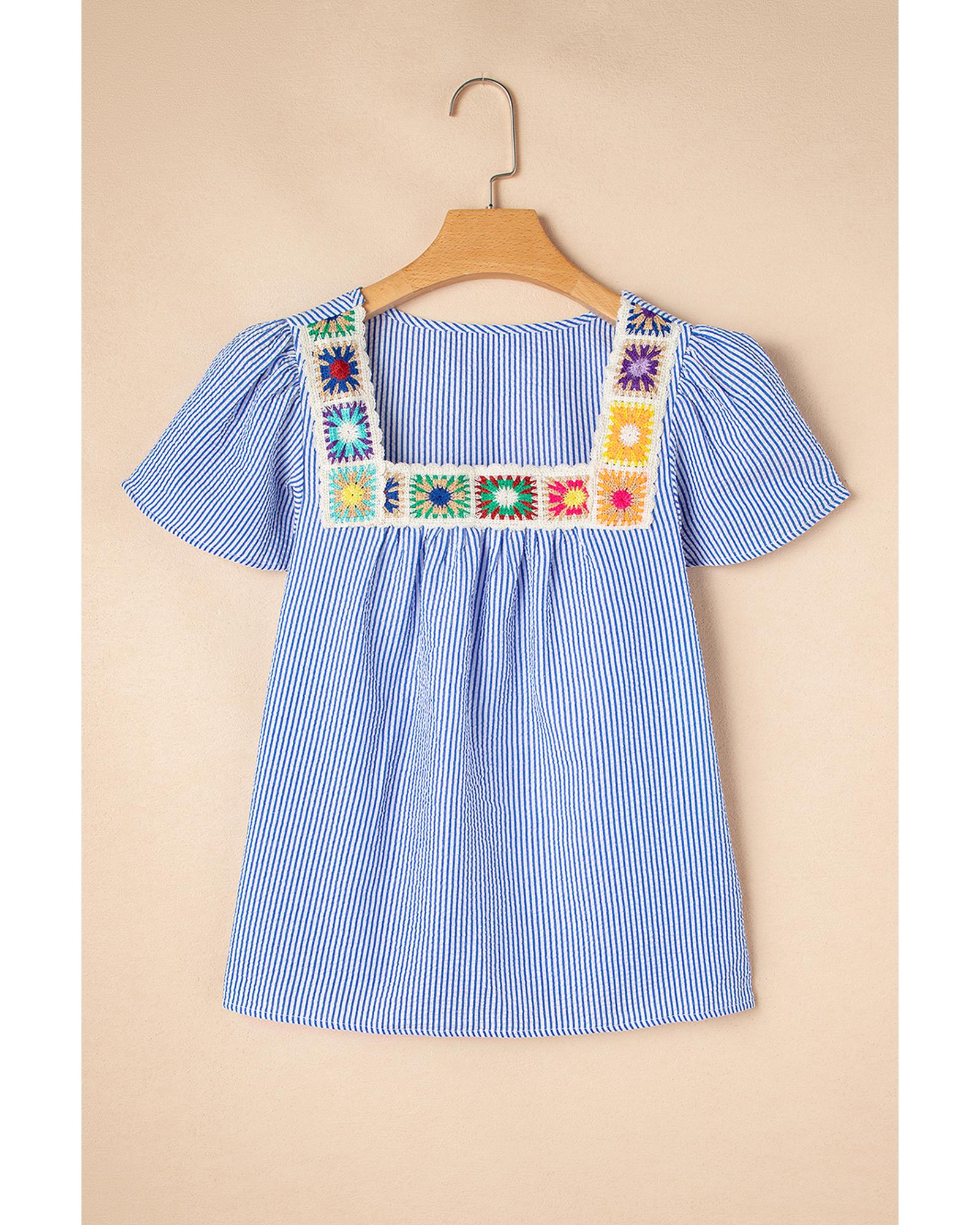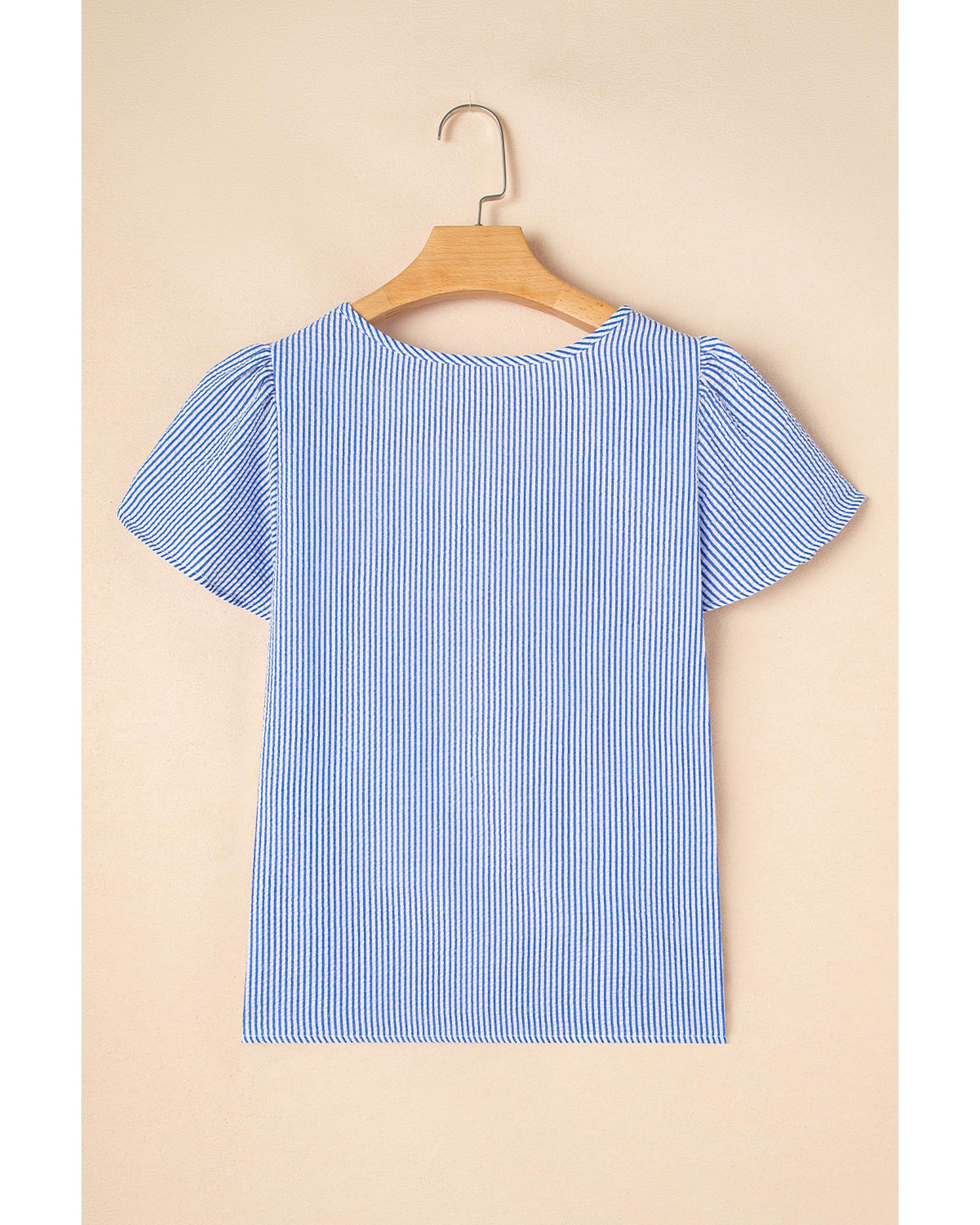 Sky Blue Stripe Textured Ruffle Short Sleeve Boho Detail Square Neck Blouse – S