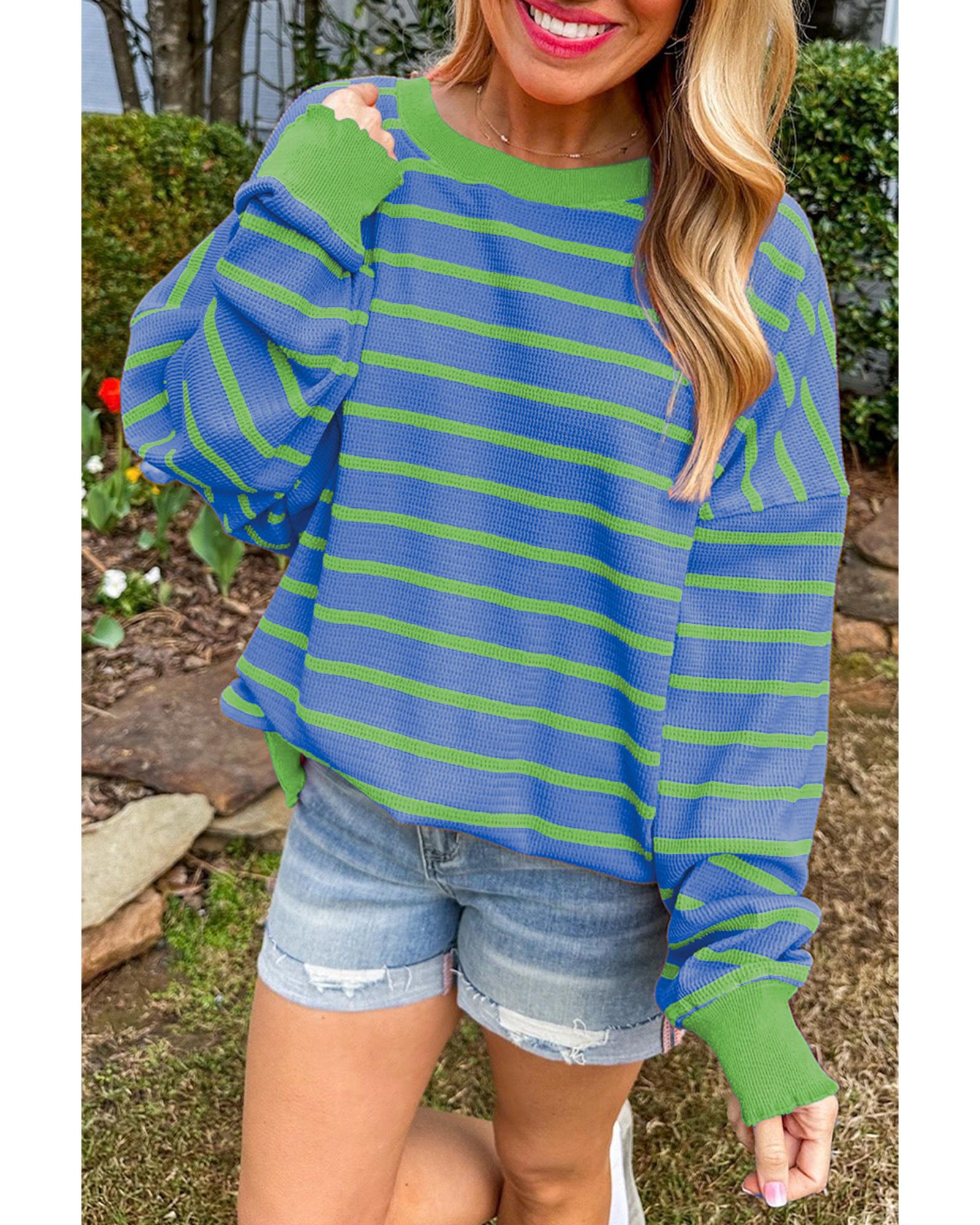 Sky Blue Stripe Trimmed Round Neck Drop Shoulder Loose Sweater – M