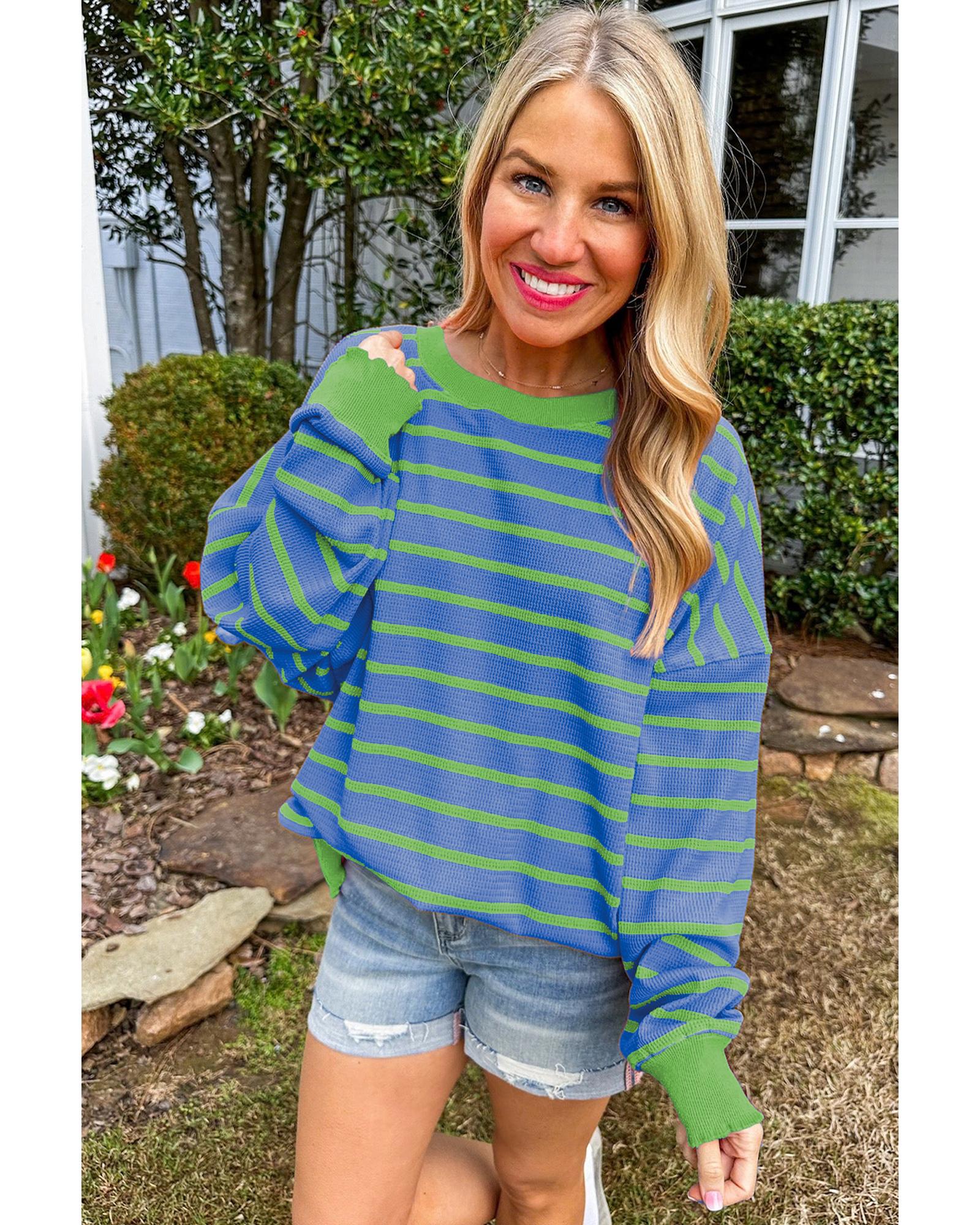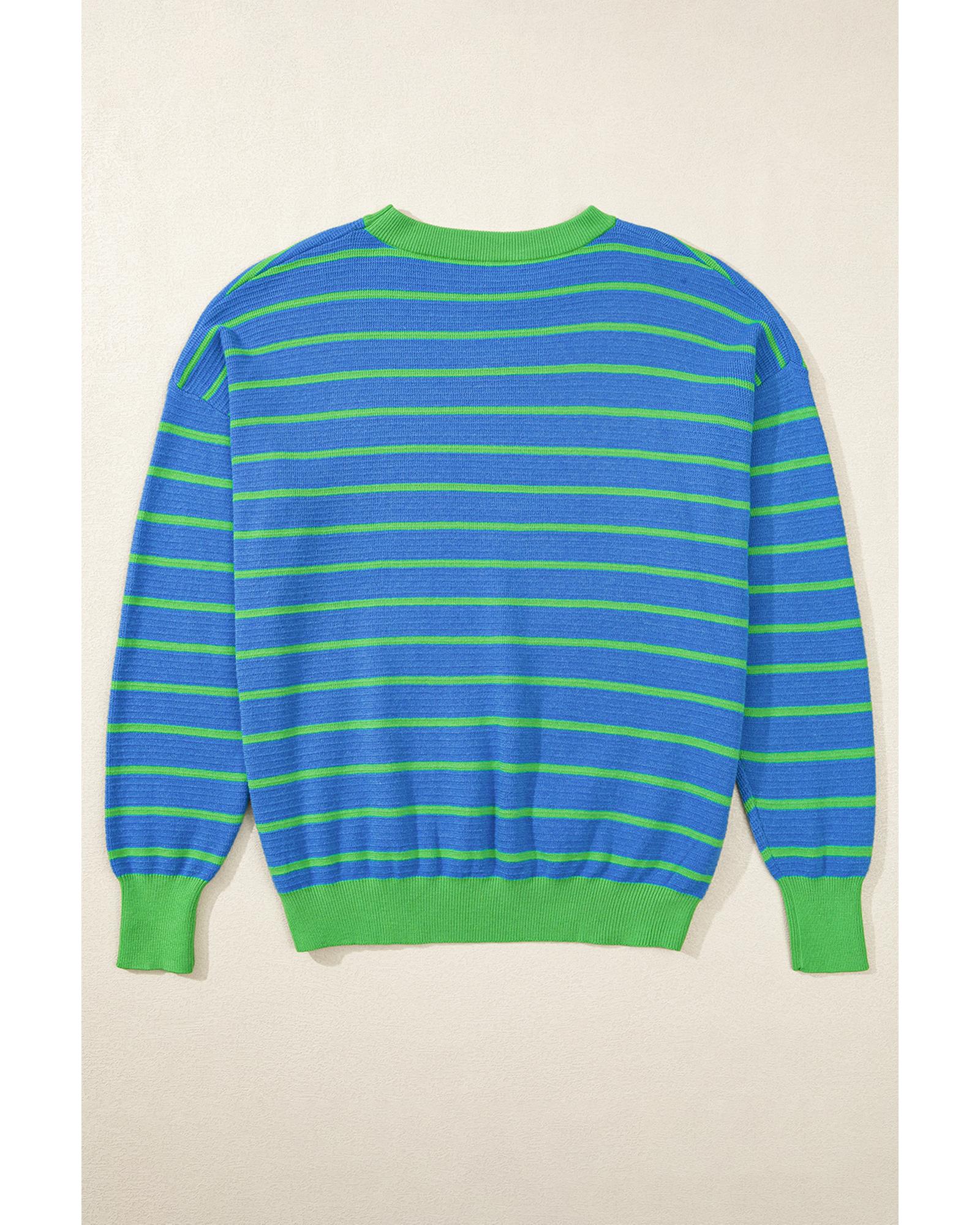 Sky Blue Stripe Trimmed Round Neck Drop Shoulder Loose Sweater – XL