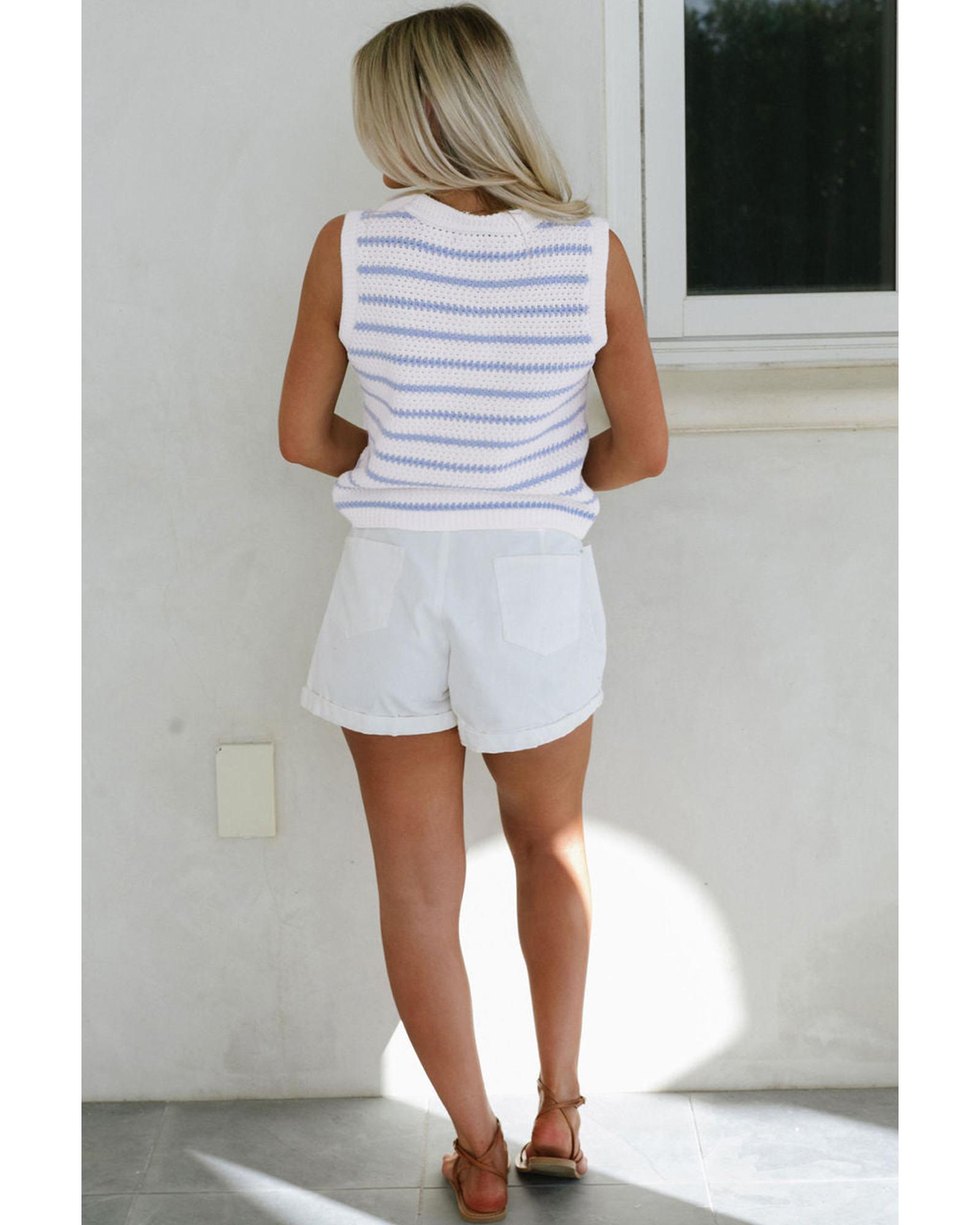 Sky Blue Stripe V Neck Gold Buttons Elegant Sweater Vest – L