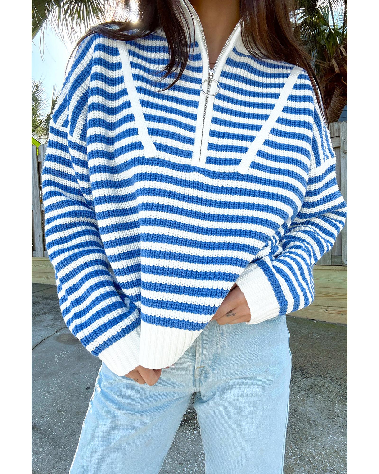 - Sky Blue Stripe Zip up Collar Drop Shoulder Sweater