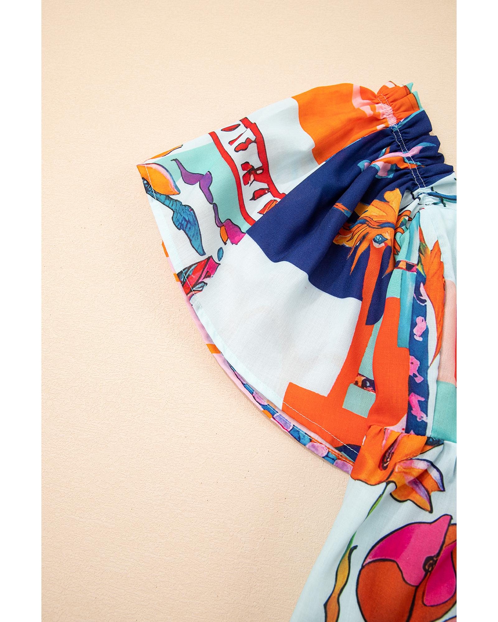 Sky Blue Tropical Printed Square Neck Flutter Sleeve Babydoll Blouse – XL