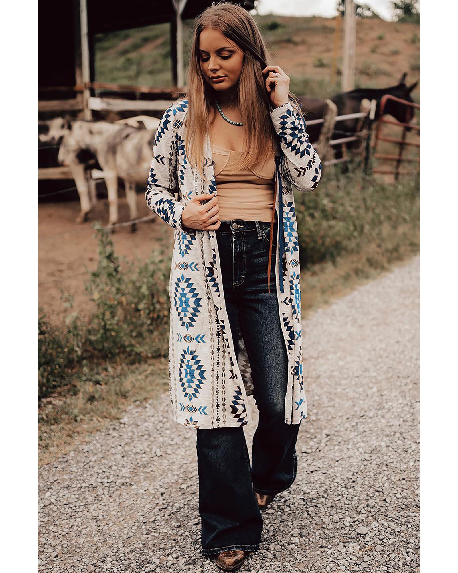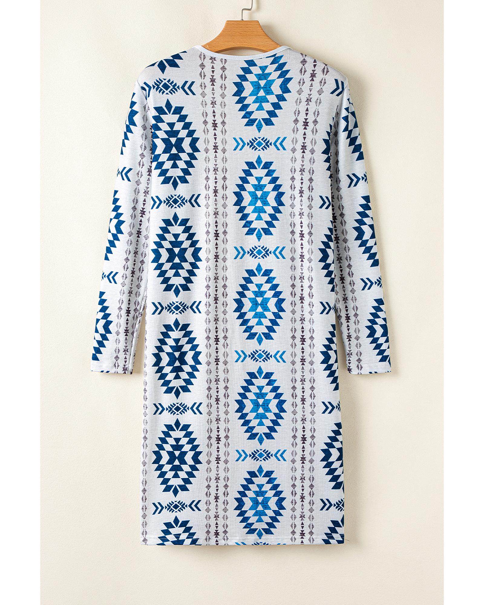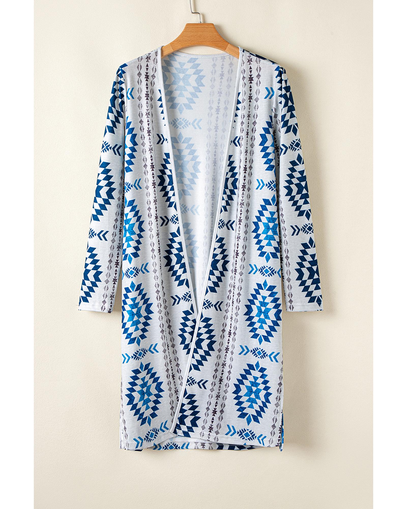 Sky Blue Western Aztec Printed Open Front Long Cardigan – S