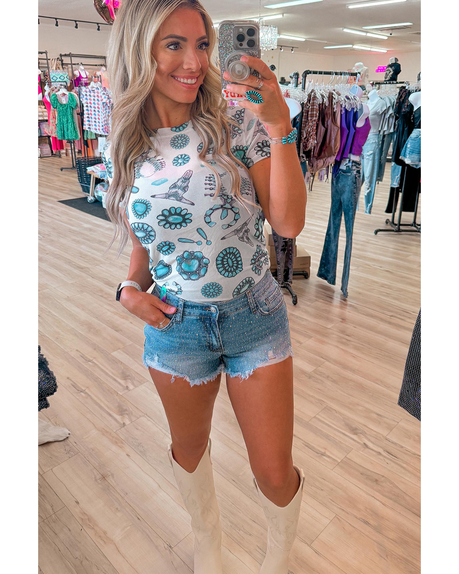 Sky Blue Western Turquoise Printed Crewneck Slim Fit Tee – S