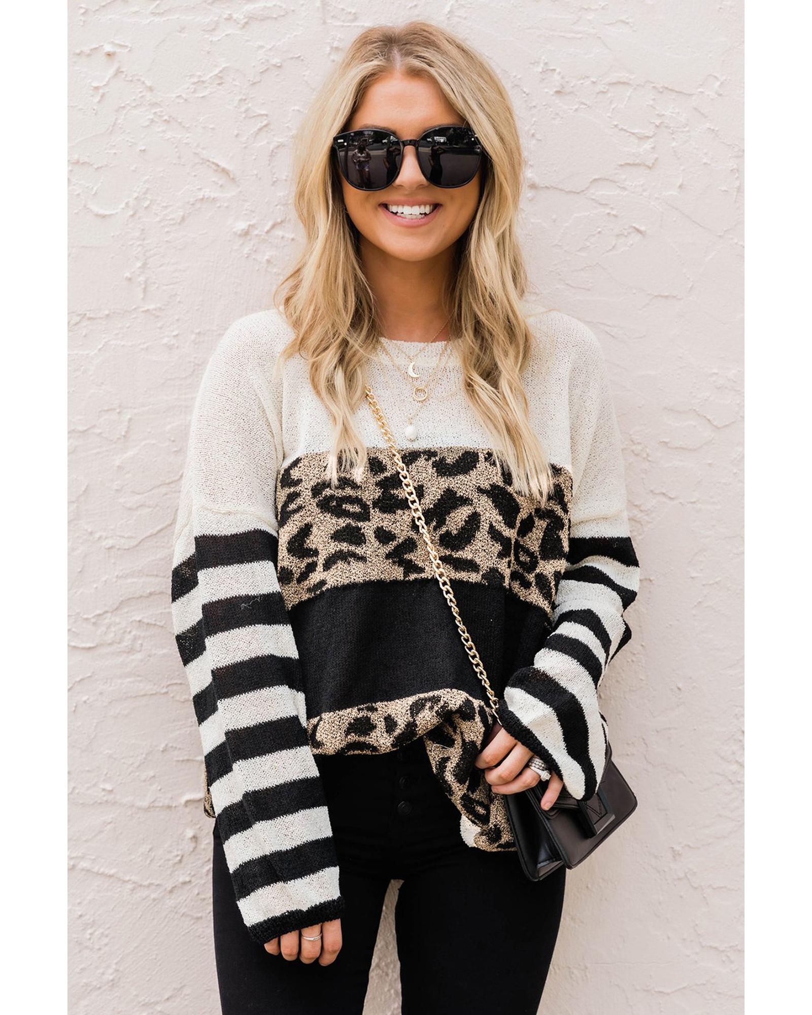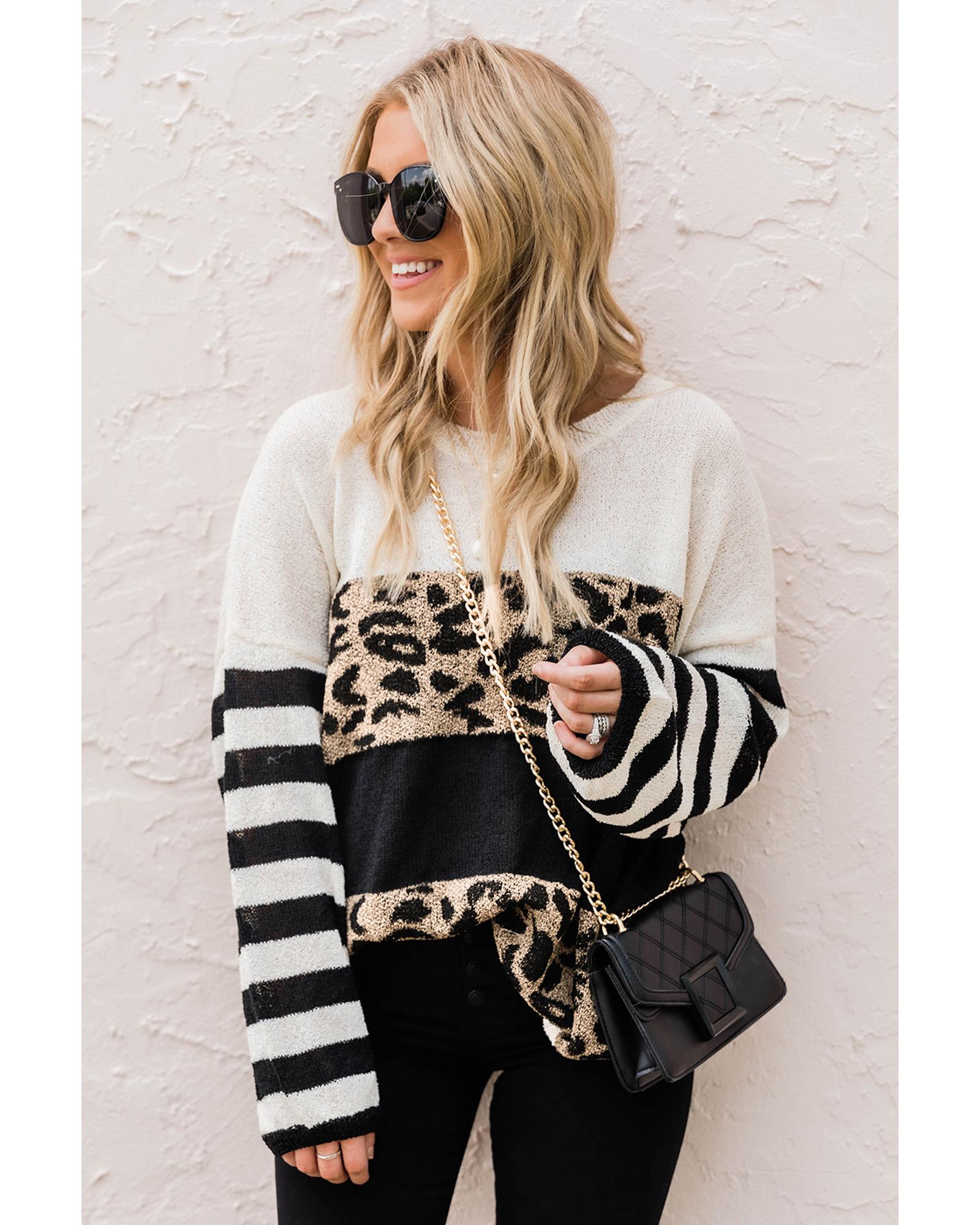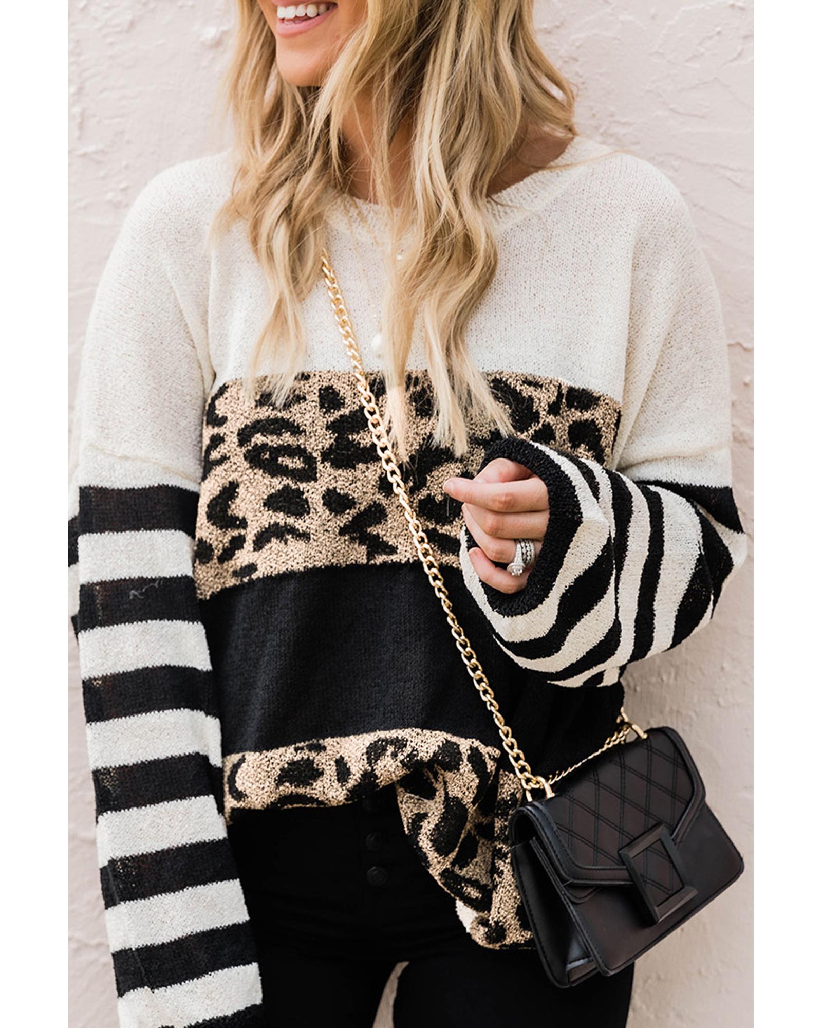 • shoulder leopard striped colorblock sweater Round neck drop shoulder long sleeves and loose fit style Pairs well with any pants skirts bags and shoes Made with high