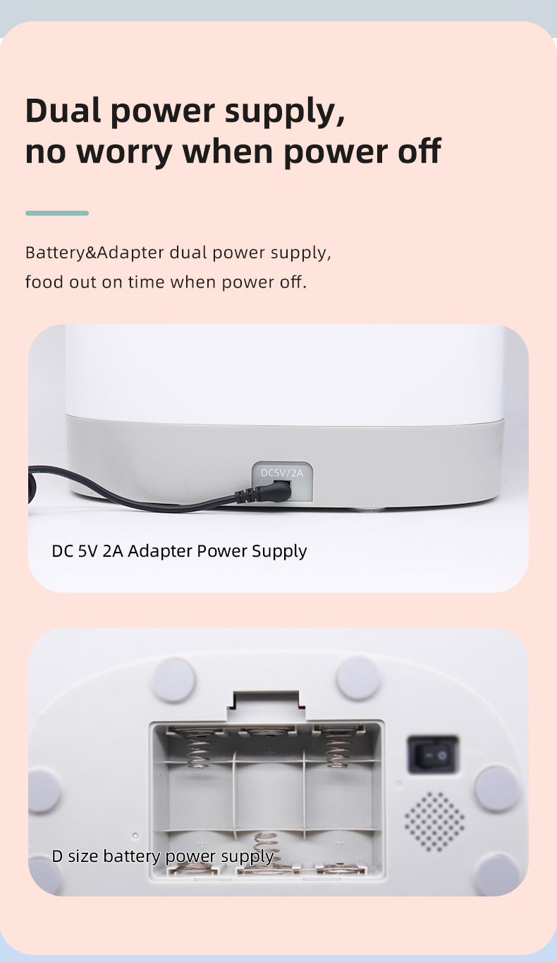 - Runs on DC Power Cable 5V/2A (adaptor included) – the feeder is a power adapter operated with an optional battery backup (requires C battery x 3, not included); if Wi-Fi drops, your pet will still receive the next scheduled feeding