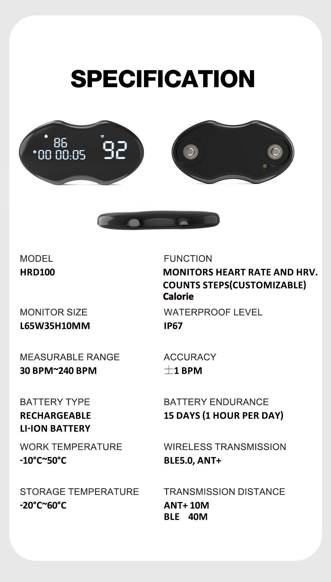 - Transmission Distance: ANT+ up to 10m, BLE up to 40m