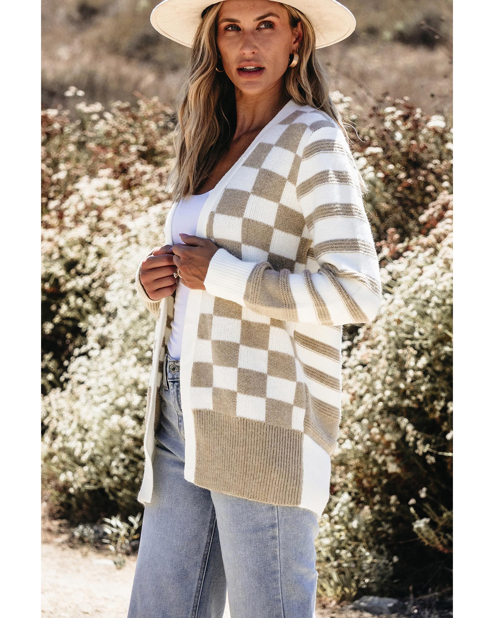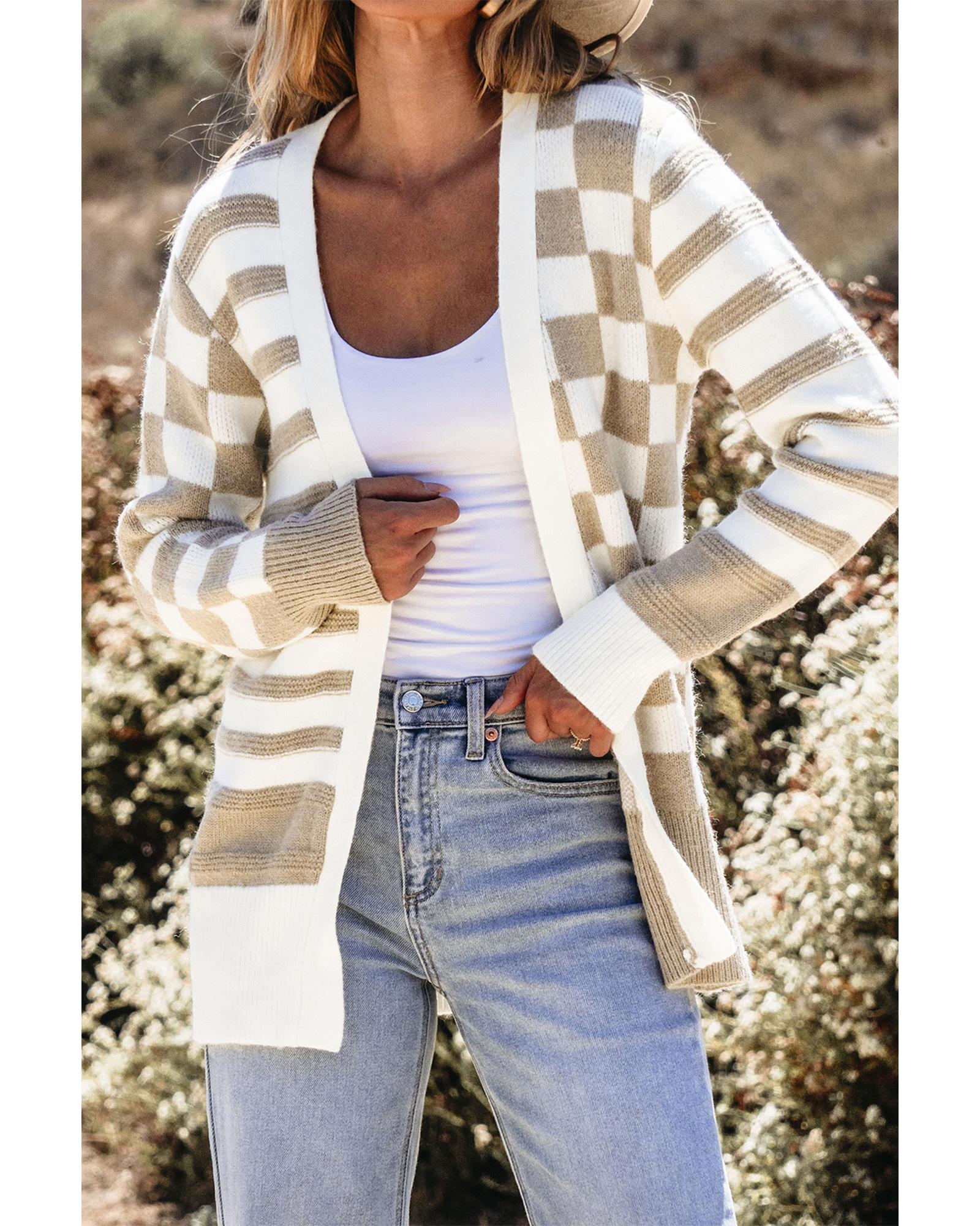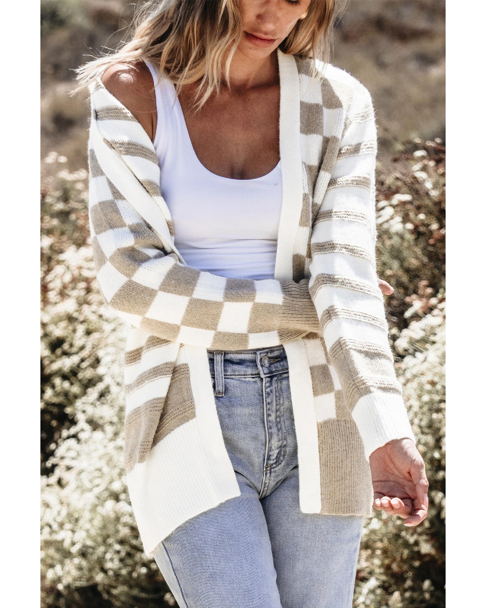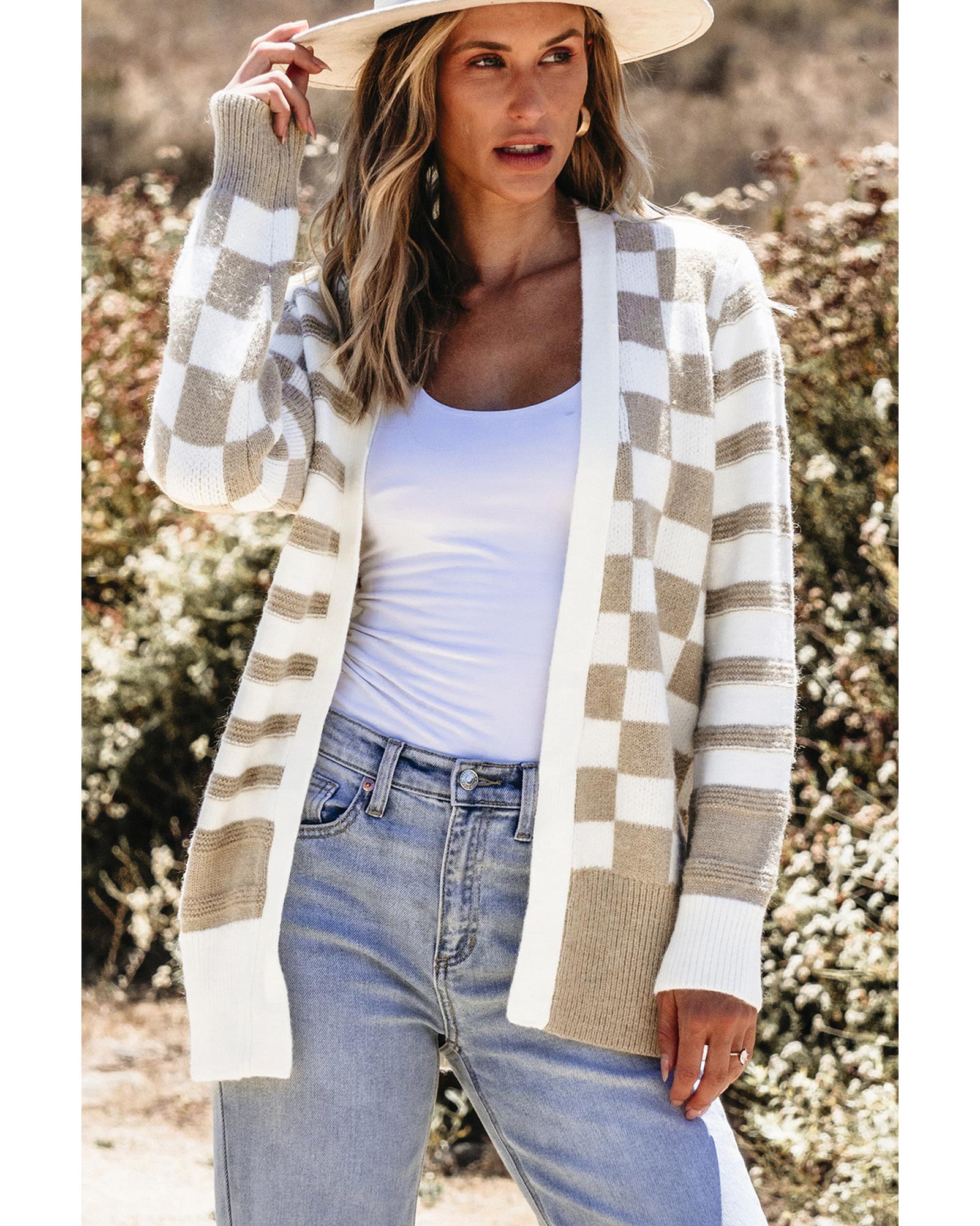 Smoke Gray Gingham Striped Knitted Open Front Cardigan – S