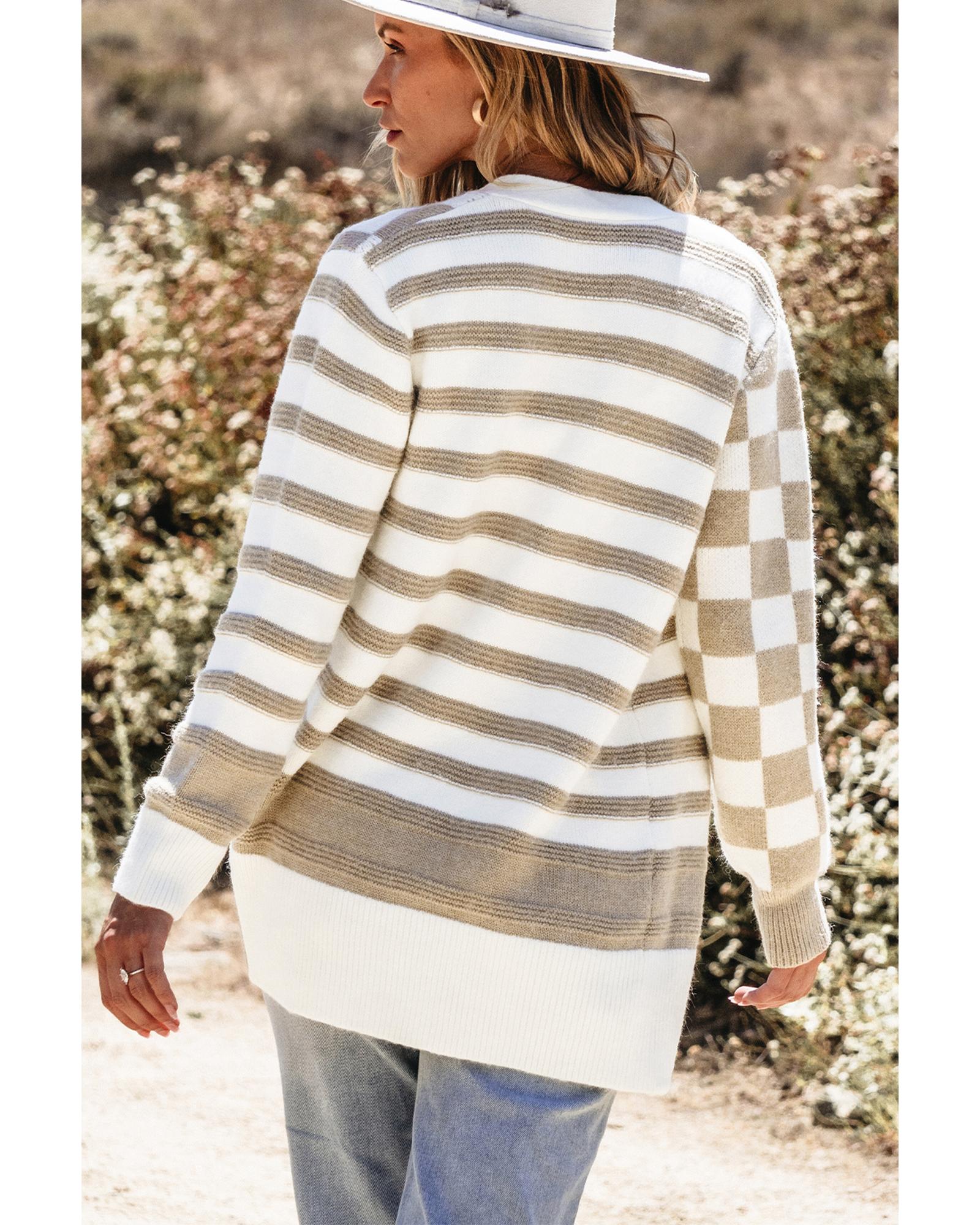 Brown Striped Colorblock V Neck Knitted Sweater - S