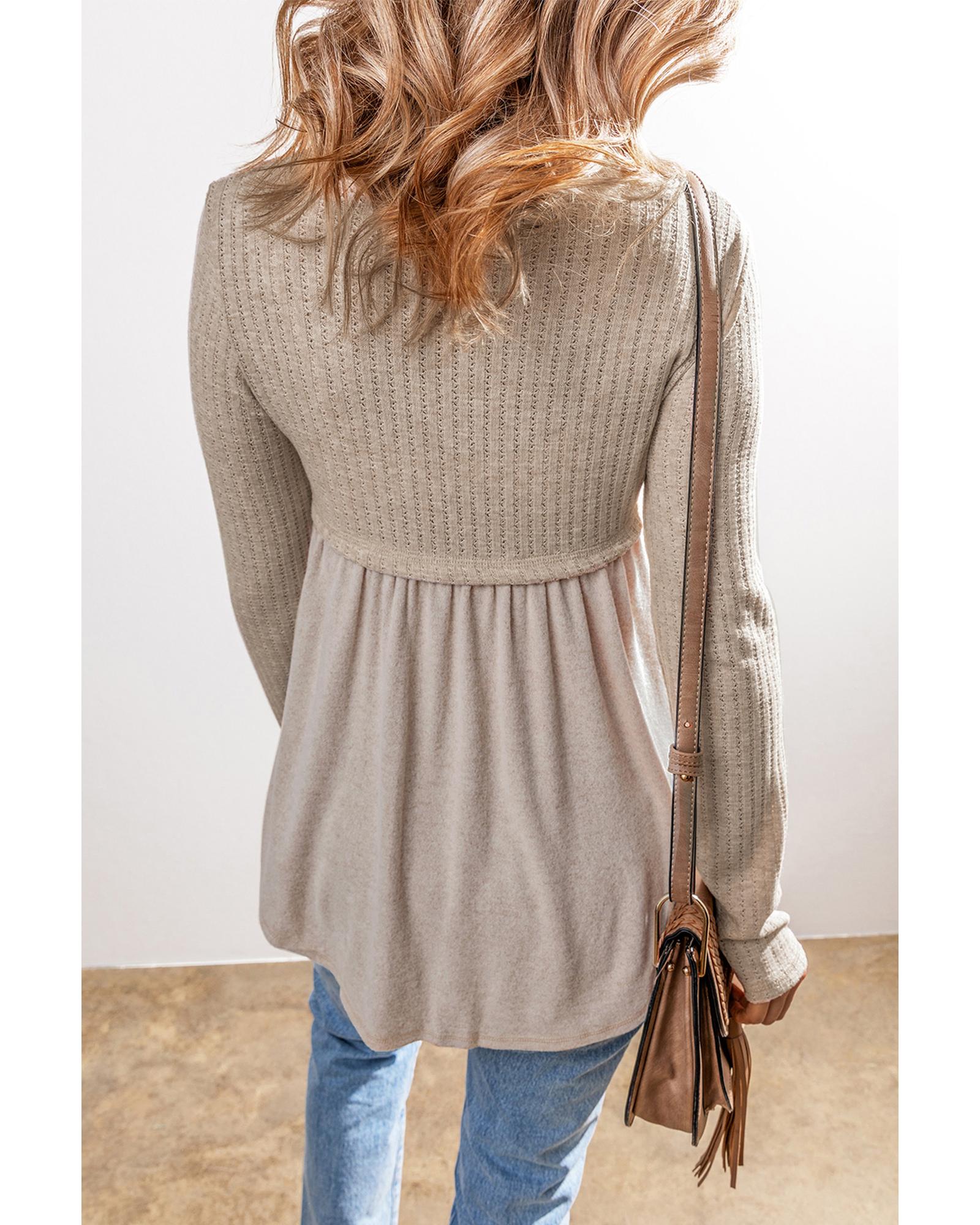 Smoke Gray Textured Long Sleeve V Neck Babydoll Top – S