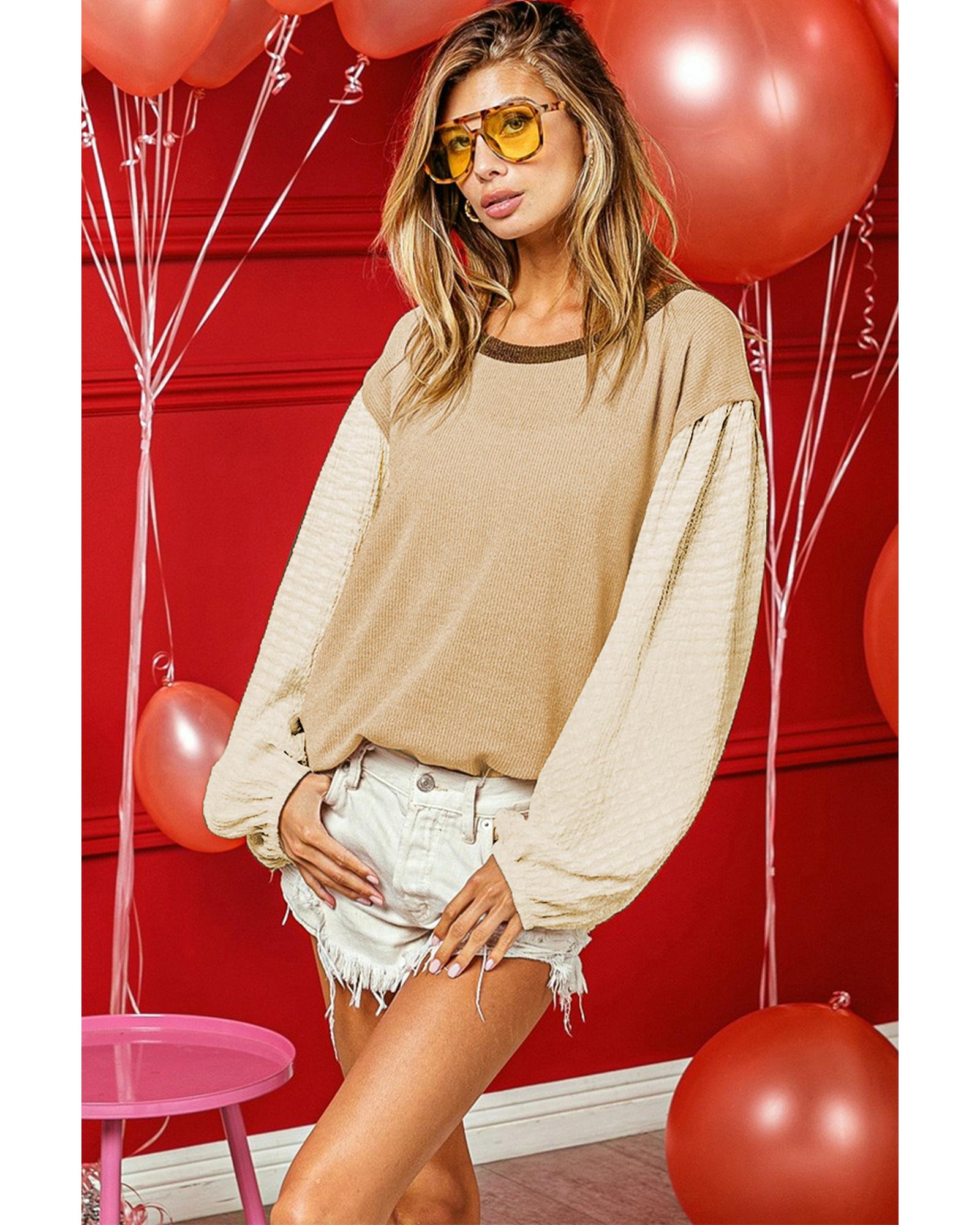 - Smoke Gray Textured Patchwork Crew Neck Puff Sleeves Blouse