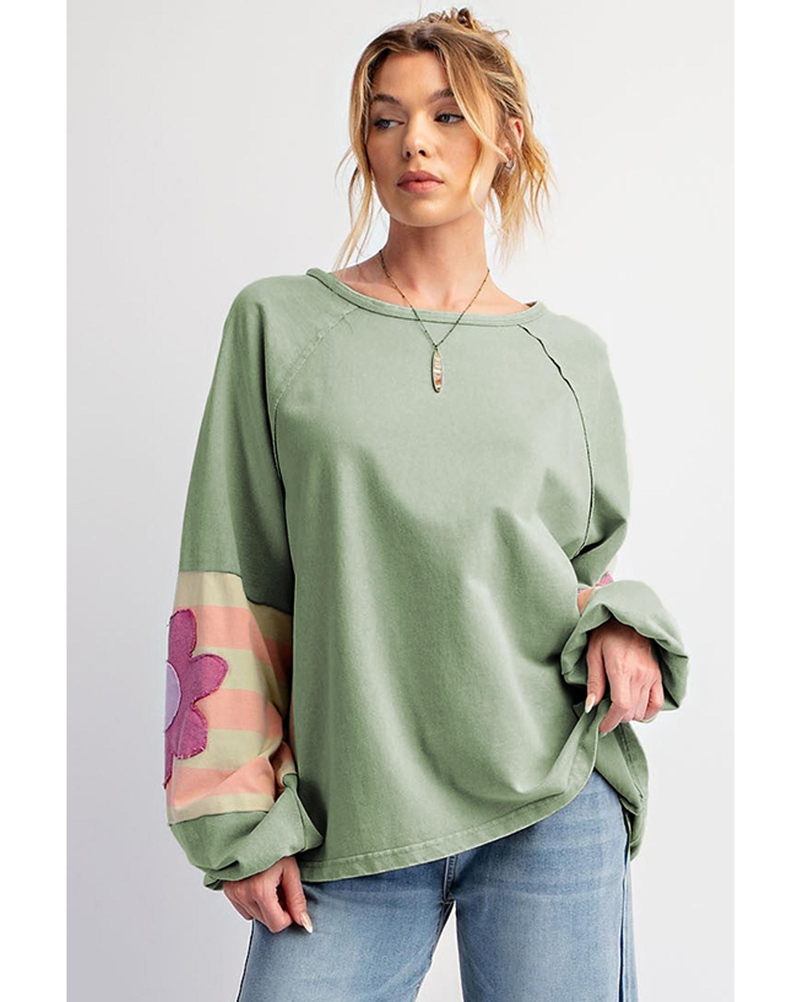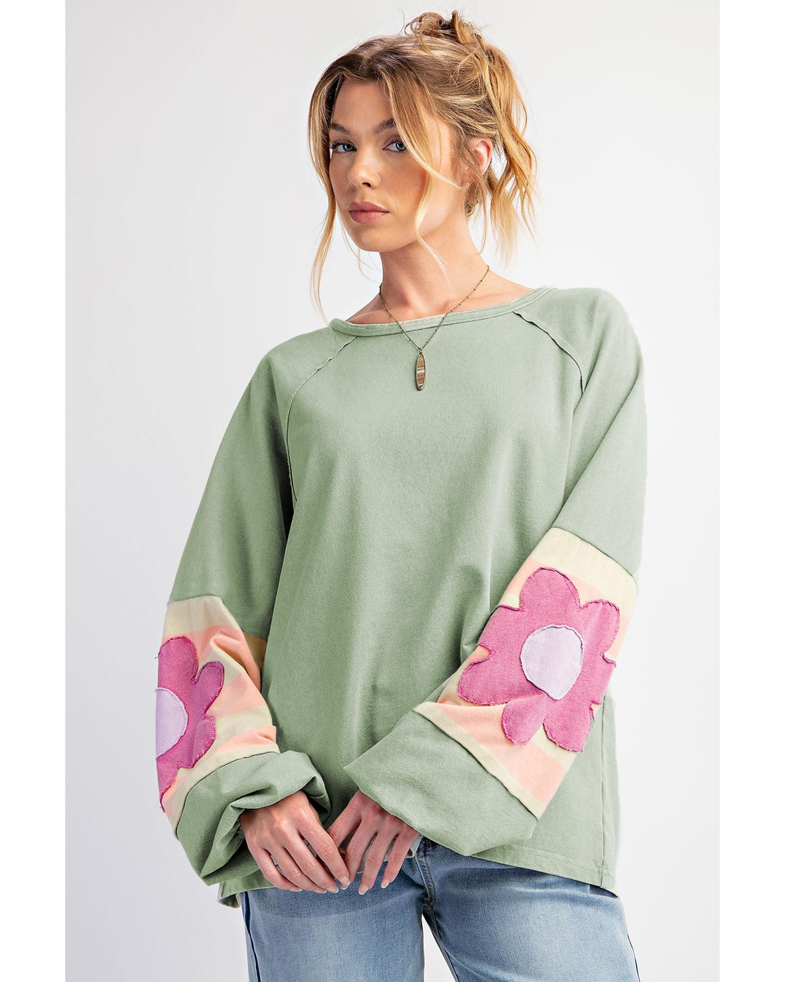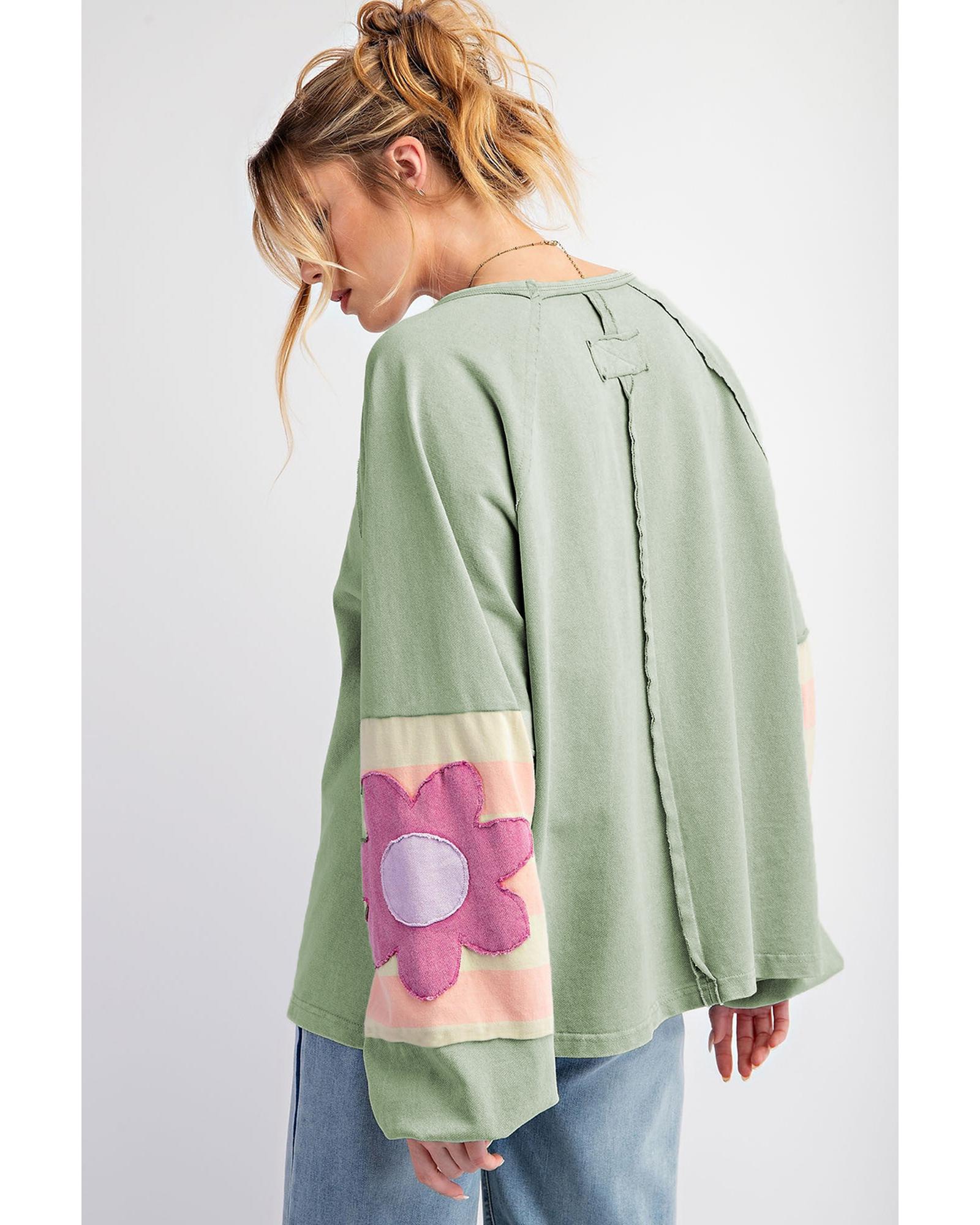 Smoke Green Flower Patchwork Raglan Sleeve Exposed Seam Oversized Top – L