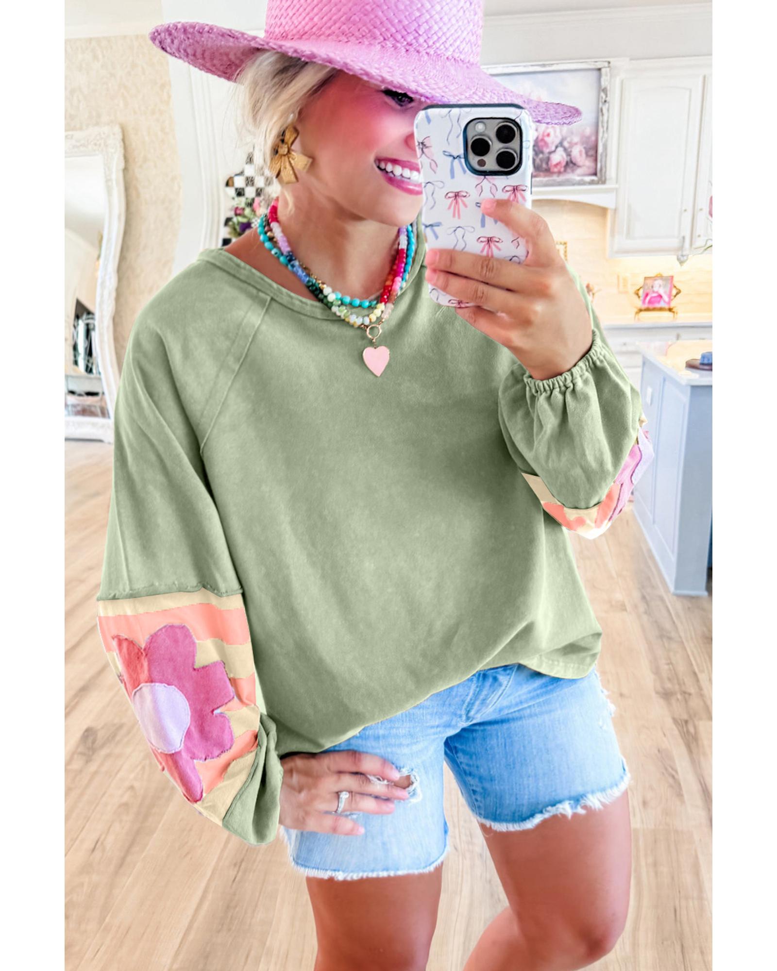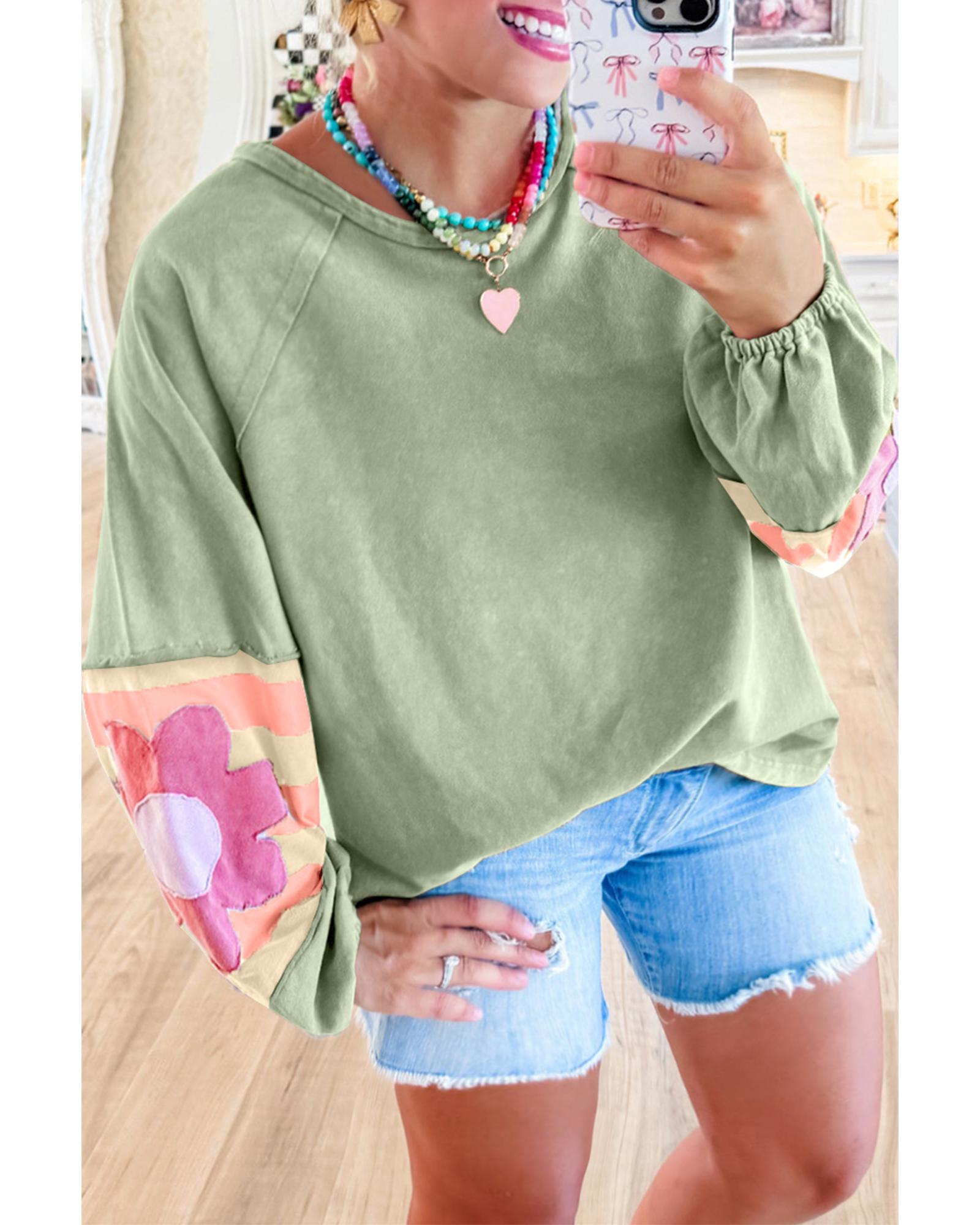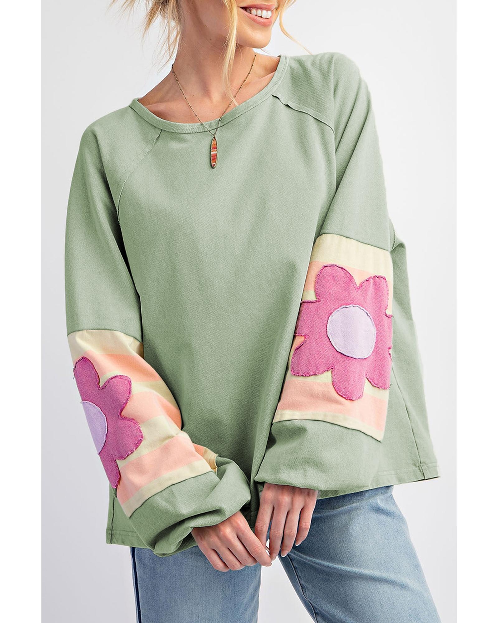 Smoke Green Flower Patchwork Raglan Sleeve Exposed Seam Oversized Top – L