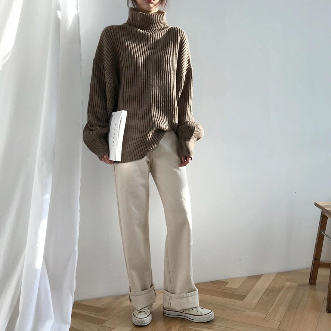 Solid Colour Turtleneck Outer Wear Pullover Casual Sweater Beige – Free Size – Beige Free Size