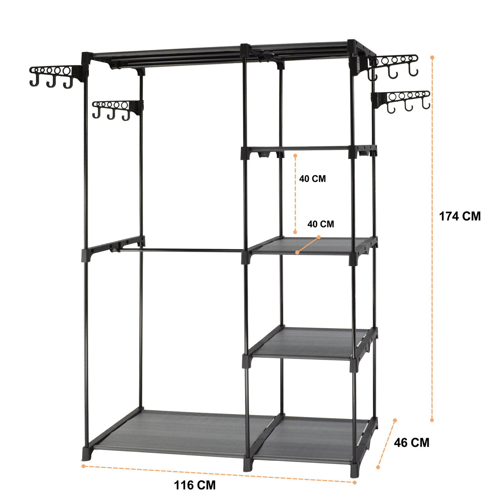Compact Multifunctionality: Measuring 46 cm (D) x 174 cm (H) x 116 cm (W), this rack fits effortlessly into laundry rooms, living areas, bedrooms, and closets, maximizing storage without taking up excess space.