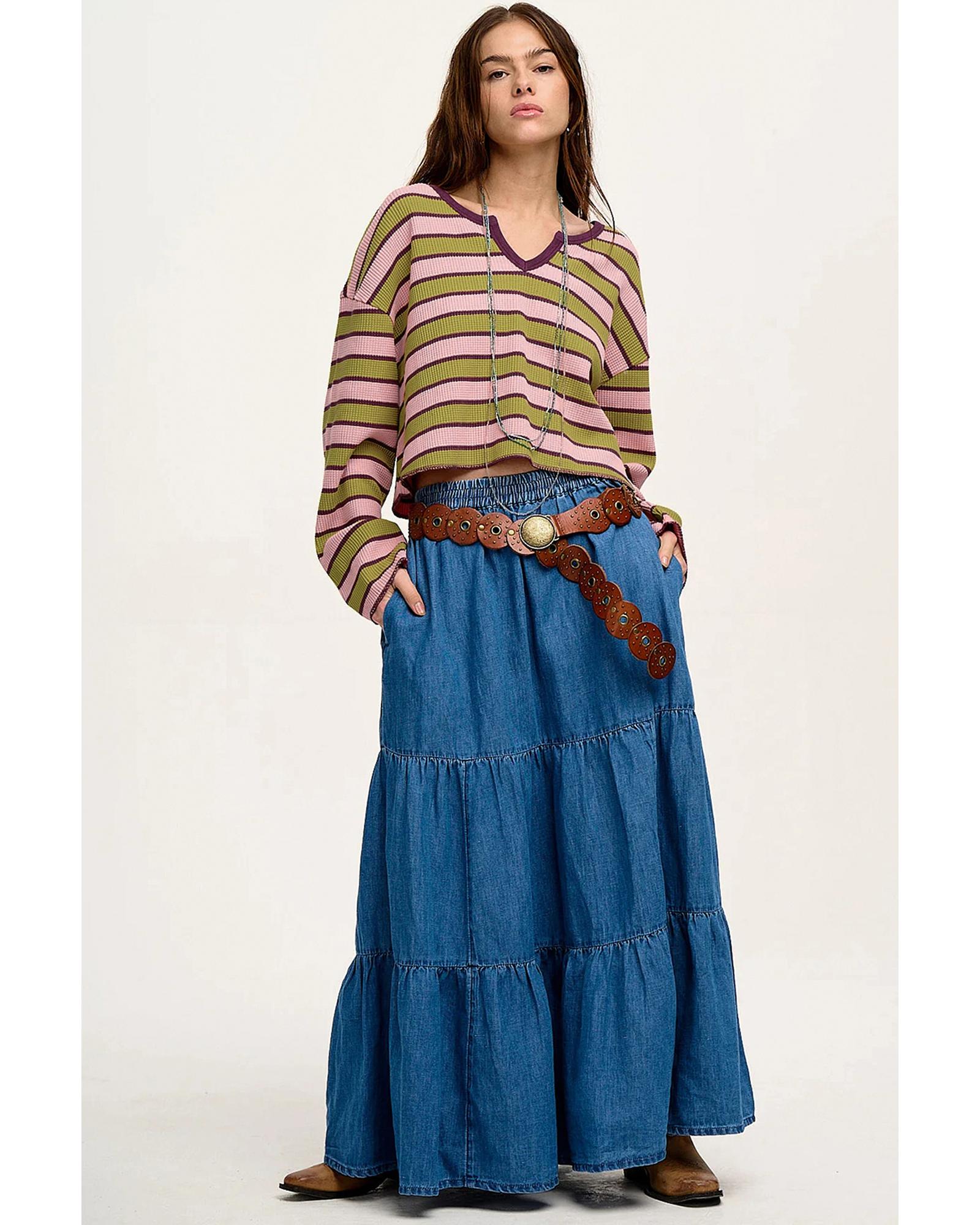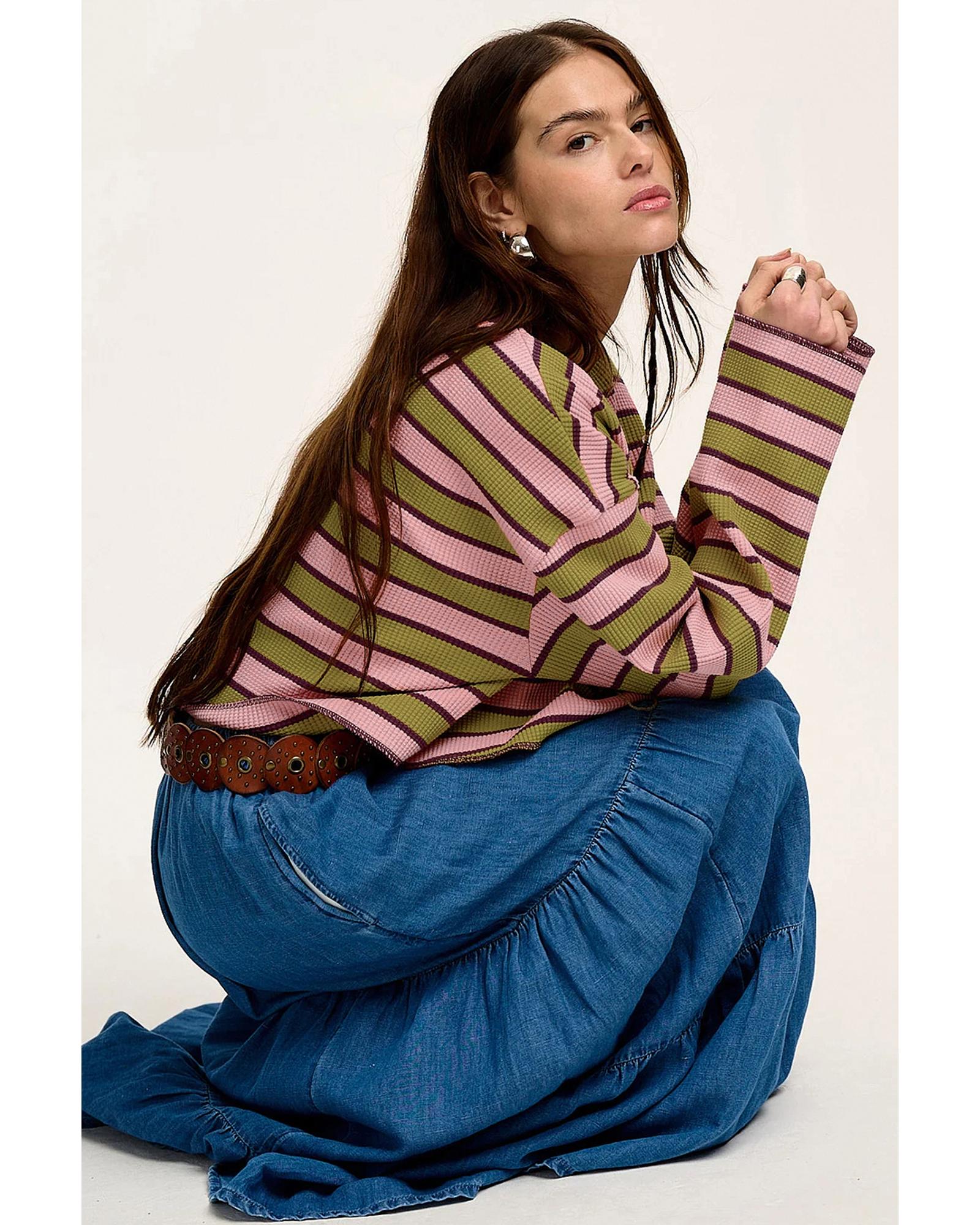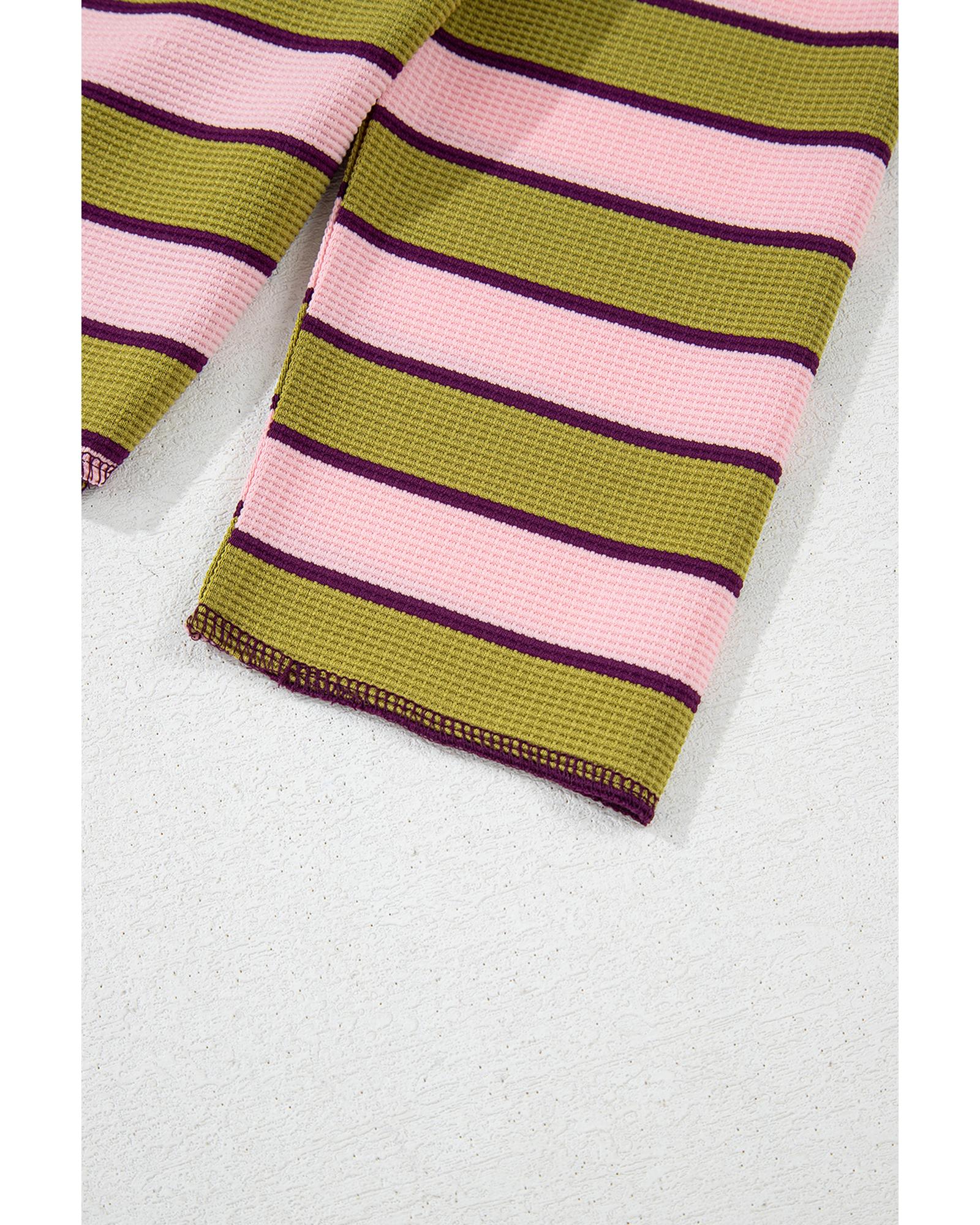 Spinach Green Clashing Stripes Waffle Texture Notched Neck Long Sleeve Top – S