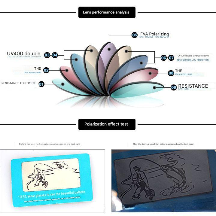 Enhance your vision and protect your eyes with these high-performance Sport Polarized Sunglasses. Featuring advanced multi-layer lens technology, these sunglasses offer total UV400 protection against harmful UVA and UVB rays. The core of the lens includes an FVA polarizing filter layer, flanked by reinforced polarized lenses and dual-layer UV400 protective films, all built upon a base layer of stress-resistant protective film. This sophisticated construction ensures superior glare reduction, enhanced clarity, and optimal eye protection. Ideal for driving, fishing, cycling, and various outdoor activities, these sunglasses provide a comfortable fit and a stylish, sporty look. A polarization test card is often included to demonstrate the effectiveness of the polarized lenses -C wear the glasses to see the hidden pattern on the card.