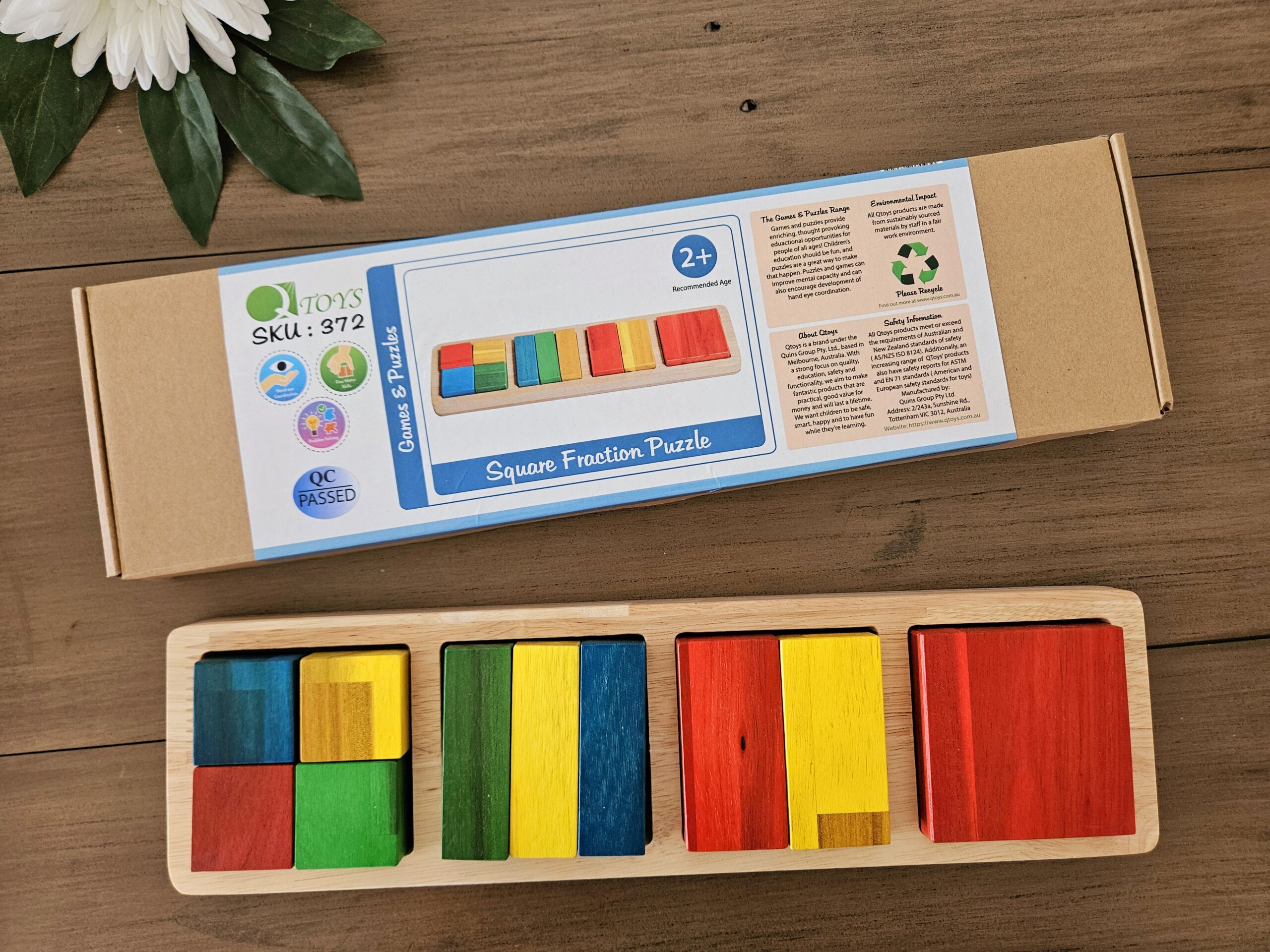 Introducing the Qtoys Square Fraction Puzzle—a beautifully crafted educational tool designed to make learning Math concepts both engaging and fun. This puzzle features a series of brightly coloured, wooden square pieces that fit together to form a complete square, with each piece representing a different fraction. From halves to quarters and smaller fractions, this puzzle offers a hands-on approach to understanding basic mathematical concepts while also introducing children to colours.