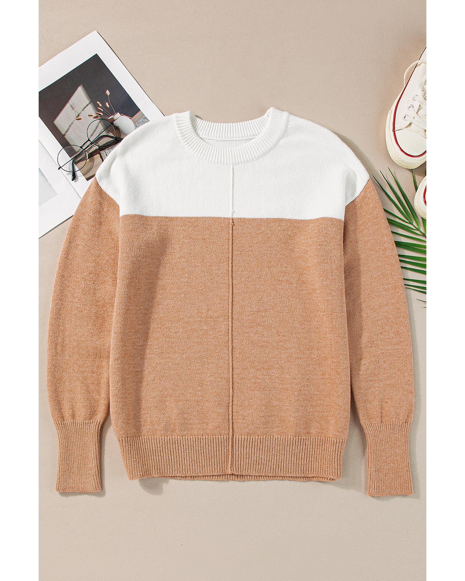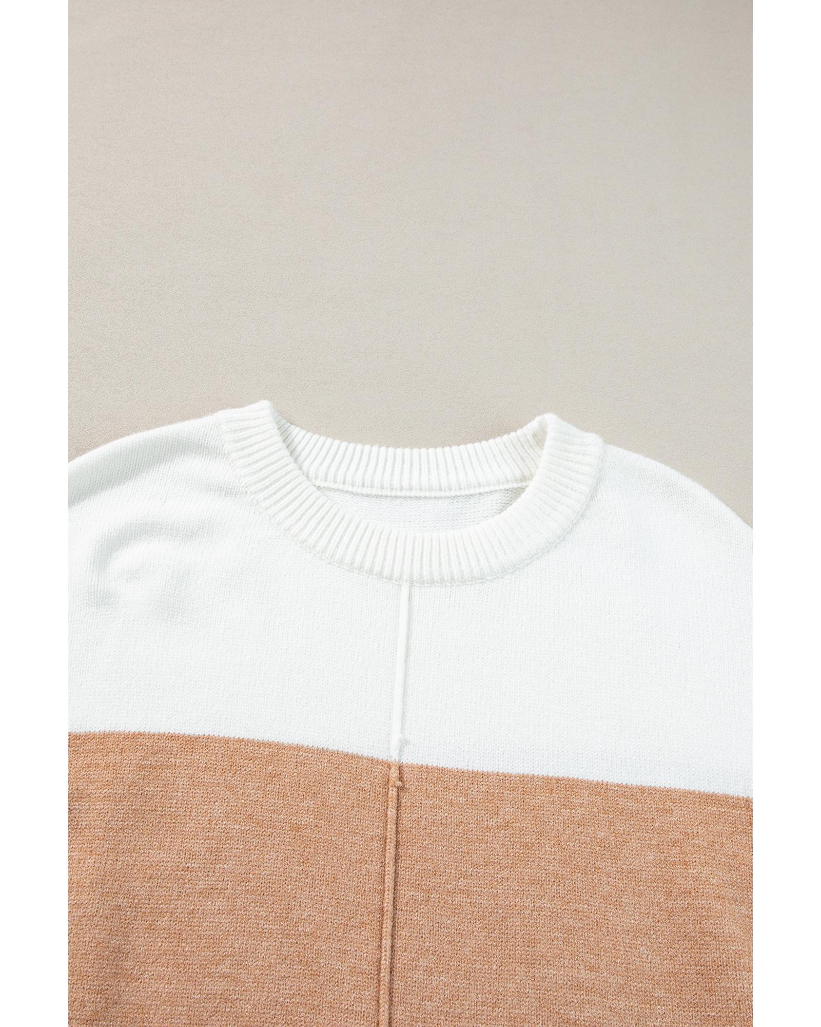Straw Yellow Colorblock Ribbed Trim Round Neck Sweater - S