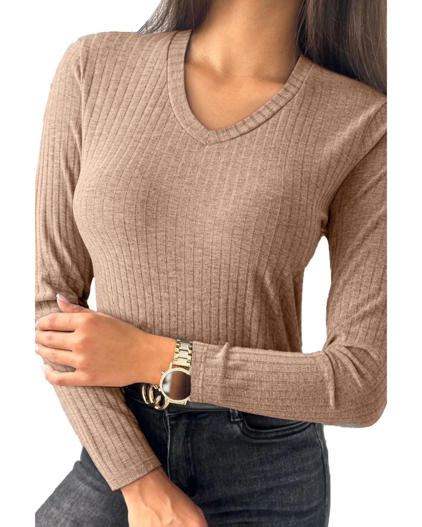 Straw Yellow Ribbed Knit V Neck Long Sleeve Slim Fit Top - XL